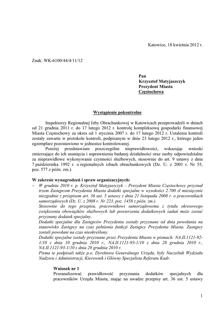 Katowice, 18 kwietnia 2012 r. Znak: WK-6100/44/4/11/12 Pan Krzysztof Matyjaszczyk Prezydent Miasta Częstochowa Wystąpienie pokontrolne Inspektorzy Regionalnej Izby Obrachunkowej w Katowicach przeprowadzili w dniach od 21 grudnia 2011 r. do 17 lutego 2012 r. kontrolę kompleksową gospodarki finansowej Miasta Częstochowy za okres od 1 stycznia 2007 r. do 17 lutego 2012 r. Ustalenia kontroli zostały zawarte w protokole kontroli, podpisanym w dniu 23 lutego 2012 r., którego jeden egzemplarz pozostawiono w jednostce kontrolowanej. PoniŜej przedstawiam poszczególne nieprawidłowości, wskazując wnioski zmierzające do ich usunięcia i usprawnienia badanej działalności oraz osoby odpowiedzialne za nieprawidłowe wykonywanie czynności słuŜbowych, stosownie do art. 9 ustawy z dnia 7 października 1992 r. o regionalnych izbach obrachunkowych (Dz. U. z 2001 r. Nr 55, poz. 577 z późn. zm.). W zakresie wynagrodzeń i spraw organizacyjnych: − W grudniu 2010 r. p. Krzysztof Matyjaszczyk – Prezydent Miasta Częstochowy przyznał trzem Zastępcom Prezydenta Miasta dodatki specjalne w wysokości 2.700 zł miesięcznie niezgodnie z przepisem art. 36 ust. 5 ustawy z dnia 21 listopada 2008 r. o pracownikach samorządowych (Dz. U. z 2008 r. Nr 223, poz. 1458 z późn. zm.). Stosownie do tego przepisu, pracownikowi samorządowemu z tytułu okresowego zwiększenia obowiązków słuŜbowych lub powierzenia dodatkowych zadań moŜe zostać przyznany dodatek specjalny. Dodatki specjalne dla Zastępców Prezydenta zostały przyznane od dnia powołania na stanowisko Zastępcy na czas pełnienia funkcji Zastępcy Prezydenta Miasta. Zastępcy zostali powołani na czas nieokreślony. Dodatki specjalne zostały przyznane przez Prezydenta Miasta w pismach: NA.II.1121-921/10 z dnia 10 grudnia 2010 r., NA.II.1121-93-1/10 z dnia 28 grudnia 2010 r., NA.II.1121-93-1/10 z dnia 28 grudnia 2010 r. Pisma te podpisali takŜe p.o. Dyrektora Generalnego Urzędu, były Naczelnik Wydziału Nadzoru i Administracji, Kierownik i Główny Specjalista Referatu Kadr. Wniosek nr 1 Przeanalizować prawidłowość przyznania dodatków specjalnych dla pracowników Urzędu Miasta, mając na uwadze przepisy art. 36 ust. 5 ustawy 1 z dnia 21 listopada 2008 r. o pracownikach samorządowych (Dz. U. z 2008 r. Nr 223, poz. 1458 z późn. zm.). − W okresie od 1 kwietnia 2010 do dnia zakończenia kontroli, tj. 17 lutego 2012 r., w Urzędzie Miasta Częstochowy funkcjonowały oddzielne stanowiska Sekretarza Miasta i Dyrektora Generalnego Urzędu Miasta, podległe bezpośrednio Prezydentowi Miasta, na których zatrudniono pracowników. Oddzielenie tych stanowisk przewidziano w zarządzeniu Prezydenta Miasta Częstochowy Nr k/120/10 z dnia 31 marca 2010 r. w sprawie zmiany Regulaminu Organizacyjnego Urzędu Miasta Częstochowy. W Regulaminach Wynagradzania pracowników Urzędu Miasta Częstochowy, wprowadzonych: • zarządzeniem Prezydenta Miasta Częstochowy Nr k/90/09 z dnia 30 czerwca 2009 r. w sprawie ustalenia regulaminu wynagradzania w Urzędzie Miasta Częstochowy, po zmianie wprowadzonej zarządzeniem Nr k/124/10 z dnia 20 maja 2010 r., • a następnie zarządzeniem Prezydenta Miasta Częstochowy Nr k/136/10 z dnia 16 lipca 2010 r. w sprawie ustalenia regulaminu wynagradzania w Urzędzie Miasta Częstochowy z późn. zm., określono minimalne wymagania kwalifikacyjne i poziom wynagrodzenia dla Dyrektora Generalnego Urzędu i Sekretarza Miasta, na tym samym poziomie. Przepisy ustawy z dnia 8 marca 1990 r. o samorządzie gminnym (Dz. U. z 2001 r. Nr 142, poz. 1591 z późn. zm.) oraz ustawy z dnia 21 listopada 2008 r. o pracownikach samorządowych (Dz. U. z 2008 r. Nr 223, poz. 1458 z późn. zm.) nie przewidują funkcjonowania stanowiska dyrektora generalnego urzędu równolegle ze stanowiskiem sekretarza. Ponadto, w rozporządzeniu Rady Ministrów z dnia 18 marca 2009 r. w sprawie wynagradzania pracowników samorządowych (Dz. U. z 2009 r. Nr 50, poz. 398 z późn. zm.) nie przewidziano stanowiska dyrektora generalnego urzędu i nie określono dla niego minimalnego wynagrodzenia zasadniczego i wymagań kwalifikacyjnych niezbędnych do wykonywania pracy. W związku z powyŜszym wprowadzenie odrębnego stanowiska Dyrektora Generalnego Urzędu wykraczało poza kompetencje Prezydenta Miasta. Zmiany organizacyjne polegające na wyodrębnieniu od 1 kwietnia 2010 r. stanowiska Dyrektora Generalnego Urzędu wprowadził p. Piotr Kurpios – pełniący funkcję Prezydenta Miasta Częstochowy. Od dnia 10 grudnia 2010 r. odpowiedzialny za prawidłowe zorganizowanie działalności Urzędu Miasta Częstochowy był p. Krzysztof Matyjaszczyk - Prezydent Miasta Częstochowy. Wniosek nr 2 Podjąć działania w celu dostosowania funkcjonujących w Urzędzie Miasta stanowisk pracowników do przepisów ustawy z dnia 21 listopada 2008 r. o pracownikach samorządowych (Dz. U. z 2008 r. Nr 223, poz. 1458 z późn. zm.) oraz postanowień rozporządzenia Rady Ministrów z dnia 18 marca 2009 r. w sprawie wynagradzania pracowników samorządowych (Dz. U. z 2009 r. Nr 50, poz. 398 z późn. zm.). − W styczniu 2011 r. dokonano wypłaty dodatków do wynagrodzeń za grudzień 2010 r. dla sześciu pracowników Urzędu Miasta. Wypłaty dokonano po terminie określonym w Regulaminie Wynagradzania pracowników Urzędu Miasta w Częstochowie, wprowadzonym zarządzeniem Prezydenta Miasta Częstochowy Nr k/136/10 z dnia 16 lipca 2010 r. w sprawie ustalenia regulaminu wynagradzania w Urzędzie Miasta 2 Częstochowy z późn. zm. oraz w Regulaminie Pracy Urzędu Miasta Częstochowy, wprowadzonym zarządzeniem Prezydenta Miasta Częstochowy Nr 31/04 z dnia 29 września 2004 r. z późn. zm. Zgodnie z postanowieniami tych zarządzeń, wynagrodzenie za pracę powinno być wypłacone najpóźniej do ostatniego dnia roboczego kaŜdego miesiąca. Naruszono tym przepis art. 44 ust. 3 pkt 3 ustawy z dnia 27 sierpnia 2009 r. o finansach publicznych (Dz. U. Nr 157, poz. 12