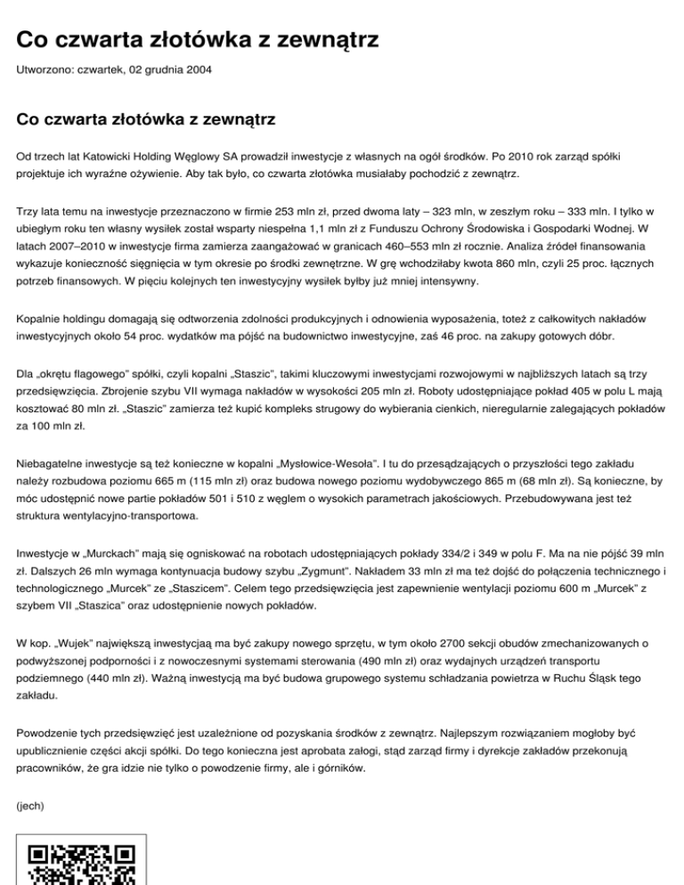 Co czwarta złotówka z zewnątrz Utworzono: czwartek, 02 grudnia 2004 Co czwarta złotówka z zewnątrz Od trzech lat Katowicki Holding Węglowy SA prowadził inwestycje z własnych na ogół środków. Po 2010 rok zarząd spółki projektuje ich wyraźne ożywienie. Aby tak było, co czwarta złotówka musiałaby pochodzić z zewnątrz. Trzy lata temu na inwestycje przeznaczono w firmie 253 mln zł, przed dwoma laty – 323 mln, w zeszłym roku – 333 mln. I tylko w ubiegłym roku ten własny wysiłek został wsparty niespełna 1,1 mln zł z Funduszu Ochrony Środowiska i Gospodarki Wodnej. W latach 2007–2010 w inwestycje firma zamierza zaangażować w granicach 460–553 mln zł rocznie. Analiza źródeł finansowania wykazuje konieczność sięgnięcia w tym okresie po środki zewnętrzne. W grę wchodziłaby kwota 860 mln, czyli 25 proc. łącznych potrzeb finansowych. W pięciu kolejnych ten inwestycyjny wysiłek byłby już mniej intensywny. Kopalnie holdingu domagają się odtworzenia zdolności produkcyjnych i odnowienia wyposażenia, toteż z całkowitych nakładów inwestycyjnych około 54 proc. wydatków ma pójść na budownictwo inwestycyjne, zaś 46 proc. na zakupy gotowych dóbr. Dla „okrętu flagowego” spółki, czyli kopalni „Staszic”, takimi kluczowymi inwestycjami rozwojowymi w najbliższych latach są trzy przedsięwzięcia. Zbrojenie szybu VII wymaga nakładów w wysokości 205 mln zł. Roboty udostępniające pokład 405 w polu L mają kosztować 80 mln zł. „Staszic” zamierza też kupić kompleks strugowy do wybierania cienkich, nieregularnie zalegających pokładów za 100 mln zł. Niebagatelne inwestycje są też konieczne w kopalni „Mysłowice-Wesoła”. I tu do przesądzających o przyszłości tego zakładu należy rozbudowa poziomu 665 m (115 mln zł) oraz budowa nowego poziomu wydobywczego 865 m (68 mln zł). Są konieczne, by móc udostępnić nowe partie pokładów 501 i 510 z węglem o wysokich parametrach jakościowych. Przebudowywana jest też struktura wentylacyjno-transportowa. Inwestycje w „Murckach” mają się ogniskować na robotach udostępniających pokłady 334/2 i 349 w polu F. Ma na nie pójść 39 mln zł. Dalszych 26 mln wymaga kontynuacja budowy szybu „Zygmunt”. Nakładem 33 mln zł ma też dojść do połączenia technicznego i technologicznego „Murcek” ze „Staszicem”. Celem tego przedsięwzięcia jest zapewnienie wentylacji poziomu 600 m „Murcek” z szybem VII „Staszica” oraz udostępnienie nowych pokładów. W kop. „Wujek” największą inwestycjaą ma być zakupy nowego sprzętu, w tym około 2700 sekcji obudów zmechanizowanych o podwyższonej podporności i z nowoczesnymi systemami sterowania (490 mln zł) oraz wydajnych urządzeń transportu podziemnego (440 mln zł). Ważną inwestycją ma być budowa grupowego systemu schładzania powietrza w Ruchu Śląsk tego zakładu. Powodzenie tych przedsięwzięć jest uzależnione od pozyskania środków z zewnątrz. Najlepszym rozwiązaniem mogłoby być upublicznienie części akcji spółki. Do tego konieczna jest aprobata załogi, stąd zarząd firmy i dyrekcje zakładów przekonują pracowników, że gra idzie nie tylko o powodzenie firmy, ale i górników. (jech)