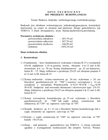 OPIS TECHNICZNY DO PROJEKTU BUDOWLANEGO Temat: Budowa budynku technologicznego wielofunkcyjnego Budynek jest obiektem wolnostojącym, jednokondygnacyjnym, konstrukcji murowanej, na części ze stropem nad parterem. Stropy gęstożebrowy typ TERIVA –I. Dach dwuspadowy, kryty blachą dachówkową powlekaną. Parametry techniczne obiektu : - powierzchnia zabudowy - powierzchnia całkowita - powierzchnia użytkowa - kubatura - 207,79 m2 - 207,79 m2 - 168,99 m2 - 1055,54 m3 Dane techniczne obiektu 1. Konstrukcja 1.1.Fundamenty – ławy fundamentowe wykonane z betonu B-15 o wymiarach 65x30, zagłębione 1,10 m poniżej terenu, zbrojone 4 φ 12 stal A-III, strzemiona φ 6 co 30 cm. Ściany fundamentowe – gr. 25 cm betonowe, beton B – 15. Słupy żelbetowe o przekroju 25x25 cm zbrojone prętami 4 φ 12 stal A-III, beton B-15 1.2.Ściany nadziemia – ściana warstwowa gr. 36 cm, wykonana z 24 cm bloczków gazobetonowych kl. "700" ( warstwa wewnętrzna ), 12 cm ocieplenia z styropianu. Współczynnik k=0.25 W/m2K < kdop=0,30 W/m2K. Nadproża nad otworami okiennymi i drzwiowymi typu LN-19. Słupy żelbetowe o przekroju 25x25 cm zbrojone prętami 4 φ 12 stal A-III, beton B-15 1.3.Ściany wewnętrzne konstrukcyjne gr. 25 cm wykonane z bloczków gazobetonowych kl. "700" lub cegły pełnej ceramicznej lub silikatowej kl."150" na zaprawie cem-wap. m "50". 1.4.Ścianki działowe gr. 6 i 12 cm z bloczków betonu komórkowego lub z cegły dziurawki na zaprawie cem-wap. m "50". 1.5.Komin - z cegły ceramicznej kl. "100" na zaprawie cem-wap. m "50" kanały 14x14 cm. 1.6.Strop – nad parterem – gęstożebrowy typ TERIVA –I. (strop wykonać zgodnie z wymaganiami technicznymi dla stropów Teriva). Wieńce żelbetowe wylewane z betonu B-15 o wymiarach 25 x 25 cm zbrojonych prętami φ 12 stal A-III, strzemionami φ 6 co 20 cm stal A-O. 1.7.Dach dwuspadowy o kącie spadków 70 % , konstrukcji drewnianej. Elementy dachu: krokwie 7x16, jętki 2x3,8x16 cm, murłaty 14 x14 cm, łaty i kontrłaty 5x5 cm. Pokrycie blachą dachówkową powlekaną. Drewno więźby zaimpregnować koncentratem "INTOX" oraz "PYROLAKIEM 10" 1.8.Wiata stalowa wykonana z profili zamkniętych, kryta blachą dachówkową powlekaną. Łaty zaimpregnować koncentratem "INTOX" oraz "PYROLAKIEM 10" 2. Stan wykończenia wewnętrznego. 2.1.Tynki –cementowo-wapienne kat.III, 2.2. W pomieszczeniach bez stropów teriva – sufit z płyt g-k wodoodpornych na ruszcie stalowym przymocowanym do konstrukcji dachu. Od strony pomieszczenia izolacja wykonana z folii paroszczelnej. Od strony pokrycia dachu izolacja przeciwwiatrowa z wysokoparoprzepuszczalnej membrany dachowej. Izolacja termiczna wykonana z wełny mineralnej szklanej na całej wysokości krokwi oraz rusztu stalowego. 2.3.Podłogi, posadzki i wykończenie ścian: Pomieszczenie pras. Ściany do wysokości 2,5m wyłożone glazurą. Powyżej pomalowane farbą emulsyjną. Posadzka wyłożona gresem. Pomieszczenie dmuchaw. Ściany do sufitu pomalowane farbą zmywalną. Posadzka wyłożona gresem Pomieszczenie rozdzielni elektrycznej. Ściany pomalowane farbą emulsyjną. Posadzka betonowa W.C. i łazienka Ściany do sufitu wyłożone glazurą. Posadzka wyłożona terakotą. Pomieszczenie magazynowo -gospodarcze. Ściany do sufitu pomalowane farbą zmywalną. Posadzka wyłożona gresem. Przy zlewie i umywalce na ścianie fartuch z glazury Pomieszczenie dyspozytora i pom. socjalne. Ściany do sufitu pomalowane farbą emulsyjną. Posadzka wyłożona wykładziną tarket lub panelami. Przy zlewie i umywalce na ścianie fartuch z glazury Wiatrołap i korytarz. Ściany do sufitu pomalowane farbą zmywalną. Posadzka wyłożona gresem. Pomieszczenie na agregat prądotwórczy. Ściany do wysokości 2,5m wyłożone glazurą. Posadzka wyłożona gresem. Drzwi w dolnej części na całej szerokości wyposażone w kratę nawiewną i żaluzję. W stropie wykonać rurę fi 100mm izolowaną na wyrzut spalin z agregatu. Wysokość rury ponad dach - 1m. W przestrzeni stropodachu rurę spalinową obudować cegłą pełną czerwoną na zaprawie cementowej. Dodatkowo wykonać w stropie i dachu twór na wywietrzak dachowy ∅315mm. Pomieszczenie szatni. Ściany pomalowane farbą zmywalną. Posadzka wyłożona wykładziną tarket. Pomieszczenie magazynowe. Ściany do wysokości 2,5m wyłożone glazurą . Posadzka wyłożona gresem. Sufity w wszystkich pomieszczeniach malowane farbą emulsyjna 3. Stan wykończenia zewnętrznego . 3.1.Cokół budynku – tynk mozaikowy 3.2.Tynki zewnętrzne – tynk cienkowarstwowy na bazie żywicy akrylowej o fakturze „kornik’ lub „baranek”. 3.3.Stolarka okienna – PCV - typowa. 3.4.Stolarka drzwiowa wewnętrzna – drewniana – typowa. Drzwi zewnętrzne stalowe, ocieplone. 3.5.Obróbki blacharskie z blachy powlekanej 3.6.Kominy - otynkowane, tynk wap-cem. kat. III lub wykonane z cegły klinkierowej. 3.7.Rynny i rury spustowe z PVC . 3.8.Opaska wokół budynku z kostki betonowej o szer. 40 cm 4. Izolacje 4.1.Izolacje przeciwwilgociowe: - Poziome - 2 x papa izolacyjna Nr 500 na lepiku asfaltowym, posadzka parteru – papa asfaltowa na lepiku lub folia budowlana gr. 0,2 mm - Pionowe : ściany fundamentowe ocieplone od zewnątrz styropianem gr 12 cm, zaizolowanym z zewnątrz folią izolacyjną tłoczoną 4.2.Izolacje termiczne – ścian zewnętrzne : styropian gr 12 cm - strop nad parterem : wełna mineralna grub. 20 cm. 5. Instalacje Budynek wyposażony będzie w instalację : - technologiczną wodociągową kanalizacyjną wentylacji mechanicznej i grawitacyjnej elektryczną