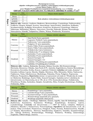 Harmonogram wywozu odpadów wielkogabarytowych z zabudowy wielorodzinnej (wielokondygnacyjnej) z terenu Miasta Chełm w 2017 r. przez Miejskie Przedsiębiorstwo Gospodarki Komunalnej Sp. z o.o. w Chełmie ODPADY NALEśY DOSTARCZYĆ NA MIEJSCE ZBIÓRKI W GODZ. 700-1300 Miesiąc Rejon 1 Marzec Czerwiec Wrzesień Grudzień Data wywozu 2 2 4 4 Miejsce zbiórki odpadów Brak zabudowy wielorodzinnej (wielokondygnacyjnej) Dotyczy ulic: Astrowa, Azaliowa, Bratkowa, Brzozowskiego, Czernickiego, Farbiszewskiej, Fiołkowa, Glogera, Hempel, Irysowa, Janowskiego, Jaraczewskiej, Jaśminowa, Kaflarska, Kochanowskiego, Kołłątaja, Konwaliowa, Krańcowa, Krokusowa, Kunickiego, Makowa, Malowane, Medyńskiej, Mimozy, Narcyzowa, Norwida, Puławska, RóŜana, Rzewuskiego, Storczykowa, Szarotki, Tulipanowa, Ułanów, Witosa, Włodawska, Wrzosowa. Miesiąc Data wywozu Miejsce zbiórki odpadów Jana Pawła II przy garaŜach, Legionów Polskich 2 przy pojemnikach, Nadrzeczna 7 przy pojemniku, Podgórze 2C przy pojemniku, Czerwiec 5 Synów Pułku 20 przy pojemnikach, Synów Pułku 9 przy pojemnikach, Trubakowska 4 przy kontenerze, Wrzesień 5 Trubakowska 57 za sklepem Gama, Zachodnia 33 przy pojemnikach, Zachodnia 45 przy pojemnikach, Szarych Szeregów 7C Grudzień 5 Szarych Szeregów 11C Lubelska 139 parking przy pojemnikach Lubelska 135 parking przy Caritasie Dotyczy ulic: Andersa, Bednarska, Bociania, Bohusz-Szyszko, Bór-Komorowskiego, Browarna, Brzozowa, Chłodna, Jana Pawła II Pl., Janówka, Kąpieliskowa, Kmicic-Skrzyńskiego, Koszarowa, Kowalska, Krótka, Krucza, Legionów Polskich, Lubelska (od ronda „Kamena” w kierunku Lublina), Łączna, Maczka, Majdan, Miernicza, Miła, Młynarska, Mokra, Nadrzeczna, Nadtorowa, Niska, Odorkiewicza, Okulickiego, Piekarska, Piwna, Podgórze, Poprzeczna, Północna, Przejazdowa, Rejowiecka (strona z nr parzystymi od ronda ul. Włodawska do ronda ul. Bieławin), Skalskiego, Synów Pułku, Szarych Szeregów, Szpitalna (od ul. Lubelskiej do skrzyŜowania z ul. Rejowiecką; do nr 19E, do nr 12N), Szymczakowskiego, Trubakowska, Wierzbowa, Wodna, Zachodnia, Zakątek, Zawadówka, Złota, Związku Strzeleckiego, Źródlana, śołnierska, śabia. Marzec 3 Rejon 2 Data Miejsce zbiórki odpadów wywozu Kurpińskiego 3 przy pojemniku, Marzec 6 Lutosławskiego 9 przy pojemniku , Czerwiec 6 Szymanowskiego 15 przy pojemnikach, Wrzesień 6 Wieniawskiego pojemniki przy garaŜach, Grudzień 6 Wirskiego pojemniki obok poczty Dotyczy ulic: Asnyka , Chrobrego, Dąbrówki, Elsnera, Jagiełły, Jana III Sobieskiego, Jordana, Karłowicza, Kasztanowa, Kazimierza Wielkiego, Kurpińskiego, Kwiatowa, Lipowa, Lutosławskiego, Lwowska (od skrzyŜowania z I AWP do końca), Łabędzia, Malinowa, Metalowa, Mieszka I, Niemcewicza, Nowowiejskiego, Ogrodowa (od skrzyŜowania z A.K. do końca), Orląt Lwowskich, Piramowicza, Poległych, Polna, Pszenna, Rodziewiczówny, Rusałki, 15 Sierpnia, Skowronkowa, Słowicza, Stanisławskiej, Szpakowa, Sztembis, Szymanowskiego, Św. Jadwigi Królowej, Wieniawskiego, Wirskiego, Wiśniowa, Wolskiej, śarnowskiego, śeglarska, śółkiewskiego, śurawia. Miesiąc Rejon 3 Miesiąc Data wywozu Miejsce zbiórki odpadów I AWP 3 obok pojemników (oś. Koniczynka), 3 Maja 6 obok pojemników, Lwowska 81 za sklepem Gama, Czerwiec 7 Połaniecka 2 parking przy wymiennikowni, Wrzesień 7 Wojsławicka 18 za wymiennikownią (SM Odrodzenie), Wolności przy administracji, Grudzień 7 Kosynierów parking przy Wspólnocie Dotyczy ulic: Baczyńskiego, Bazylany, Bema, Berezeckiego, Braci Gierymskich, Brzechwy, Czartoryskiego, Dąbrowskiego, Droga Męczenników, Grota Roweckiego, Grottgera, Hrubieszowska, Jaworskiego, Kosynierów, Langiewicza, Lotnicza, 3 Maja, Małachowskiego, Mościckiego, Mrozka, Nowy Świat, Paderewskiego, Plater, Podborcze, Pogodna, Połaniecka, Południowa, Poniatowskiego, Potockich, Powstańców Warszawy, Reytana, Sejmu Czteroletniego, Sikorskiego, Skorupki, Słoneczna, Sowińskiego, Sucharskiego, Tęczowa Traugutta, Tuzinek, Wiercieńskiego, Wojsławicka, Wolności, Wybickiego. Marzec 7 Rejon 4 Rejon 5 Data Miejsce zbiórki odpadów wywozu Marzec 8 Czerwiec 8 Brak zabudowy wielorodzinnej (wielokondygnacyjnej) Wrzesień 8 Grudzień 8 Dotyczy ulic: Botaniczna, Cisowa, Górna, Grunwaldzka, Jałowcowa, Janczykowskiego, Jesienna, Jodłowa, Kilińskiego, Kornasa, Leśna, Letnia, Litewska, Łowiecka, Matejki, Modrzewiowa, Myśliwska, Niecała, Ogrodnicza, Piastowska, Piękna, Prusa, Pszczela, Racławicka, Sosnowa, Spacerowa, Szczęśliwa, Urocza, Wiosenna, Zimowa, śeromskiego. Rejon 6 Data Miejsce zbiórki odpadów wywozu Marzec 9 11 Listopada 2A przy pojemnikach, Kamieńskiego 1 parking, Czerwiec 9 Kredowa 11 przy kontenerze, Wrzesień 11 Piotra Skargi parking przy MPC Grudzień 11 Dotyczy ulic: Ambroziewicza, Antonin, Babinicza, Brzóski, Cementowa, Chomentowskiego, Dąbka, Dembowskiego, Eliaszczuka, Gajowa, Górnicza, Hołyszowej, Jagiellońska, Jaworowa, Kamieńskiego, Klonowa, Koszykowa, Kredowa, 11 Listopada, Muzyki, Pierackiej, Przemysłowa, Reja, Rolnicza, Skargi, Skibińskiego, Sonnego, Szpotańskiego, Świerkowa, Twardzika, Wileńska, Wolwinów, Wołyńska, Zajączka. Miesiąc Miesiąc Miesiąc Data wywozu Miejsce zbiórki odpadów Rejon 7 I Pułku SzwoleŜerów przy ujęciu wody, Batorego za sklepem Gama, Bydgoska 1 przy pojemnikach , Marzec 10 Graniczna 16 przy pojemnikach, Jana Kazimierza parking, Jedność przy pojemnikach Wołyńska 3, Kinczyka 1 przy pojemnikach, Kolejowa 92 przy administracji CHSM, Kolejowa przy MOPR, Reymonta 3 przy pojemnikach, Czerwiec 12 Słowackiego - Plac 1000-lecia parking, Wiejska 26 parking przy administracji, I AWP 11 przy Biedronce, Armii Krajowej 23 przy pojemnikach, Kopernika 25 parking, Krzywa parking przy SM Starówka, Wrzesień 12 Lubelska 66 za Barem Staromiejskim, Mickiewicza 7 plac pomiędzy Mickiewicza 15-17, Mickiewicza 7 obok kontenera, Mickiewicza parking przy Sienkiewicza, Pijarska przy skrzyŜowaniu z Krzy
