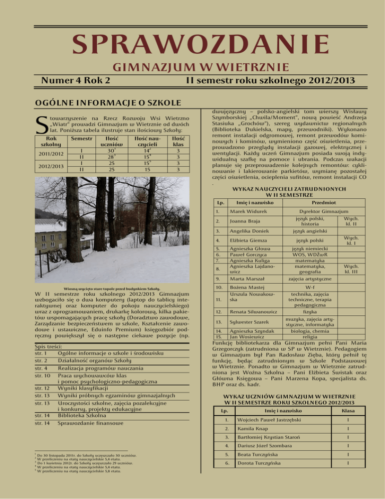 SPRAWOZDANIE GIMNAZJUM W WIETRZNIE Numer 4 Rok 2 II semestr roku szkolnego 2012/2013 OGÓLNE INFORMACJE O SZKOLE S towarzyszenie na Rzecz Rozwoju Wsi Wietrzno „Wiatr” prowadzi Gimnazjum w Wietrznie od dwóch lat. Poniższa tabela ilustruje stan ilościowy Szkoły: Rok szkolny 2011/2012 2012/2013 Semestr I II I II Ilość uczniów 1 30 3 28 25 25 Ilość nauczycieli 2 14 4 15 5 15 15 Ilość klas 3 3 3 3 dwujęzyczny – polsko-angielski tom wierszy Wisławy Szymborskiej „Chwila/Moment”, nową powieść Andrzeja Stasiuka „Grochów”), szereg wydawnictw regionalnych (Biblioteka Dukielska, mapy, przewodniki). Wykonano remont instalacji odgromowej, remont przewodów kominowych i kominów, wymieniono część oświetlenia, przeprowadzono przeglądy instalacji gazowej, elektrycznej i wentylacji. Każdy uczeń Gimnazjum posiada swoją indywidualną szafkę na pomoce i ubrania. Podczas wakacji planuje się przeprowadzenie kolejnych remontów: cyklinowanie i lakierowanie parkietów, wymianę pozostałej części oświetlenia, ocieplenia sufitów, remont instalacji CO . WYKAZ NAUCZYCIELI ZATRUDNIONYCH W II SEMESTRZE Lp. Imię i nazwisko Marek Widurek 2. Joanna Braja 3. Angelika Doniek język polski, historia język angielski 4. Elżbieta Giemza język polski 5. 6. 7. Agnieszka Głowa Paweł Gorczyca Agnieszka Kuliga Agnieszka Lajdanowicz 8. Wiosną wycięto stare topole przed budynkiem Szkoły. W II semestrze roku szkolnego 2012/2013 Gimnazjum wzbogaciło się o dwa komputery (laptop do tablicy interaktywnej oraz komputer do pokoju nauczycielskiego) wraz z oprogramowaniem, drukarkę kolorową, kilka pakietów wspomagających pracę szkoły (Doradztwo zawodowe, Zarządzanie bezpieczeństwem w szkole, Kształcenie zawodowe i ustawiczne, Eduinfo Premium) księgozbiór podręczny powiększył się o następne ciekawe pozycje (np. Spis treści: str. 1 Ogólne informacje o szkole i środowisku str. 2 Działalność organów Szkoły str. 4 Realizacja programów nauczania str. 10 Praca wychowawców klas i pomoc psychologiczno-pedagogiczna str. 12 Wyniki klasyfikacji str. 13 Wyniki próbnych egzaminów gimnazjalnych str. 13 Uroczystości szkolne, zajęcia pozalekcyjne i konkursy, projekty edukacyjne str. 14 Biblioteka Szkolna str. 14 Sprawozdanie finansowe 1 Do 30 listopada 2011r. do Szkoły uczęszczało 30 uczniów. W przeliczeniu na etaty nauczycielskie 5,4 etatu. Do 1 kwietnia 2012r. do Szkoły uczęszczało 29 uczniów. 4 W przeliczeniu na etaty nauczycielskie 5,4 etatu. 5 W przeliczeniu na etaty nauczycielskie 5,8 etatu. 2 3 Przedmiot 1. Dyrektor Gimnazjum język niemiecki WOS, WDŻwR matematyka matematyka, geografia 9. Marta Marszał zajęcia artystyczne 10. 11. Bożena Mastej Urszula Nowakowska 12. Renata Silwanowicz W-f technika, zajęcia techniczne, terapia pedagogiczna fizyka 13. Sylwester Szarek 14. 15. Agnieszka Szyndak Jan Wosiewicz Wych. kl. II Wych. kl. I Wych. kl. III muzyka, zajęcia artystyczne, informatyka biologia, chemia religia Funkcję bibliotekarza dla Gimnazjum pełni Pani Maria Grzegorczyk (zatrudniona w SP w Wietrznie). Pedagogiem w Gimnazjum był Pan Radosław Zięba, który pełnił tę funkcję, będąc zatrudnionym w Szkole Podstawowej w Wietrznie. Ponadto w Gimnazjum w Wietrznie zatrudniona jest Woźna Szkolna – Pani Elżbieta Świstak oraz Główna Księgowa – Pani Marzena Kopa, specjalista ds. BHP oraz ds. kadr. WYKAZ UCZNIÓW GIMNAZJUM W WIETRZNIE W II SEMESTRZE ROKU SZKOLNEGO 2012/2013 Lp. Imię i nazwisko 1. Wojciech Paweł Jastrzębski Klasa I 2. Kamila Knap I 3. Bartłomiej Krystian Staroń I 4. Dariusz Józef Szombara I 5. Beata Turczyńska I 6. Dorota Turczyńska I SPRAWOZDANIE z II semestru roku szkolnego 2012/2013 2 7. Wojciech Wierdak I 17. Paweł Szombara II 8. Paulina Weronika Bossekota II 18. Aleksandra Rozalia Szpiech II III 9. Monika Maria Dziadowicz II 19. Krystian Jan Bogacz 10. Weronika Katarzyna Dziadowicz II 20. Agnieszka Małgorzata Frankowicz III 21. Dawid Tomasz Sosiński III III 11. Piotr Michał Godek II 12. Aleksandra Jaracz II 22. Jakub Mateusz Świstak 13. Grzegorz Piotr Mazur II 23. Daniel Jakub Wdowiarz III II 24. Karolina Iwona Wierdak III 25. Szymon Zborowski III 14. Sylwia Elwira Mazur 15. Kacper Mateusz Ochała II 16. Dominik Przystasz II DZIAŁALNOŚĆ ORGANÓW SZKOŁY R ada Pedagogiczna Odbyło się 4 posiedzenia Rady Pedagogicznej: dwa klasyfikacyjne oraz dwa plenarne. Rada Pedagogiczna realizuje swoje cele statutowe: m.in. zaopiniowała organizację szkoły w roku szkolnym2013/2014 oraz zatwierdziła wyniki klasyfikacji. Dzień Seniora 2013 Zespoły Samokształceniowe nauczycieli poszczególnych przedmiotów spotykają się regularnie. ZESPÓŁ NAUCZYCIELI PRZEDMIOTÓW HUMANISTYCZNYCH pracuje w składzie: • Joanna Braja – j. polski, historia; • Angelika Doniek – j. angielski; • Elżbieta Giemza – j. polski, biblioteka; • Agnieszka Głowa – j. niemiecki; • Paweł Gorczyca – wiedza o społeczeństwie; • Bożena Mastej – wychowanie fizyczne; • Sylwester Szarek – muzyka, zajęcia artystyczne; • Marta Marszał – zajęcia artystyczne; • Ks. Józef Wosiewicz – religia. Nauczyciele przedmiotów humanistycznych realizowali powyższe cele w drugim półroczu bieżącego roku szkolnego poprzez: a) wymianę materiałów dydaktycznych, podręczników, scenariuszy, testów egzaminacyjnych według nowych zasad egzaminowania między nauczycielkami j. polskiego, b) przypomnienie nowych zasad przeprowadzania i organizacji egzaminów gimnazjalnych, kodowania arkuszy, opisywania kopert z pracami itp.; c) analizę zrealizowanych zadań wynikających z planu pracy szkoły, programu profilaktycznego oraz wychowawczego; d) organizację występu Grupy Artystycznej Rekonstrukto z programem pt. „Staropolski sarmatyzm i epoka szlachecka”; e) przygotowanie uroczystości szkolnych i środowiskowych – Dnia Seniora, Kiermaszu Wielkanocnego, akademii z okazji Święta Konstytucji, Dnia Niemieckiego oraz Dnia Am