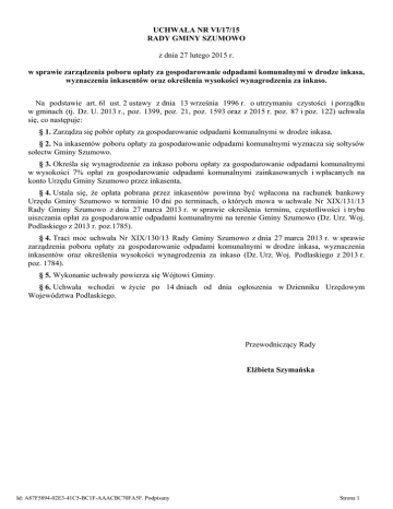 UCHWAŁA NR VI/17/15 RADY GMINY SZUMOWO z dnia 27 lutego 2015 r. w sprawie zarządzenia poboru opłaty za gospodarowanie odpadami komunalnymi w drodze inkasa, wyznaczenia inkasentów oraz określenia wysokości wynagrodzenia za inkaso. Na podstawie art. 6l ust. 2 ustawy z dnia 13 września 1996 r. o utrzymaniu czystości i porządku w gminach (tj. Dz. U. 2013 r., poz. 1399, poz. 21, poz. 1593 oraz z 2015 r. poz. 87 i poz. 122) uchwala się, co następuje: § 1. Zarządza się pobór opłaty za gospodarowanie odpadami komunalnymi w drodze inkasa. § 2. Na inkasentów poboru opłaty za gospodarowanie odpadami komunalnymi wyznacza się sołtysów sołectw Gminy Szumowo. § 3. Określa się wynagrodzenie za inkaso poboru opłaty za gospodarowanie odpadami komunalnymi w wysokości 7% opłat za gospodarowanie odpadami komunalnymi zainkasowanych i wpłacanych na konto Urzędu Gminy Szumowo przez inkasenta. § 4. Ustala się, że opłata pobrana przez inkasentów powinna być wpłacona na rachunek bankowy Urzędu Gminy Szumowo w terminie 10 dni po terminach, o których mowa w uchwale Nr XIX/131/13 Rady Gminy Szumowo z dnia 27 marca 2013 r. w sprawie określenia terminu, częstotliwości i trybu uiszczania opłat za gospodarowanie odpadami komunalnymi na terenie Gminy Szumowo (Dz. Urz. Woj. Podlaskiego z 2013 r. poz.1785). § 4. Traci moc uchwała Nr XIX/130/13 Rady Gminy Szumowo z dnia 27 marca 2013 r. w sprawie zarządzenia poboru opłaty za gospodarowanie odpadami komunalnymi w drodze inkasa, wyznaczenia inkasentów oraz określenia wysokości wynagrodzenia za inkaso (Dz. Urz. Woj. Podlaskiego z 2013 r. poz. 1784). § 5. Wykonanie uchwały powierza się Wójtowi Gminy. § 6. Uchwała wchodzi w życie po 14 dniach od dnia ogłoszenia w Dzienniku Urzędowym Województwa Podlaskiego. Przewodniczący Rady Elżbieta Szymańska Id: A87F5894-02E3-41C5-BC1F-AAACBC70FA5F. Podpisany Strona 1
