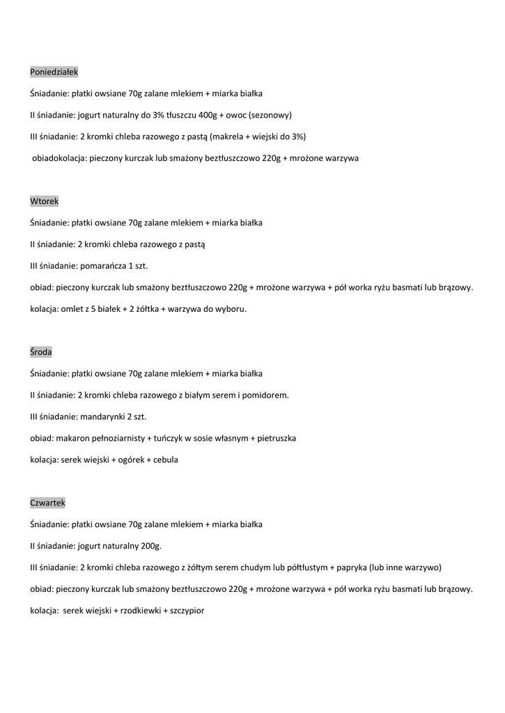 Poniedziałek Śniadanie: płatki owsiane 70g zalane mlekiem + miarka białka II śniadanie: jogurt naturalny do 3% tłuszczu 400g + owoc (sezonowy) III śniadanie: 2 kromki chleba razowego z pastą (makrela + wiejski do 3%) obiadokolacja: pieczony kurczak lub smażony beztłuszczowo 220g + mrożone warzywa Wtorek Śniadanie: płatki owsiane 70g zalane mlekiem + miarka białka II śniadanie: 2 kromki chleba razowego z pastą III śniadanie: pomarańcza 1 szt. obiad: pieczony kurczak lub smażony beztłuszczowo 220g + mrożone warzywa + pół worka ryżu basmati lub brązowy. kolacja: omlet z 5 białek + 2 żółtka + warzywa do wyboru. Środa Śniadanie: płatki owsiane 70g zalane mlekiem + miarka białka II śniadanie: 2 kromki chleba razowego z białym serem i pomidorem. III śniadanie: mandarynki 2 szt. obiad: makaron pełnoziarnisty + tuńczyk w sosie własnym + pietruszka kolacja: serek wiejski + ogórek + cebula Czwartek Śniadanie: płatki owsiane 70g zalane mlekiem + miarka białka II śniadanie: jogurt naturalny 200g. III śniadanie: 2 kromki chleba razowego z żółtym serem chudym lub półtłustym + papryka (lub inne warzywo) obiad: pieczony kurczak lub smażony beztłuszczowo 220g + mrożone warzywa + pół worka ryżu basmati lub brązowy. kolacja: serek wiejski + rzodkiewki + szczypior Piątek Śniadanie: płatki owsiane 70g zalane mlekiem + miarka. II śniadanie: pomarańcza 1 szt. III śniadanie: 2 kromki chleba razowego z białym serem i pomidorem obiado-kolacja: pieczony łosoś (dorsz lub jakiś inny rekin :d) + warzywa mrożone lub brokuł Sobota Śniadanie: płatki owsiane 70g zalane mlekiem + miarka białka II śniadanie: pomarańcza 1 szt. obiad: pieczona pierś drobiowa 300g + ryż ½ woreczka + warzywa na patelnie 250g. podwieczorek: jabłko 1 szt. Kolacja: sałatka z kurczakiem lub jajkami Niedziela: Śniadanie: 2 kromki chleba razowego z sałatą + jajka gotowane 3 szt. II śniadanie: jogurt naturalny 200g. Obiad: pieczony schab 200g + surówka z kapusty 200g + pieczone ziemnaki 2 szt. Podwieczorek: słodki deser (grecki 0% + orzechy włoskie + miód lub wiejski + cynamon + jabłko + ksylitol) Kolacja: sałatka z kurczakiem lub tuńczykiem