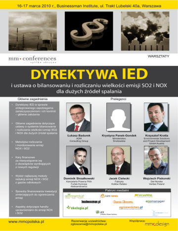 16-17 marca 2010 r., Businessman Institute, ul. Trakt Lubelski 40a, Warszawa WARSZTATY DYREKTYWA IED i ustawa o bilansowaniu i rozliczaniu wielkości emisji SO2 i NOX dla dużych źródeł spalania Główne zagadnienia • Dyrektywy IED w sprawie zintegrowanego zapobiegania zanieczyszczeniom i ich kontroli – główne założenia • Główne zagadnienia dotyczące ustawy o systemie bilansowania i rozliczania wielkości emisji SO2 i NOX dla dużych źródeł spalania • Metodyka rozliczania i monitorowania emisji NOX i SO2 • Kary finansowe za niewywiązanie się z obowiązków wynikających z nowych regulacji • Wybór najlepszej metody redukcji emisji NOX i SO2 z gazów odlotowych • Sposoby finansowania inwestycji zmierzających do ograniczenia emisji • Aspekty dotyczące handlu uprawnieniami do emisji NOX i SO2 www.mmcpolska.pl Prelegenci Łukasz Badurek Krystyna Panek-Gondek Krzysztof Krotla ADM Consulting Group Ministerstwo Środowiska Environmental Solutions and Project Development GmbH Austria Dominik Strzałkowski Jacek Cielecki Wojciech Piskorski Kancelaria Prawna FKA Furtek Komosa Aleksandrowicz Fabryka Kotłów Rafako Det Norske Veritas Poland Patroni medialni Rezerwacja uczestnictwa: [email protected] Współpraca: 16-17 marca 2010 r., Businessman Institute, ul. Trakt Lubelski 40a, Warszawa WARSZTATY DYREKTYWA IED i ustawa o bilansowaniu i rozliczaniu wielkości emisji SO2 i NOX dla dużych źródeł spalania PROGRAM WARSZTATÓW – dzień pierwszy, wtorek, 16 marca 2010 r. 9:30 Rejestracja, poranna kawa • Sankcje wynikające z polskiej ustawy oraz z Dyrektywy europejskiej 10:00 Dyrektywa IED w sprawie zintegrowanego zapobiegania zanieczyszczeniom i ich kontroli • Katalog naruszeń • Kary Krystyna Panek-Gondek Zastępca Dyrektora Departament Ochrony Klimatu i Atmosfery Ministerstwo Środowiska Dominik Strzałkowski Starszy prawnik, Radca prawny Departament korporacyjny Kancelaria Prawna FKA Furtek Komosa Aleksandrowicz 11:15 Czas na pytania i dyskusje 11:30 Przerwa kawowa 14:45 11:45 Polska ustawa o systemie bilansowania i rozliczania wielkości emisji NOX i SO2 dla dużych źródeł spalania Zaproszony prelegent: Zróżnicowanie wymagań w stosunku co do wielkości źródła mocy oraz z podziałem na różne branże Oczekujemy na potwierdzenie • Podstawowe definicje • Wyzwania dla Polski do roku 2016 15:45 Zakończenie pierwszego dnia warsztatów • Poziom emisji w roku 2008 i 2009 • Wymagania dla branży energetycznej, ciepłowniczej i przemysłowej 16-17 marca 2010 r, Businessman Institute • Rola Dyrektywy 2001/81/WE „NEC” • Plan podziału obowiązków redukcji NOX i SO2 Krystyna Panek-Gondek Zastępca Dyrektora Departament Ochrony Klimatu i Atmosfery Ministerstwo Środowiska Dyrektywa IED 13:00 Czas na pytania i dyskusje 13:15 Lunch 14:00 Kary finansowe za niewywiązanie się z obowiązków wynikających z nowych regulacji www.mmcpolska.pl i ustawa o bilansowaniu i rozliczaniu wielkości emisji SO2 i NOX dla dużych źródeł spalania Rezerwacja uczestnictwa: [email protected] Współpraca: 16-17 marca 2010 r., Businessman Institute, ul. Trakt Lubelski 40a, Warszawa WARSZTATY DYREKTYWA IED i ustawa o bilansowaniu i rozliczaniu wielkości emisji SO2 i NOX dla dużych źródeł spalania PROGRAM WARSZTATÓW – dzień drugi, środa, 17 marca 2010 r. 9:30 Rejestracja, poranna kawa Przegląd technologii odsiarczania spalin 10:00 Metodyka rozliczania i monitorowania emisji NOX i SO2 • Ogólny podział systemów oczyszczania spalin • Stosowane technologi odsiarczania spalin (m.in. przedstawienie zalet metod wapniowych) • Jakie wymogi odnośnie sposobu monitorowania • Co się stanie jak zakład nie będzie spełniał wymogów? • Specyficzne rozwiązania stosowane na instalacjach odsiarczania spalin, jak np. systemy wymiany i odzysku ciepła Wojciech Piskorski Carbon Risk Management Partners Det Norske Veritas Poland 10:45 Jacek Cielecki Dyrektor Handlowy ds. Instalacji Ochrony Środowiska, Fabryka Kotłów Rafako Raportowanie poziomu emisji NOX i SO2 • Jak ma wyglądać Jerzy Mazurek Kierownik Zespołu Pracowni Projektowych Instalacji Ochrony Srodowiska, Fabryka Kotłów Rafako • Co się zmieni w sprawozdawczości dla zakładu Wojciech Piskorski Carbon Risk Management Partners Det Norske veritas Poland 13:00 Lunch 11:30 Przerwa na kawę 13:45 11:45 Przegląd metod redukcji emisji NOX i SO2 z gazów odlotowych Możliwości finansowania inwestycji zmierzających do ograniczenia emisji NOX i SO2 • Krajowe źródła finansowania • Możliwości redukcji z podziałem na odazotowanie i odsiarczanie • Finansowanie inwestycji z wykorzystaniem środków z Regionalnych Programów Operacyjnych • Przykłady rozwiązań technologicznych • Wybór najlepszej metody Łukasz Badurek Doradca ds. funduszy UE, ADM Consulting Group Przegląd technologii odazotowania spalin • Porównanie nakładów inwestycyjnych i kosztów eksploatacji instalacji do odazotowania spalin • Doświadczenia i możliwości BOŚ w finansowaniu inwestycji • Mechanizmy powstawania tlenków azotu Iwetta Markiewicz Departament Projektów Ekologicznych Wydział Ekologii Bank Ochrony Środowiska • Metody pierwotne redukcji NOx, możliwości, granice, skutki uboczne • Metody wtórne, SCR i SNCR, porównanie techniczne 14:45 • Zestawienie kosztów inwestycyjnych i eksploatacyjnych na przykładzie wybranego kotła węglowego • Na jakich zasadach • Wysokość opłat zastępczych • Porównanie kosztów osiągnięcia limitu emisji przy zastosowaniu metod pierwotnych, SCR, SNCR oraz ich kombinacji Krzysztof Krotla Dyrektor Biznesu, Pełnomocnik Zarządu ds. Instalacji DeNOx, Fabryka Kotłów Rafako Prezes Environmental Solutions and Project Development GmbH www.mmcpolska.pl Aspekty dotyczące handlu uprawnieniami do emisji NOX i SO2 Krystyna Panek-Gondek Zastępca Dyrektora Departament Ochrony Klimatu i Atmosfery Ministerstwo Środowiska 15:30 Czas na pytania 15:45 Za