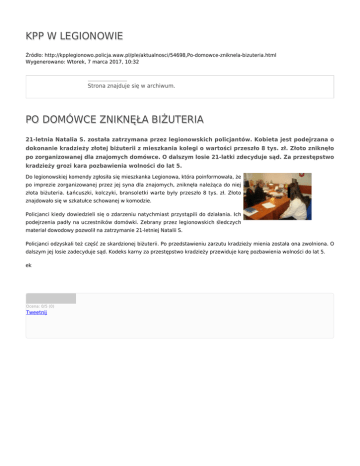 KPP W LEGIONOWIE Źródło: http://kpplegionowo.policja.waw.pl/ple/aktualnosci/54698,Po-domowce-zniknela-bizuteria.html Wygenerowano: Wtorek, 7 marca 2017, 10:32 Strona znajduje się w archiwum. PO DOMÓWCE ZNIKNĘŁA BIŻUTERIA 21-letnia Natalia S. została zatrzymana przez legionowskich policjantów. Kobieta jest podejrzana o dokonanie kradzieży złotej biżuterii z mieszkania kolegi o wartości przeszło 8 tys. zł. Złoto zniknęło po zorganizowanej dla znajomych domówce. O dalszym losie 21-latki zdecyduje sąd. Za przestępstwo kradzieży grozi kara pozbawienia wolności do lat 5. Do legionowskiej komendy zgłosiła się mieszkanka Legionowa, która poinformowała, że po imprezie zorganizowanej przez jej syna dla znajomych, zniknęła należąca do niej złota biżuteria. Łańcuszki, kolczyki, bransoletki warte były przeszło 8 tys. zł. Złoto znajdowało się w szkatułce schowanej w komodzie. Policjanci kiedy dowiedzieli się o zdarzeniu natychmiast przystąpili do działania. Ich podejrzenia padły na uczestników domówki. Zebrany przez legionowskich śledczych materiał dowodowy pozwolił na zatrzymanie 21-letniej Natalii S. Policjanci odzyskali też część ze skardzionej biżuterii. Po przedstawieniu zarzutu kradzieży mienia została ona zwolniona. O dalszym jej losie zadecyduje sąd. Kodeks karny za przestępstwo kradzieży przewiduje karę pozbawienia wolności do lat 5. ek Ocena: 0/5 (0) Tweetnij
