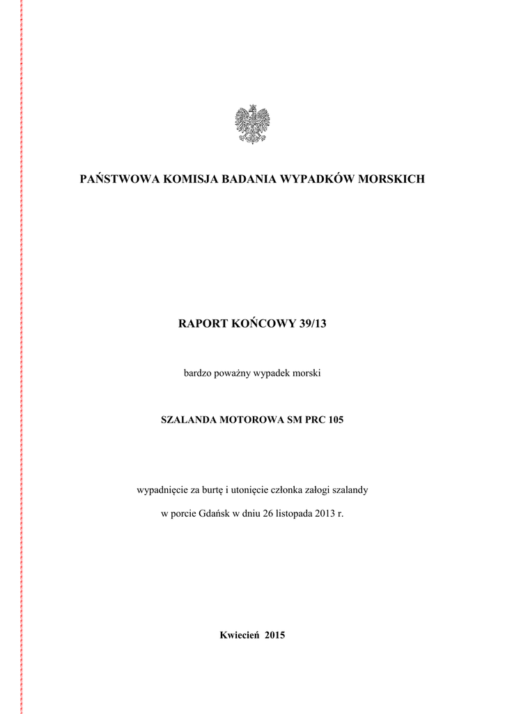 PAŃSTWOWA KOMISJA BADANIA WYPADKÓW MORSKICH RAPORT KOŃCOWY 39/13 bardzo poważny wypadek morski SZALANDA MOTOROWA SM PRC 105 wypadnięcie za burtę i utonięcie członka załogi szalandy w porcie Gdańsk w dniu 26 listopada 2013 r. Kwiecień 2015 PKBWM Raport końcowy - WIM 39/13 Badanie bardzo poważnego wypadku, do którego doszło na szalandzie motorowej SM PRC 105, prowadzone było na podstawie ustawy z dnia 31 sierpnia 2012 r. o Państwowej Komisji Badania Wypadków Morskich (Dz. U. poz. 1068) oraz uzgodnionych w ramach Międzynarodowej Organizacji Morskiej (IMO) norm, standardów i zalecanych metod postępowania, wiążących Rzeczpospolitą Polską. Zgodnie z przepisami wyżej wymienionej ustawy celem badania wypadku lub incydentu morskiego jest ustalenie okoliczności i przyczyn jego wystąpienia dla zapobiegania wypadkom i incydentom morskim w przyszłości oraz poprawy stanu bezpieczeństwa morskiego. Państwowa Komisja Badania Wypadków Morskich nie rozstrzyga w prowadzonym przez siebie badaniu o winie lub odpowiedzialności osób uczestniczących w wypadku lub incydencie morskim. Niniejszy raport nie może stanowić dowodu w postępowaniu karnym albo innym postępowaniu mającym na celu ustalenie winy lub odpowiedzialności za spowodowanie wypadku, którego raport dotyczy (art. 40 ust. 2 ustawy o PKBWM). Państwowa Komisja Badania Wypadków Morskich ul. Chałubińskiego 4/6 00-928 Warszawa tel. +48 22 630 19 05, tel. kom. +48 664 987 987 e-mail: [email protected] www.mir.gov.pl/pkbwm 2 PKBWM Raport końcowy - WIM 39/13 Spis treści str. 1. Fakty ................................................................................................................................... 4 2. Informacje ogólne ............................................................................................................... 5 2.1. Dane szalandy .............................................................................................................. 5 2.2. Informacje o podróży szalandy.................................................................................... 5 2.3. Informacje o wypadku ................................................................................................. 6 2.4. Informacje o zaangażowanych podmiotach z lądu i działaniach ratowniczych .......... 6 3. Opis okoliczności wypadku ................................................................................................ 6 4. Analiza i uwagi dotyczące czynników, które przyczyniły się do wypadku, z uwzględnieniem wyników badań i ekspertyz .......................................................................... 9 5. 4.1. Czynniki ludzkie (błędy i zaniechania) ..................................................................... 11 4.2. Czynniki organizacyjne ............................................................................................. 13 Opis wyników przeprowadzonego badania, w tym identyfikacja kwestii dotyczących bezpieczeństwa i wniosków wynikających z badania .............................................................. 15 6. Zalecenia dotyczące bezpieczeństwa ................................................................................ 16 7. Spis zdjęć .......................................................................................................................... 17 8. Wykaz stosowanych terminów technicznych oraz skrótów ............................................. 17 9. Źródła informacji .............................................................................................................. 17 10. Skład zespołu badającego wypadek .................................................................................. 18 3 PKBWM Raport końcowy - WIM 39/13 1. Fakty W dniu 26 listopada 2013 r. w godzinach wieczornych na stojącej przy nabrzeżu Krakowskim na terenie bazy PRCiP w Gdańsku szalandzie SM PRC 105 trwały prace przygotowawcze do mającej się odbyć w dniu następnym inspekcji szalandy przez klasyfikatora (PRS) przed planowanym remontem stoczniowym. Pełniący wachtę portową mechanik mył ładownię z zalegającego na jej ścianach urobku. Około godz. 18:35 na burtę wszedł mechanik z drugiej zmiany. O godz. 19:00 mechanicy przekazali sobie wachtę, jednak mechanik, który skończył wachtę postanowił pozostać na burcie do pomocy przy myciu ładowni. O godz. 20:56 w trakcie płukania wodą ściany ładowni przy użyciu węża pożarowego z prądownicą, z pokładu na prawej burcie, mechanik z nowej zmiany stracił równowagę i wypadł za burtę szalandy do wody w basenie portowym. Będący świadkiem wypadku drugi mechanik wszczął akcję ratunkową. Najpierw rzucił koło ratunkowe w kierunku utrzymującego się na wodzie twarzą do wody mechanika, następnie powiadomił o wypadku bosmana dyżurnego bazy PRCiP. Około godz. 21:00 bosman bazy wezwał do pomocy szypra z holownika „Franciszek”. Mechanikowi z szalandy udało się w tym czasie przy użyciu bosaka przyciągnąć do burty mechanika, który wypadł i odwrócić go. Przybyły na pokład szalandy szyper z holownika i mechanik z szalandy przytrzymywali bosakiem przy burcie ciało mechanika tak, by jego głowę utrzymywać nad powierzchnią wody. O godz. 21:03 na szalandę dotarł bosman bazy. Podjęta przez wszystkie osoby znajdujące się na szalandzie próba podjęcia poszkodowanego z wody na pokład nie powiodła się. Bosman bazy powiadomił telefonicznie o wypadku centrum powiadamiania ratunkowego oraz wezwał cumującą nieopodal motorówkę „Sławkę”. O godz. 21:08 motorówka przybiła do burty szalandy. Po dwóch minutach bosman bazy wraz z mechanikiem z szalandy i mechanikiem z załogi „Sławki” wydobyli mechanika, który wypadł za burtę, na pokład motorówki i rozpoczęli akcję reanimacyjną. O godz. 21:16 pod trap szalandy podjechał ambulans ratownictwa medycznego. Lekarz wraz ze swoim zespołem przeszedł na motorówkę „S