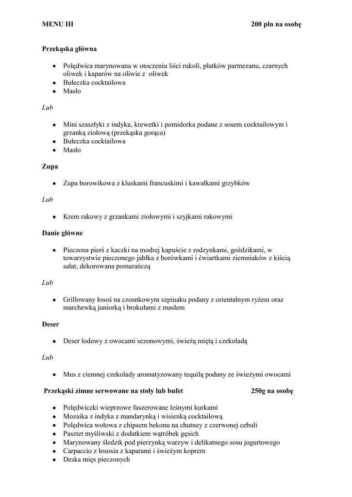 MENU III 200 pln na osobę Przekąska główna Polędwica marynowana w otoczeniu liści rukoli, płatków parmezanu, czarnych oliwek i kaparów na oliwie z oliwek Bułeczka cocktailowa Masło Lub Mini szaszłyki z indyka, krewetki i pomidorka podane z sosem cocktailowym i grzanką ziołową (przekąska gorąca) Bułeczka cocktailowa Masło Zupa Zupa borowikowa z kluskami francuskimi i kawałkami grzybków Lub Krem rakowy z grzankami ziołowymi i szyjkami rakowymi Danie główne Pieczona pierś z kaczki na modrej kapuście z rodzynkami, goździkami, w towarzystwie pieczonego jabłka z borówkami i ćwiartkami ziemniaków z kiścią sałat, dekorowana pomarańczą Lub Grillowany łosoś na czosnkowym szpinaku podany z orientalnym ryżem oraz marchewką juniorką i brokułami z masłem Deser Deser lodowy z owocami sezonowymi, świeżą miętą i czekoladą Lub Mus z ciemnej czekolady aromatyzowany tequilą podany ze świeżymi owocami Przekąski zimne serwowane na stoły lub bufet 250g na osobę Polędwiczki wieprzowe faszerowane leśnymi kurkami Mozaika z indyka z mandarynką i wisienką cocktailową Polędwica wołowa z chipsem bekonu na chutney z czerwonej cebuli Pasztet myśliwski z dodatkiem wątróbek gęsich Marynowany śledzik pod pierzynką warzyw i delikatnego sosu jogurtowego Carpaccio z łososia z kaparami i świeżym koprem Deska mięs pieczonych Gorące tapas - pyszne również na zimno 2 szt. na osobę Śliwka suszona owinięta chrupiącym bekonem Mini tosty z mozzarellą i pomidorem Polędwiczki wieprzowe z suszonymi pomidorami bazylią na grzance Dodatki Pieczywa - różne rodzaje Masełka smakowe Marynaty z naszej spiżarni: dynia, grzybki, ogórki, papryka Sosy zimne do przekąsek Sałatki 100g na osobę Sałata lodowa, pomidor, ogórek, czerwona cebula, parmezan , grzanki czosnkowe Łosoś wędzony na sałacie lodowej z grillowaną cukinią, oliwkami, suszonymi pomidorami Insalata caprese: pomidory, mozzarella, świeża bazylia i oliwa z oliwek Rewia chrupiących sałat z parmezanem i jajkiem przepiórczym II gorąca kolacja 100g indyk + 150g dodatki Płonący soczysty indyk pieczony, serwowany przez kucharzy Gorący sos cumberland Barszcz z pasztecikiem Lub Bulion z diablotką Wersja dla wegetarian Grillowana cukinia i papryka faszerowana kuskusem i zapiekana z serem Ciasta i desery 100g na osobę Ciasto cytrynowe z jabłkami i pianką Ciasto biszkoptowe z kremem budyniowym, owocami i galaretką Agrestowiec na biszkopcie z bitą śmietaną, bezą i płatkami migdałów Sernik pieczony z pianką i czekoladą Mus czekoladowy z wiśniami, mus mascarpone z maracują Owoce 100 g na osobę Patery owoców egzotycznych i sezonowych (bardzo efektownie podane) Pakiet napojów gorących Kawa świeżo parzona z ekspresu Herbata czarna, owocowa, zielona serwowana z imbryków Cytryna Cukier biały i brązowy Mleko z dzbanków Dzieci do 4 lat Dzieci do 12 lat Dzieci powyżej 12 lat konsumpcja gratis 50 % ceny osoby dorosłej płatne 100 % Pakiet napojów bezalkoholowych zimnych 22 pln na osobę Woda mineralna gazowana, niegazowana Soki owocowe 100% różne smaki Napoje gazowane Coca Cola, Sprite, Tonic 40 pln na osobę ALKOHOL OPEN BAR - bez limitu na czas trwania imprezy Wino hiszpańskie lub włoskie Wódka czysta Wyborowa Piwo Żywiec, Warka W przypadku alkoholi Klienta pobieramy opłatę serwisową 18 pln na osobę Schłodzenie alkoholu Lód Szkło w określonym asortymencie Serwis kelnerski Dekoracje kwiatowe cena do uzgodnienia Koszty organizacyjne przyjęcia 12 pln na osobę Dekoracyjne przygotowanie sali, stołów i bufetów (meble, ozdobne tkaniny, scenografia) Pokrowce na krzesła Bieżący nadzór w czasie przyjęcia nad czystością i ładem w sali weselnej oraz w toaletach Szatnia i przechowalnia z obsługą Służba porządkowa wewnątrz i na zewnątrz lokalu Gratis od firmy BanGlob dla Pary Młodej: Wino musujące dla wszystkich Gości na toast powitalny Dekoracyjny chleb weselny na powitanie Pary Młodej Pokrowce na krzesła Tort weselny Fajerwerki, confetti na oczepiny Propozycje aktualne dla: Grup minimum 50 gości 10 godzin przyjęcia weselnego w ramach ustalonego menu Każda dodatkowa godzina - koszt 500 pln Możliwość przedłużenia przyjęcia maksymalnie o dwie godziny, nie dłużej niż do godziny 06.00. REKOMENDUJEMY Oprawa muzyczna Zespół „Fraza” z Gdyni Zbigniew Pieckowski tel. 793 716 444 Zespół „Musica” Marian Wrycza tel. 604 120 872 Dj Jacek Wicek, grający na żywo na trąbce do podkładów muzycznych profesjonalista – 502 912 218 Super DJ - Disco Projekt Leszek Dybowski tel. 602 119 188 Dekoracje kwiatowe Zielony Gaj Małgorzata Kosno tel. 500 131 636 Elżbieta Lederer tel. 608 061 130 Fotografia Jacek Szeler tel. 515 288 058 Marek Puszcz tel. 606 630 193 Noclegi Och Hostel!, Gdynia, ul. Świętojańska 85, tel. 500 314 737, 502 026 350 Akademiki tuż przy Riwierze - Alicja Obrycka tel. 728 913 793 REKOMENDUJĄ NAS Zapytaj o Twoje Przyjęcie Weselne BanGlob Sp. z o.o. tel.: 58 620 43 29 - Dział Organizacji Przyjęć tel.: 58 661 30 96 - Sala Bankietowa Riwiera e-mail: [email protected]