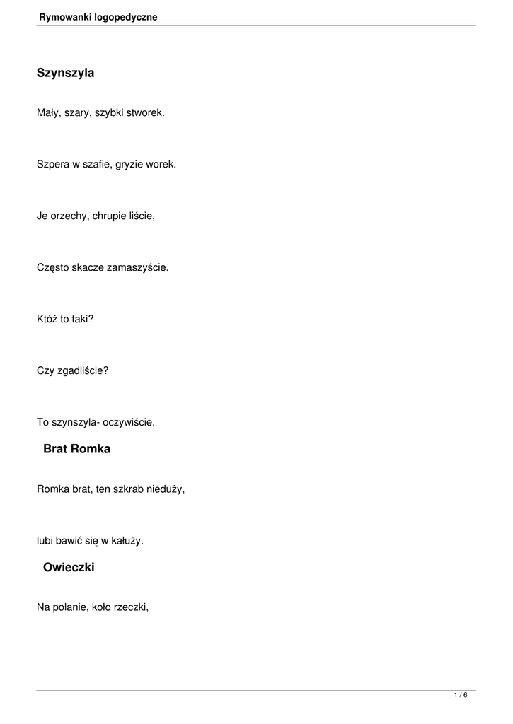 Rymowanki logopedyczne Szynszyla Mały, szary, szybki stworek. Szpera w szafie, gryzie worek. Je orzechy, chrupie liście, Często skacze zamaszyście. Któż to taki? Czy zgadliście? To szynszyla- oczywiście. Brat Romka Romka brat, ten szkrab nieduży, lubi bawić się w kałuży. Owieczki Na polanie, koło rzeczki, 1/6 Rymowanki logopedyczne spacerują dwie owieczki. Jedna czarna, druga biała, za to brudna w błocie cała. Pies Witam pana, panie psie, porozmawiać z panem chcę. - Gdybyś pieski język znał, to byś do mnie szczekał: - hau! hau! hau! Papużka Papużko, papużko Powiedz mi coś na uszko. 2/6 Rymowanki logopedyczne Nic nie powiem, boś ty plotkarz, Powtórzysz temu, kogo spotkasz. Kasza Kipi kasza, kipi groch. Lepsza kasza, niż ten groch. Bo po grochu brzuszek boli, Za to kasza brzuszek goi. Problemy Pana Raka Miał Pan Rak problemy cztery: „Czy dla raków są rowery? Znajdę rower w swym kolorze? Róż, czerwony, bordo może? A co z rowerową kartą? 3/6 Rymowanki logopedyczne Czy wyrobić jest ją warto? Gdzie zaopatrują raki w oryginalny rower taki?”. W szufladzie Do moich rzeczy w szufladzie biurka dorzucę jeszcze: kawałek sznurka, muszle, kasztanki, niciane szpulki szyszkę i myszkę i szklane kulki. Gruszka Spadła gruszka do fartuszka, spadły też i dwa jabłuszka. A śliweczka spaść nie chciała, bo śliweczka nie dojrzała. Sprzątanie 4/6 Rymowanki logopedyczne Tańczy szczotka, tańczy wiadro i ściereczka z twoją mamą. Już mieszkanie posprzątane, pomóż mamie zrób to samo! Maczek Jestem polny maczek, mam czerwony fraczek. Lubię tańczyć kujawiaczka, walczyka i krakowiaczka. Grześ Leży Grześ nad rzeczką, grzeje go słoneczko, przygląda się kędzierzawym, 5/6 Rymowanki logopedyczne puszystym owieczkom. Dżdżownica Zjadła dżem dżdżownica, wreszcie pękła jej spódnica. Zapłakała więc żałośnie: „Jak na drożdżach brzuch mi rośnie”. Wujaszek Żyje w borze sójka psujka, w Szczebrzeszynie zaś ma wujka. Zabaweczki sójka psuje. A wujaszek reperuje. 6/6