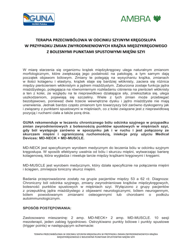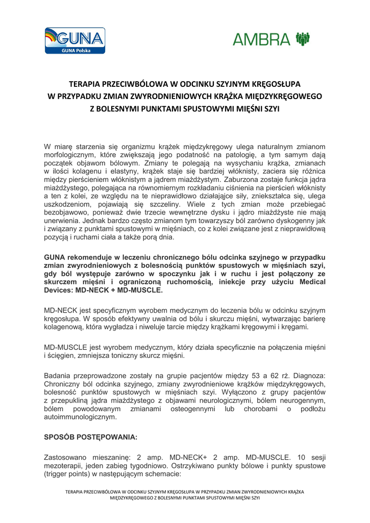 TERAPIA PRZECIWBÓLOWA W ODCINKU SZYJNYM KRĘGOSŁUPA W PRZYPADKU ZMIAN ZWYRODNIENIOWYCH KRĄŻKA MIĘDZYKRĘGOWEGO Z BOLESNYMI PUNKTAMI SPUSTOWYMI MIĘŚNI SZYI W miarę starzenia się organizmu krążek międzykręgowy ulega naturalnym zmianom morfologicznym, które zwiększają jego podatność na patologię, a tym samym dają początek objawom bólowym. Zmiany te polegają na wysychaniu krążka, zmianach w ilości kolagenu i elastyny, krążek staje się bardziej włóknisty, zaciera się różnica między pierścieniem włóknistym a jądrem miażdżystym. Zaburzona zostaje funkcja jądra miażdżystego, polegająca na równomiernym rozkładaniu ciśnienia na pierścień włóknisty a ten z kolei, ze względu na te nieprawidłowo działająjce siły, zniekształca się, ulega uszkodzeniom, pojawiają się szczeliny. Wiele z tych zmian może przebiegać bezobjawowo, ponieważ dwie trzecie wewnętrzne dysku i jądro miażdżyste nie mają unerwienia. Jednak bardzo często zmianom tym towarzyszy ból zarówno dyskogenny jak i związany z punktami spustowymi w mięśniach, co z kolei związane jest z nieprawidłową pozycją i ruchami ciała a także porą dnia. GUNA rekomenduje w leczeniu chronicznego bólu odcinka szyjnego w przypadku zmian zwyrodnieniowych z bolesnością punktów spustowych w mięśniach szyi, gdy ból występuje zarówno w spoczynku jak i w ruchu i jest połączony ze skurczem mięśni i ograniczoną ruchomością, iniekcje przy użyciu Medical Devices: MD-NECK + MD-MUSCLE. MD-NECK jest specyficznym wyrobem medycznym do leczenia bólu w odcinku szyjnym kręgosłupa. W sposób efektywny uwalnia od bólu i skurczu mięśni, wytwarzając barierę kolagenową, która wygładza i niweluje tarcie między krążkami kręgowymi i kręgami. MD-MUSCLE jest wyrobem medycznym, który działa specyficznie na połączenia mięśni i ścięgien, zmniejsza toniczny skurcz mięśni. Badania przeprowadzone zostały na grupie pacjentów między 53 a 62 rż. Diagnoza: Chroniczny ból odcinka szyjnego, zmiany zwyrodnieniowe krążków międzykręgowych, bolesność punktów spustowych w mięśniach szyi. Wyłączono z grupy pacjentów z przepukliną jądra miażdżystego z objawami neurologicznymi, bólem neurogennym, bólem powodowanym zmianami osteogennymi lub chorobami o podłożu autoimmunologicznym. SPOSÓB POSTĘPOWANIA: Zastosowano mieszaninę: 2 amp. MD-NECK+ 2 amp. MD-MUSCLE. 10 sesji mezoterapii, jeden zabieg tygodniowo. Ostrzykiwano punkty bólowe i punkty spustowe (trigger points) w następującym schemacie: TERAPIA PRZECIWBÓLOWA W ODCINKU SZYJNYM KRĘGOSŁUPA W PRZYPADKU ZMIAN ZWYRODNIENIOWYCH KRĄŻKA MIĘDZYKRĘGOWEGO Z BOLESNYMI PUNKTAMI SPUSTOWYMI MIĘŚNI SZYI - obustronnie, okołokręgowo, wzdłuż kręgów szyjnych, 3 cm od linii pośrodkowej tylnej, od 4 do 7 kręgu szyjnego; - średnia ilość mieszaniny MD na jeden punkt iniekcji: 0,5-0,6 ml; - miejsce wkłucia zdezynfekowano; - igła jest ustawiona jak do wstrzyknięć dostawowych, ale wchodzi głębokość 3-4 mm, bez osiągania krążka międzykręgowego, torebki stawowej czy więzadeł międzykręgowych; - jeden zabieg tygodniowo przez 10 tygodni; REZULTATY: W skali VAS średnio ocena bólu przed leczeniem: 6,9; po leczeniu średnio 2,9; Wyraźny wzrost zakresu ruchu w stawie w ruchach zgięcia, wyprostu, rotacji. Zmniejszenie skurczu mięśni po leczeniu przez większość pacjentów oceniona została na maksymalną ilość punktów. Tolerancja na leczenie bardzo dobra. Brak efektów ubocznych. W jednym przypadku wystąpiła paradoksalna reakcja: niewielki wzrost przykurczu mięśni po iniekcji, który trwał 6-8 godzin, zanikł spontanicznie. Lekarze prowadzący badanie uważają, że ten efekt spowodowany był mechanicznym podrażnieniem mięśnia przez igłę. Terapia z użyciem Medical Devices jest skuteczną i bezpieczną metodą leczenia bólu, porównywalną w osiągniętych rezultatach do leczenia iniekcyjnego z użyciem NLPZ, jednak bez charakterystycznych dla NLPZ efektów ubocznych. TERAPIA PRZECIWBÓLOWA W ODCINKU SZYJNYM KRĘGOSŁUPA W PRZYPADKU ZMIAN ZWYRODNIENIOWYCH KRĄŻKA MIĘDZYKRĘGOWEGO Z BOLESNYMI PUNKTAMI SPUSTOWYMI MIĘŚNI SZYI