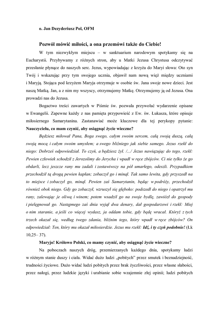 o. Jan Dezyderiusz Pol, OFM Pozwól mówić miłości, a ona przemówi także do Ciebie! W tym niezwykłym miejscu – w sanktuarium narodowym spotykamy się na Eucharystii. Przybywamy z różnych stron, aby u Matki Jezusa Chrystusa odczytywać przesłanie płynące do naszych serc. Jezus, wypowiadając z krzyża do Maryi słowa: Oto syn Twój i wskazując przy tym swojego ucznia, objawił nam nową więź między uczniami i Maryją. Stojąca pod krzyżem Maryja otrzymuje w osobie św. Jana swoje nowe dzieci. Jest naszą Matką. Jan, a z nim my wszyscy, otrzymujemy Matkę. Otrzymujemy ją od Jezusa. Ona prowadzi nas do Jezusa. Bogactwo treści zawartych w Piśmie św. pozwala przywołać wydarzenie opisane w Ewangelii. Zapewne każdy z nas pamięta przypowieść z Ew. św. Łukasza, które opisuje miłosiernego Samarytanina. Zastanawiać może kluczowe dla tej perykopy pytanie: Nauczycielu, co mam czynić, aby osiągnąć życie wieczne? Będziesz miłował Pana, Boga swego, całym swoim sercem, całą swoją duszą, całą swoją mocą i całym swoim umysłem; a swego bliźniego jak siebie samego. Jezus rzekł do niego: Dobrześ odpowiedział. To czyń, a będziesz żył. /.../ Jezus nawiązując do tego, rzekł: Pewien człowiek schodził z Jerozolimy do Jerycha i wpadł w ręce zbójców. Ci nie tylko że go obdarli, lecz jeszcze rany mu zadali i zostawiwszy na pół umarłego, odeszli. Przypadkiem przechodził tą drogą pewien kapłan; zobaczył go i minął. Tak samo lewita, gdy przyszedł na to miejsce i zobaczył go, minął. Pewien zaś Samarytanin, będąc w podróży, przechodził również obok niego. Gdy go zobaczył, wzruszył się głęboko: podszedł do niego i opatrzył mu rany, zalewając je oliwą i winem; potem wsadził go na swoje bydlę, zawiózł do gospody i pielęgnował go. Następnego zaś dnia wyjął dwa denary, dał gospodarzowi i rzekł: Miej o nim staranie, a jeśli co więcej wydasz, ja oddam tobie, gdy będę wracał. Któryż z tych trzech okazał się, według twego zdania, bliźnim tego, który wpadł w ręce zbójców? On odpowiedział: Ten, który mu okazał miłosierdzie. Jezus mu rzekł: Idź, i ty czyń podobnie! (Łk 10,25– 37). Maryjo! Królowo Polski, co mamy czynić, aby osiągnąć życie wieczne? Na poboczach naszych dróg, przemierzanych każdego dnia, spotykamy ludzi w różnym stanie duszy i ciała. Widać dużo ludzi „pobitych” przez smutek i beznadziejność, trudności życiowe. Dużo widać ludzi pobitych przez brak życzliwości, przez własne słabości, przez nałogi, przez ludzkie języki i urabianie sobie wzajemnie złej opinii; ludzi pobitych przez błędne wychowanie (nie tylko w rodzinach dysfunkcyjnych czy patologicznych); ludzi pobitych przez pychę, żywioną zazdrość czy nienawiść; ludzi zmaltretowanych przez choroby i lęk przed przemijaniem oraz śmiercią. Jak my na tych ludzi patrzymy? Czy ich zauważamy? Czy chcemy ich zauważać? Królowo Polski, co mamy czynić, aby osiągnąć życie wieczne – osiągnąć zbawienie? Kiedy pielgrzymujemy tu – do tronu Królowej Polski – czujemy się bezpiecznie i pewni siebie. Każdy z nas przybywa tu z nadzieją wysłuchania i liczy na orędownictwo Maryi i łaskawe spojrzenie na nasze osobiste wydarzenia. Pragniemy, aby Ona była blisko nas – w naszych życiowych sprawach, pragniemy aby Ona towarzyszyła nam jak św. Elżbiecie, nawet w takich banalnych wydarzeniach codzienności. Cieszymy się, kiedy odczuwamy Jej obecność! Szczególnie cenimy sobie to, że niczym Samarytanin z przypowieści Maryja jest z nami, kiedy czujemy się odarci, obici i porzuceni. A może to nie tylko my potrzebujemy pomocy, a raczej nasi bliźni? Są wśród nas pielgrzymów – tu w kaplicy – uczestnicy XIV OGÓLNOPOLSKIEJ KONFERENCJI PRACOWNIKÓW SOCJALNYCH i zapewne nie raz zadawali sobie to pytanie podczas wykonywania swoich obowiązków – co mam czynić? Odpowiedź dla nas, wierzących, jest jednoznaczna: Idź, i ty czyń podobnie! Rób to, co mówi Jezus. Okazuj miłosierdzie w każdej sytuacji. Nie tylko poprzez finansowanie organizacji charytatywnych, ale poprzez osobiste, zgodne z etyką zawodu, zaangażowanie jako profesjonalny pracownik socjalny albo jako wolontariusz, albo zwyczajnie jako człowiek dobrego serca. Obudź w sobie dobrego Samarytanina – tak jak Maryja (u krewnej swojej Elżbiety, na weselu w Kanie Galilejskiej, i pod krzyżem) bądź czuły, wrażliwy i otwarty na potrzeby innych i okazuj współczucie, i pomagaj tym współczesnym obitym i porzuconym. Ta pomoc może przybrać kształt przyjaznego spojrzenia, uśmiechu, dobrego słowa, modlitwy posłanej wprost do Boga, może przybrać kształt ofiary swoich trudów i cierpień za tych, którzy cierpią bardziej niż my... Jeśli masz wątpliwości co robić, aby osiągnąć życie wieczne, osiągnąć zbawienie, to teraz już znasz odpowiedź i metodę: Idź, i ty czyń podobnie! Bądź blisko bliźniego i nie mijaj go z obojętnością i strachem, ale okazuj mu miłosierdzie. Pozwól mówić miłości, a ona przemówi także do Ciebie! Amen.