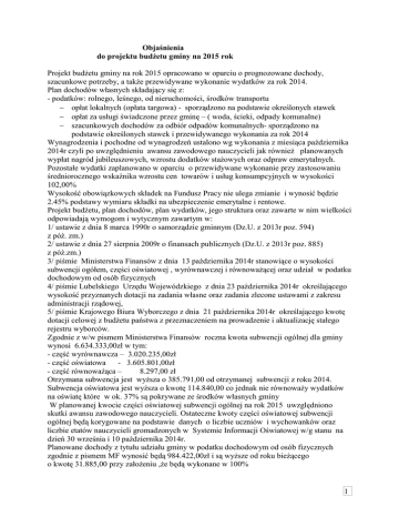 Objaśnienia do projektu budżetu gminy na 2015 rok Projekt budżetu gminy na rok 2015 opracowano w oparciu o prognozowane dochody, szacunkowe potrzeby, a także przewidywane wykonanie wydatków za rok 2014. Plan dochodów własnych składający się z: - podatków: rolnego, leśnego, od nieruchomości, środków transportu − opłat lokalnych (opłata targowa) - sporządzono na podstawie określonych stawek − opłat za usługi świadczone przez gminę – ( woda, ścieki, odpady komunalne) − szacunkowych dochodów za odbiór odpadów komunalnych- sporządzono na podstawie określonych stawek i przewidywanego wykonania za rok 2014 Wynagrodzenia i pochodne od wynagrodzeń ustalono wg wykonania z miesiąca października 2014r czyli po uwzględnieniu awansu zawodowego nauczycieli jak również planowanych wypłat nagród jubileuszowych, wzrostu dodatków stażowych oraz odpraw emerytalnych. Pozostałe wydatki zaplanowano w oparciu o przewidywane wykonanie przy zastosowaniu średniorocznego wskaźnika wzrostu cen towarów i usług konsumpcyjnych w wysokości 102,00% Wysokość obowiązkowych składek na Fundusz Pracy nie ulega zmianie i wynosić będzie 2.45% podstawy wymiaru składki na ubezpieczenie emerytalne i rentowe. Projekt budżetu, plan dochodów, plan wydatków, jego struktura oraz zawarte w nim wielkości odpowiadają wymogom i wytycznym zawartym w: 1/ ustawie z dnia 8 marca 1990r o samorządzie gminnym (Dz.U. z 2013r poz. 594) z póź. zm.) 2/ ustawie z dnia 27 sierpnia 2009r o finansach publicznych (Dz.U. z 2013r poz. 885) z póź.zm.) 3/ piśmie Ministerstwa Finansów z dnia 13 października 2014r stanowiące o wysokości subwencji ogółem, części oświatowej , wyrównawczej i równoważącej oraz udział w podatku dochodowym od osób fizycznych 4/ piśmie Lubelskiego Urzędu Wojewódzkiego z dnia 23 października 2014r określającego wysokość przyznanych dotacji na zadania własne oraz zadania zlecone ustawami z zakresu administracji rządowej, 5/ piśmie Krajowego Biura Wyborczego z dnia 21 października 2014r określającego kwotę dotacji celowej z budżetu państwa z przeznaczeniem na prowadzenie i aktualizację stałego rejestru wyborców. Zgodnie z w/w pismem Ministerstwa Finansów roczna kwota subwencji ogólnej dla gminy wynosi 6.634.333,00zł w tym: - część wyrównawcza – 3.020.235,00zł - część oświatowa - 3.605.801,00zł - część równoważąca – 8.297,00 zł Otrzymana subwencja jest wyższa o 385.791,00 od otrzymanej subwencji z roku 2014. Subwencja oświatowa jest wyższa o kwotę 114.840,00 co jednak nie równoważy wydatków na oświatę które w ok. 37% są pokrywane ze środków własnych gminy W planowanej kwocie części oświatowej subwencji ogólnej na rok 2015 uwzględniono skutki awansu zawodowego nauczycieli. Ostateczne kwoty części oświatowej subwencji ogólnej będą korygowane na podstawie danych o liczbie uczniów i wychowanków oraz liczbie etatów nauczycieli gromadzonych w Systemie Informacji Oświatowej w/g stanu na dzień 30 września i 10 października 2014r. Planowane dochody z tytułu udziału gminy w podatku dochodowym od osób fizycznych zgodnie z pismem MF wynosić będą 984.422,00zł i są wyższe od roku bieżącego o kwotę 31.885,00 przy założeniu ,że będą wykonane w 100% 1 Zgodnie z pismem LUW określone wysokości dotacji na rok 2015 wynoszą: − dotacje na zadania własne – 107.000,00 − dotacje na zadania zlecone z zakresu administracji rządowej – 1.304.060,00zł oraz dotacja z Krajowego Biura Wyborczego – 1.294,00zł Nadal zwolnione są od podatku od nieruchomości budynki mieszkalne rolników. Z tytułu obniżenia stawek podatku rolnego do kwoty 34,34 oraz leśnego do kwoty 17,88zł utracone dochody w 2015r szacuje się na kwotę około 437.107,00zł Stawki za dostarczanie wody oraz odprowadzenie ścieków Uchwałą Rady Gminy z września 2014r zostały podniesione o 0.10zł netto i wynoszą :pobór wody – 1,60 + VAT, odprowadzenie ścieków 3,90 + VAT. Ceny za odbiór odpadów komunalnych na dzień tworzenia projektu budżetu na 2015r pozostają również na niezmienionym poziomie. W planie dochodów uwzględniono również refundację środków za realizowane projekty: jeden w ramach działania „Odnowa i Rozwój Wsi” objętego PROW na lata 2007-2013 to realizacja projektu „ Remont budynku świetlicy wiejskiej w miejscowości Ciotcza” – która to inwestycja została już zakończona i złożony wniosek o płatność, - dofinansowanie do remontu świetlicy wiejskiej w Abramowie nowy projekt realizacja w 2015r. oraz dotacja na dofinansowanie inwestycji wspólnej „Instalacja kolektorów słonecznych na budynkach mieszkalnych w gminach Jeziorzany, Kamionka, Michów oraz Abramów” Dochody z tytułu poboru wody zaplanowano w dziale 400 rozdz. 40002 w kwocie 250.000zł jest to wielkość przewidywanego wykonania roku bieżącego. Natomiast dochody za odprowadzanie ścieków planuje się w dziale 900 rozdz. 90001 wysokości 103.400, a za odbiór odpadów komunalnych w dziale 756 rozdział 75618– 340.000,00zł wielkość ta została określona na podstawie złożonych deklaracji przez mieszkańców gminy. W projekcie budżetu na rok 2015 zaplanowano również dochody majątkowe z tytułu sprzedaży majątku gminy - 300.000,00zł - sprzedaż lokalu mieszkalnego przy SP w Wielkolesie - sprzedaż lokalu mieszkalnego przy SP w Abramowie - sprzedaż działki po SP w Sosnówce Szczegółowy projekt planowanych dochodów na rok 2015 stanowi załącznik nr 1 do projektu uchwały rady gminy zgodnie z którym planuje się dochody ogółem w kwocie 12.431.807,66zł w tym: dochody bieżące w kwocie 11.074.027,49 do których zaliczamy podatki i opłaty lokalne, udziały w podatkach od osób fizycznych i prawnych – przekazywane przez Ministerstwo Finansów i Urzędy Skarbowe, subwencje, dotacje na realizację zadań własnych i zadań z zakresu administracji rządowej zleconych gminie , o