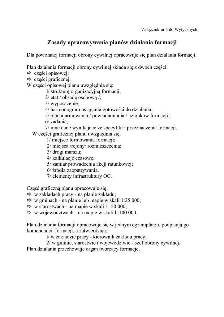 Załącznik nr 5 do Wytycznych Zasady opracowywania planów działania formacji Dla powołanej formacji obrony cywilnej opracowuje się plan działania formacji. Plan działania formacji obrony cywilnej składa się z dwóch części: części opisowej; części graficznej. W części opisowej planu uwzględnia się: l/ strukturę organizacyjną formacji; 2/ etat / obsadę osobową /; 3/ wyposażenie; 4/ harmonogram osiągania gotowości do działania; 5/ plan alarmowania / powiadamiania / członków formacji; 6/ zadania; 7/ inne dane wynikające ze specyfiki i przeznaczenia formacji. W części graficznej planu uwzględnia się: 1/ miejsce formowania formacji; 2/ miejsca /rejony/ rozmieszczenia; 3/ drogi marszu; 4/ kalkulacje czasowe; 5/ zamiar prowadzenia akcji ratunkowej; 6/ źródła zaopatrywania. 7/ elementy infrastruktury OC. Część graficzną planu opracowuje się: w zakładach pracy - na planie zakładu; w gminach - na planie lub mapie w skali 1:25 000; w starostwach - na mapie w skali l : 50 000; w województwach - na mapie w skali l :100 000. Plan działania formacji opracowuje się w jednym egzemplarzu, podpisują go komendanci formacji, a zatwierdzają: l/ w zakładzie pracy - kierownik zakładu pracy; 2/ w gminie, starostwie i województwie - szef obrony cywilnej. Plan działania przechowuje organ tworzący formacje.