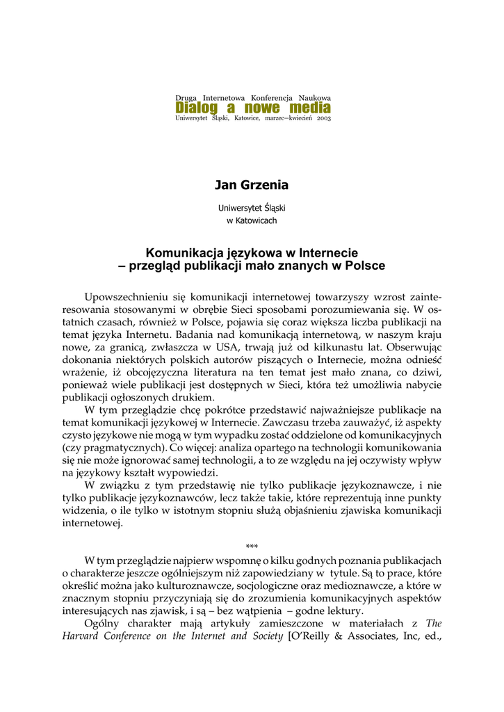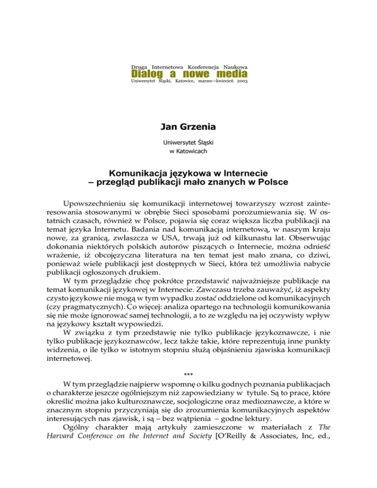 Druga Internetowa Konferencja Naukowa Dialog a nowe media Uniwersytet Śląski, Katowice, marzec—kwiecień 2003 Jan Grzenia Uniwersytet Śląski w Katowicach Komunikacja językowa w Internecie – przegląd publikacji mało znanych w Polsce Upowszechnieniu się komunikacji internetowej towarzyszy wzrost zainteresowania stosowanymi w obrębie Sieci sposobami porozumiewania się. W ostatnich czasach, również w Polsce, pojawia się coraz większa liczba publikacji na temat języka Internetu. Badania nad komunikacją internetową, w naszym kraju nowe, za granicą, zwłaszcza w USA, trwają już od kilkunastu lat. Obserwując dokonania niektórych polskich autorów piszących o Internecie, można odnieść wrażenie, iż obcojęzyczna literatura na ten temat jest mało znana, co dziwi, ponieważ wiele publikacji jest dostępnych w Sieci, która też umożliwia nabycie publikacji ogłoszonych drukiem. W tym przeglądzie chcę pokrótce przedstawić najważniejsze publikacje na temat komunikacji językowej w Internecie. Zawczasu trzeba zauważyć, iż aspekty czysto językowe nie mogą w tym wypadku zostać oddzielone od komunikacyjnych (czy pragmatycznych). Co więcej: analiza opartego na technologii komunikowania się nie może ignorować samej technologii, a to ze względu na jej oczywisty wpływ na językowy kształt wypowiedzi. W związku z tym przedstawię nie tylko publikacje językoznawcze, i nie tylko publikacje językoznawców, lecz także takie, które reprezentują inne punkty widzenia, o ile tylko w istotnym stopniu służą objaśnieniu zjawiska komunikacji internetowej. *** W tym przeglądzie najpierw wspomnę o kilku godnych poznania publikacjach o charakterze jeszcze ogólniejszym niż zapowiedziany w tytule. Są to prace, które określić można jako kulturoznawcze, socjologiczne oraz medioznawcze, a które w znacznym stopniu przyczyniają się do zrozumienia komunikacyjnych aspektów interesujących nas zjawisk, i są – bez wątpienia – godne lektury. Ogólny charakter mają artykuły zamieszczone w materiałach z The Harvard Conference on the Internet and Society [O’Reilly & Associates, Inc, ed., Druga Internetowa Konferencja Naukowa Dialog a nowe media Uniwersytet Śląski, Katowice, marzec—kwiecień 2003 1996] stanowiących interesującą charakterystykę zjawiska przeprowadzoną ze stanowiska socjologicznego, wszakże rozumianego szeroko. Godne uwagi są m.in. opinie menedżerów największych firm informatycznych: Microsoftu, Intela i innych. Niekoniecznie ze względu na wartość poznawczą, bowiem istotna jest też historyczna wartość ich wypowiedzi, a czytelnik mający odpowiednią wiedzę łatwo powiąże deklaracje wspomnianych menedżerów ze współczesnymi faktami. W gronie uczonych skupiających swą uwagę na wpływie Internetu na społeczeństwo i jego kulturę aktywnością wyróżnia się Steve G. Jones, profesor Uniwersytetu w Tulsie, redaktor trzech często cytowanych książek: Virtual culture. Identity and communication in cyberspace [ed., 1997], CyberSociety 2.0: Revisiting computer-mediated communication and community [ed., 1998] oraz Doing Internet Research: Critical Issues and Methods for Examining the Net [ed., 1999]. Pierwszą z nich warto polecić m.in. ze względu na ###. Drugą, której tytuł godny jest epoki cyfrowej, także z uwagi na rozdział Virtual ethnicity: tribal identity in an age of global communications napisany przez Marka Postera, trzecią zaś zwłaszcza ze względu na artykuł Jamesa J. Sosnoskiego Configuring as a Mode of Rhetorical Analysis. Wśród innych publikacji z zakresu socjologii sieciowej wymienię zbiór Network & Netplay. Virtual groups on the Internet pod redakcją Fay Sudweeks, Margaret McLaughlin i Sheizafa Rafaelego [1997] oraz The Internet and Society Jamesa Slevina [2000]. Obszerny zbiór 48 publikacji pt. The cybercultures reader, zredagowany przez Davida Bella i Barbarę Kennedy [2001], przynosi m.in. artykuły na temat cyberfeminizmu, cyberseksualności i cyberkolonizacji. W związku z tym, iż tematy te w ostatnich czasach ogromnie zyskują na popularności, wolno sądzić, że wkrótce staną się one jednymi z ważniejszych w badaniach nad CMC. Nie ulega wątpliwości, iż objaśnianie psychologicznych aspektów komunikacji internetowej należy do najważniejszych zadań „internetologii”. Spośród publikacji na ten temat na wzmiankę zasługują przede wszystkim dwie: zredagowana przez Jayne Gackenbach [1998] Psychology and the Internet: Intrapersonal, interpersonal and transpersonal implications oraz wydana w Polsce Psychologia Internetu Patricii Wallace [2001, wyd. ang. 1999]. Kolejną interesującą publikacją jest zredagowany przez Charlesa Essa [1996] zbiór artykułów Philosophical perspectives on computer-mediated communication. Autorzy publikacji zamieszczonych w tym tomie rozważają zagadnienia z punktu widzenia epistemologicznego, semiotycznego, etycznego i religioznawczego, które dotyczą takich m.in. zagadnień, jak: prywatność (głównie artykuły Daga Elgesema Privacy, Respect for Persons, and Risk i Petera Danielsona Pseudonyms, MailBots, and Virtual Letterheads: The Evolution of Computer-Mediated Ethics), problem płci (artykuł Susan Herring Posting in a Different Voice: Gender and Ethics in CMC), religia (z dwu prac na ten temat uwagę zwraca zwłaszcza The Unknown God of the Internet: Religious Communication from the Ancient Agora to the Virtual Forum Stephena D. O’Leary’ego i Brendy E. Brasher). Warto też poznać opracowany przez Charlesa Essa [2001] zbiór artykułów Culture, technology, communication: Towards an 2 Druga Internetowa Konferencja Naukowa Dialog a nowe media Uniwersytet Śląski, Katowice, marzec—kwiecień 2003 intercultural global village, w którym filozoficzna refleksja nad globalnym medium łączy się z analizą lokalnych punktów widzenia, omówionych na przykładach europejskich, azjatyckich i odnoszących się do świata islamu.