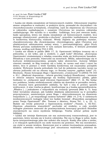 o. prof. Dr hab. Piotr Liszka CMF o. prof. Dr hab. Piotr Liszka CMF 51-611 Wrocław, ul. Wieniawskiego 38 www.piotr-liszka.strefa.pl + Łaska nie działa niezależnie od historycznych realiów. Odczuwanie wspólne zwane ortopathos w realności, w praktyce życia, prowadzi do chrystofani i do chrystoforyczności (cristofanía, cristoforía), czyli do objawienia się Chrystusa w człowieku naśladującym i noszenie Chrystusa we wnętrzu człowieka naśladującego. Nie wynika to z wysiłku ludzkiego, lecz jest owocem łaski, łaski specjalnej, która nie działa niezależnie od historycznych realiów, lecz pomaga uhistorycznić „praktykę-z-duchem”, przyoblec naśladowanie Jezusa w konkretną historyczną realność. Wtedy objawia się podwójny wymiar, charakterystyczny dla chrześcijanina: chrystologiczny, gdyż Chrystus jest obiektywnym odniesieniem naszej wiary, i pneumatologiczny, gdyż Duch Święty porusza naśladowców w tym samym kierunku, w którym prowadził Jezusa, według woli Bożej T42.3 299. + Łaska nie działa w piekle (Mdr 17, 2). Opatrzność biblijna troszczy się o jednostkę, a nie tylko, jak u stoików, o „ogół ludzi” (Seneka). „Koncepcja Opatrzności utożsamianej z władzą cesarską stała się kulturowym banałem. Świadczą o tym pomniki, wizerunki na monetach. Biblia, zakorzeniając się w kulturze śródziemnomorskiej, przejęła takie słownictwo. Autorzy biblijni również uważali, że Bóg troszczy się o ludzi, że czuwa nad nimi i czyni im dobro, lecz w postaci o wiele bardziej konkretnej niż racjonalny porządek stoików. Wybranie Izraela pobudzało ten lud do położenia nacisku raczej na obronę jednostki niż na obronę tego, co Seneka nazywa „ogółem ludzi” /O. Boulnois, Nasza koncepcja Boga i Opatrzności, „Communio” 6 (2002) 78-103 s. 81/. „Mądrość dopuszcza – wbrew greckiej tradycji filozoficznej – istnienie w świecie miejsca wymykającego się boskiej Opatrzności: piekła, gdzie bezbożni to: „wyłączeni spod wiecznej Opatrzności” (Mdr 17, 2). Nie będąc mu poddana, boska wielkoduszność udziela się dowolnie w porządku świata, lecz słuszna kara grzeszników zakłada, by byli z niej w pewien sposób wykluczeni. A więc trzeba ją głosić, konfrontując ją z boską sprawiedliwością: „Władca […] jednakowo o wszystkich się troszczy (pronoei) (Mdr 6, 7). Inny tekst wyraźniej ukazuje, jak ludzkie działania zakorzenione są w porządku przyczynowym, zamierzonym przez Boga i ukierunkowanym na zbawienie wszystkich: […] „ze wszystkiego możesz wybawić” (Mdr 14, 2-4). U niektórych średniowiecznych teologów tekst ten będzie brzmiał: „Wszystkim zarządzasz przez Twoją Opatrzność” (Św. Tomasz z Akwinu, Suma Tel.. I, q. 22, 1). Będzie się wtedy pokrywał z Opatrznością stoików” /Tamże, s. 82-83/. Hipoteza „zbawienia wszystkich” pochodzi od stoików, a cały wysiłek teologów powinien zmierzać do przezwyciężenia koncepcji greckich filozofów starożytnych na rzecz myślenia biblijnego. Trzeba zebrać pełnię myśli biblijnej. + Łaska nie istnieje Ezoteryzm nie ma autentycznej transcendencji, jest to panteizm, który wyraża się w kulcie człowieka. Nie ma tu Boga w sobie, łaski, życia interpretowanego jako dar miłości dla innych. Każdy dba tylko o siebie, a w relacjach społecznych na czoło wysuwa się przemoc. Nie ma moralności, czy etyki w sensie ścisłym. Ezoteryzm jest w całości kuriozalnym przesądem. Ideałem człowieka ezoterycznego jest nieustanna wędrówka, podobna do 1 o. prof. Dr hab. Piotr Liszka CMF wędrówki gwiazd. Ma to być sposób oczyszczenia i wznoszenia się na wyższe szczeble doskonałości. Środki komunikacji nie służą do zaoszczędzenia czasu, aby mieć więcej czasu do twórczej pracy, modlitwy i przebywania we wspólnocie. Liczy się wędrowanie jako takie. W ślad za tym pojawia się regresja socjopolityczna. „Tam gdzie ludzie tracą ideał etyki sprawiedliwości wypracowywanej codziennym wysiłkiem, tam gdzie motorem działania jest zdobywanie pierwszych miejsc w administracji politycznej i życiu ekonomicznym, mają skłonność do identyfikowania swoich przywilejów z rodzajem rozumowania pseudoteologicznego: tworzą klasę wyższą, są nosicielami swoistej najwznioślejszej mądrości, która obecnie kiełkuje w świecie. Z pewnością, niektóre z ugrupowań ezoterycznych poszukiwały i nadal poszukują postępu; wystarczy wspomnieć o różnych typach masonerii i o tym, co niektórzy nazywają dziś „konspiracją Wodnika”. Lecz w głębi chodzi tu o grupy elitarne: brakuje w nich sprawiedliwości interpretowanej jako otwartość na wszystkich, jako uniwersalne uczestniczenie w obszarach i dobrach całej ziemi, brakuje wiary w wartość ludzi najuboższych X. Pikaza, Esoterismo, w: Diccionario Teológico. El Dios cristiano, Salamanca 1992, 451474, s. 472. + Łaska nie jest częścią Boga w człowieku. W ten sam sposób, w jaki Bóg ulepił swymi dłońmi kształty ciała, ulepił też tchnieniem swych ust życie ludzkiego ciała. Tchnienie jest specjalnym darem Boga, jest komunikowaniem boskiego wnętrza, ale nie jest „częścią Boga”, którą Bóg daje człowiekowi w geście rozdawania każdemu po kawałku Boga. Tchnienie, które posiada człowiek jest czymś „ulepionym”, stworzonym, jest owocem tchnienia jako czynności Boga Stworzyciela. Zaczęło istnieć wraz z ludzkim ciałem. Nie jest przekazywane przez rodziców, ani nie istniało w wieczności. W1.1 174 + Łaska nie jest konieczna dla poznania Boga przez rozum. Krąg hermeneutyczny między zrozumieniem a wiarą (crede ut intelligas) u św. Augustyna dotyczy nie tyle relacji pomiędzy teologiem a tekstem przez niego badanym i interpretowanym, co raczej pomiędzy wspólnotą katechumenów i ochrzczonych a przekazywanym i przyjmowanym orędziem, nie tylko na płaszczyźnie intelektu, lecz w całym życiu. Podobnie Sobór Watykański pierwszy mów
