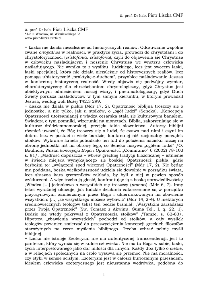Łaska nie - prof. Dr hab. Piotr Liszka CMF