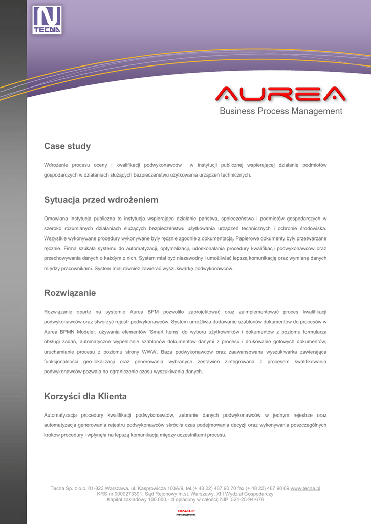 Business Process Management Case study Wdrożenie procesu oceny i kwalifikacji podwykonawców w instytucji publicznej wspierającej działanie podmiotów gospodarczych w działaniach służących bezpieczeństwu użytkowania urządzeń technicznych. Sytuacja przed wdrożeniem Omawiana instytucja publiczna to instytucja wspierająca działanie państwa, społeczeństwa i podmiotów gospodarczych w szeroko rozumianych działaniach służących bezpieczeństwu użytkowania urządzeń technicznych i ochronie środowiska. Wszystkie wykonywane procedury wykonywane były ręcznie zgodnie z dokumentacją. Papierowe dokumenty były przetwarzane ręcznie. Firma szukała systemu do automatyzacji, optymalizacji, udoskonalania procedury kwalifikacji podwykonawców oraz przechowywania danych o każdym z nich. System miał być niezawodny i umożliwiać lepszą komunikację oraz wymianę danych między pracownikami. System miał również zawierać wyszukiwarkę podwykonawców. Rozwiązanie Rozwiązanie oparte na systemie Aurea BPM pozwoliło zaprojektować oraz zaimplementować proces kwalifikacji podwykonawców oraz stworzyć rejestr podwykonawców. System umożliwia dodawanie szablonów dokumentów do procesów w Aurea BPMN Modeler, używania elementów ‘Smart Items’ do wyboru użytkowników i dokumentów z poziomu formularza obsługi zadań, automatyczne wypełnianie szablonów dokumentów danymi z procesu i drukowanie gotowych dokumentów, uruchamianie procesu z poziomu strony WWW. Baza podwykonawców oraz zaawansowana wyszukiwarka zawierająca funkcjonalności geo-lokalizacji oraz generowania wybranych zestawień zintegrowana z procesem kwalifikowania podwykonawców pozwala na ograniczenie czasu wyszukiwania danych. Korzyści dla Klienta Automatyzacja procedury kwalifikacji podwykonawców, zebranie danych podwykonawców w jednym rejestrze oraz automatyzacja generowania rejestru podwykonawców skróciła czas podejmowania decyzji oraz wykonywania poszczególnych kroków procedury i wpłynęła na lepszą komunikacją między uczestnikami procesu. Tecna Sp. z o.o. 01-823 Warszawa, ul. Kasprowicza 103A/9, tel.(+ 48 22) 487 90 70 fax (+ 48 22) 487 90 69 www.tecna.pl KRS nr 0000273391; Sąd Rejonowy m.st. Warszawy, XIII Wydział Gospodarczy Kapitał zakładowy 100.000,- zł opłacony w całości; NIP: 524-25-94-678