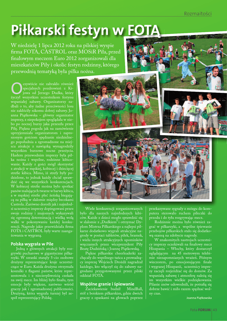 5R]PDLWRāFL Piłkarski festyn w FOTĄ W niedzielę 1 lipca 2012 roku na pilskiej wyspie firma FOTA, CASTROL oraz MOSiR Piła, przed finałowym meczem Euro 2012 zorganizowali dla mieszkańców Piły i okolic festyn rodzinny, którego przewodnią tematyką była piłka ka nożna. O czywiście nie zabrakło również specjalnych pozdrowień z Kijowa od Jerzego Dudka, który życzył wszystkim uczestnikom festynu wspaniałej zabawy. Organizatorzy zadbali o to, aby żadne przeciwności losu nie zakłóciły nikomu dobrej zabawy. Joanna Piątkowska – główny organizator imprezy, z niepokojem spoglądała w niebo po nocnej burzy jaka przeszła przez Piłę. Piękna pogoda jak na zamówienie uprzyjemniała organizatorom i zaproszonym gościom spędzanie niedzielnego popołudnia a zgromadzone na miejscu atrakcje z nawiązką wynagrodziły wszystkim burzowe nocne przeżycia. Hasłem przewodnim imprezy była piłka nożna i wspólne, rodzinne kibicowanie. Każdy z gości mógł skorzystać z atrakcji w męskiej, kobiecej i dziecięcej strefie kibica. Mimo, iż strefy były podzielone, to jednak każdy chciał sprawdzić się we wszystkich konkurencjach. W kobiecej strefie można było spotkać panów malujących twarze w barwy kibica, a w męskiej strefie płeć żeńską biegającą za piłką w slalomie między beczkami Castrola. Zarówno dorośli jak i najmłodsi uczestnicy imprezy dopingowani przez swoje rodziny i znajomych wykazywali się ogromną determinacją i wielką wolą walki w pokonywaniu każdej konkurencji. Nagrody jakie przewidziała firma FOTA i CASTROL były warte zaangażowania w wygraną. Polska wygrała w Pile Jedną z głównych atrakcji były rozgrywki pucharowe w gigantyczne piłkarzyki. W szranki stanęły 5-cio osobowe drużyny reprezentujące kraje uczestniczące w Euro. Każda drużyna otrzymała koszulki z flagami państw, które reprezentowała i z niecierpliwością czekała na swój mecz. Im bliżej było finału, tym emocje były większe, zarówno wśród graczy jak i zgromadzonej publiczności. Drużyną, która wygrała turniej był zespół reprezentujący Polskę. Wiele konkurencji zorganizowanych było dla naszych najmłodszych kibiców. Każde z dzieci mogło sprawdzić się w slalomie z „Dudkiem” i otrzymać Dyplom Mistrza Piłkarskiego a najlepsi piłkarze dodatkowo wygrali atrakcyjne nagrody w postaci tabletów, piłek, bramek, i wielu innych atrakcyjnych upominków wręczanych przez wiceprezydent Piły Beatę Dudzińską i Joannę Piątkowską. Piękne piłkarskie cheerleaderki zachęcały do wspólnego tańca a prowadzący imprezę Wojciech Drożdż nagradzał każdego, kto włączył się do zabawy nagrodami przygotowanymi przez pilski oddział FOTA. Wspólne granie i śpiewanie Zaciekawienie budził MindBall, stół z boiskiem piłkarskim, gdzie dwóch graczy z opaskami na głowach poprzez przekazywane sygnały z mózgu do komputera sterowało ruchem piłeczki do przodu i do tyłu rozgrywając mecz. Rodzinnie można było również zagrać w piłkarzyki, a wspólne śpiewanie przebojów piłkarskich stało się dodatkową szansą na zdobycie nagrody. W znakomitych nastrojach uczestnicy imprezy oczekiwali na finałowy mecz Hiszpania – Włochy, który dostarczył oglądającym na 45 metrowym telebimie niezapomnianych wrażeń. Późnym wieczorem, po emocjonującym finale i wygranej Hiszpanii, uczestnicy imprezy zaczęli rozjeżdżać się do domów. Za wspaniałą zabawę i atmosferę należą się im wszystkim wielkie podziękowania. Pilanie znów udowodnili, że potrafią się dobrze bawić i miło razem spędzać wolny czas. Joanna Piątkowska Fota FORUM 43