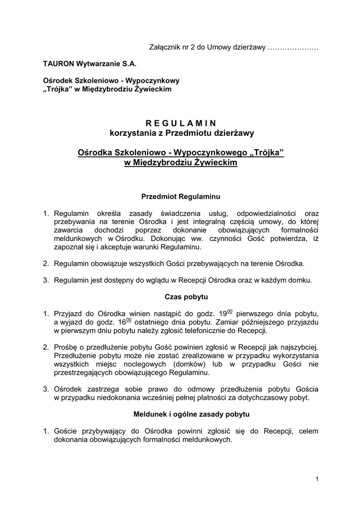 Załącznik nr 2 do Umowy dzierżawy ………………… TAURON Wytwarzanie S.A. Ośrodek Szkoleniowo - Wypoczynkowy „Trójka” w Międzybrodziu Żywieckim REGULAMIN korzystania z Przedmiotu dzierżawy Ośrodka Szkoleniowo - Wypoczynkowego „Trójka” w Międzybrodziu Żywieckim Przedmiot Regulaminu 1. Regulamin określa zasady świadczenia usług, odpowiedzialności oraz przebywania na terenie Ośrodka i jest integralną częścią umowy, do której zawarcia dochodzi poprzez dokonanie obowiązujących formalności meldunkowych w Ośrodku. Dokonując ww. czynności Gość potwierdza, iż zapoznał się i akceptuje warunki Regulaminu. 2. Regulamin obowiązuje wszystkich Gości przebywających na terenie Ośrodka. 3. Regulamin jest dostępny do wglądu w Recepcji Ośrodka oraz w każdym domku. Czas pobytu 1. Przyjazd do Ośrodka winien nastąpić do godz. 19 00 pierwszego dnia pobytu, a wyjazd do godz. 1600 ostatniego dnia pobytu. Zamiar późniejszego przyjazdu w pierwszym dniu pobytu należy zgłosić telefonicznie do Recepcji. 2. Prośbę o przedłużenie pobytu Gość powinien zgłosić w Recepcji jak najszybciej. Przedłużenie pobytu może nie zostać zrealizowane w przypadku wykorzystania wszystkich miejsc noclegowych (domków) lub w przypadku Gości nie przestrzegających obowiązującego Regulaminu. 3. Ośrodek zastrzega sobie prawo do odmowy przedłużenia pobytu Gościa w przypadku niedokonania wcześniej pełnej płatności za dotychczasowy pobyt. Meldunek i ogólne zasady pobytu 1. Goście przybywający do Ośrodka powinni zgłosić się do Recepcji, celem dokonania obowiązujących formalności meldunkowych. 1 2. Ośrodek może odmówić przyjęcia Gościa, który podczas poprzedniego pobytu rażąco naruszył Regulamin, w szczególności poprzez wyrządzenie szkody na mieniu Ośrodka lub mieniu Gości, szkody na osobie Gościa, pracowników Ośrodka lub innych osobach przebywających w Ośrodku. 3. Gość nie może przekazywać domku osobom trzecim, nawet jeśli nie upłynął okres, za który uiścił należną opłatę za pobyt. 4. Osoby niezameldowane w Ośrodku mogą gościnnie przebywać w domku od godziny 800 do godziny 2200. 5. Przyjmowanie i zdawanie domku przez Gości odbywa się przy udziale personelu Ośrodka. 6. Z chwilą otrzymania klucza do domku, Gość jest zobowiązany do sprawdzenia zgodności wyposażenia ze spisem inwentarzowym w celu uniknięcia nieporozumień przy wyjeździe. Usługi 1. Ośrodek zapewnia Gościom: 1) warunki do pełnego i nieskrępowanego wypoczynku, 2) bezpieczeństwo pobytu, w tym bezpieczeństwo zachowania w tajemnicy informacji o Gościach, 3) profesjonalną i uprzejmą obsługę w zakresie wszystkich usług świadczonych w Ośrodku, 4) sprzątanie domku w godzinach 900 - 1500 oraz usuwanie ewentualnych usterek całodobowo. Czynności te wykonywane są co zasady podczas nieobecności Gościa, a w jego obecności tylko wówczas, gdy wyrazi takie życzenie. 2. Goście Ośrodka mogą nieodpłatnie korzystać z: 1) miejsc parkingowych niestrzeżonych znajdujących się na terenie Ośrodka, 2) basenu, 3) placu zabaw dla dzieci, 4) boisk do gry w piłkę nożną/siatkówkę/koszykówkę/badmintona, 5) ping-ponga, 6) „piłkarzyków”. 3. Goście Ośrodka mogą korzystać również z usług sportowo – rekreacyjnych oferowanych przez Ośrodek, zgodnie z cennikiem dostępnym w domkach oraz w Recepcji. 4. Gość ma prawo korzystać z telefonu odpłatnie, a należność należy uregulować w Recepcji, po zakończeniu rozmowy lub w dniu zakończenia pobytu w Ośrodku. 2 5. W przypadku zastrzeżeń dotyczących jakości usług oraz reklamacji, Gość jest proszony o niezwłoczne ich zgłaszanie do Recepcji, co umożliwi pracownikom poprawę standardu świadczonych usług. Odpowiedzialność Gości 1. Dzieci poniżej 12. roku życia powinny znajdować się na terenie Ośrodka pod stałym nadzorem opiekunów prawnych. Opiekunowie prawni ponoszą odpowiedzialność materialną za wszelkie szkody powstałe w wyniku działania dzieci. 2. Gość ponosi pełną odpowiedzialność materialną za wszelkiego rodzaju uszkodzenia lub zniszczenia wyposażenia i urządzeń technicznych Ośrodka, powstałe z jego winy lub z winy odwiedzających go osób. 3. W przypadku naruszenia postanowień Regulaminu, Ośrodek może odmówić świadczenia usług osobie, która je narusza. Osoba taka jest zobowiązana do niezwłocznego zastosowania się do żądań Ośrodka, uregulowania należności za dotychczasowe świadczenia, do zapłaty za ewentualne zniszczenia oraz do opuszczenia Ośrodka. 4. Gość powinien przestrzegać obowiązujących przepisów ppoż., a także zasad bezpieczeństwa, w szczególności: 1) zabrania się korzystania w domkach z dodatkowych urządzeń elektrycznych (tzn. grzałek, kuchenek, grzejników) nie stanowiących wyposażenia domku, 2) gotowanie i przyrządzanie potraw odbywać się może tylko w miejscach do tego przystosowanych, 3) każdorazowo Gość opuszczający domek powinien wyłączyć sprzęt RTV i kuchenkę elektryczną, zamknąć okna, zgasić światło, zakręcić krany oraz zamknąć drzwi na klucz. Odpowiedzialność Ośrodka 1. Ośrodek ponosi odpowiedzialność za utratę lub uszkodzenie rzeczy wniesionych przez osoby korzystające z jego usług w zakresie określonym przepisami kodeksu cywilnego. 2. Gość powinien zawiadomić Recepcję o wystąpieniu szkody niezwłocznie po jej stwierdzeniu. 3. Ośrodek ponosi odpowiedzialność z tytułu utraty lub uszkodzenia pieniędzy, papierów wartościowych i cennych przedmiotów, a także przedmiotów mających wartość naukową lub artystyczną, jeżeli przedmioty te zostały oddane na przechowanie do depozytu Recepcji. 4. Ośrodek zastrzega sobie prawo do odmowy przyjęcia do depozytu przedmiotów o dużej wartości, znacznych kwot pieniężnych, przedmiotów zagrażających 3 bezpieczeństwu oraz przedmiotów wielkogabarytowych, których nie można umieścić w depoz