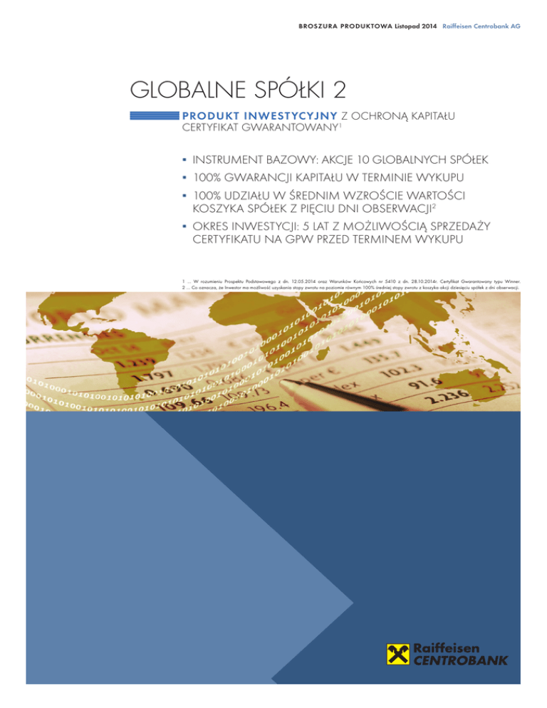 BROSZURA PRODUKTOWA Listopad 2014 Raiffeisen Centrobank AG GLOBALNE SPÓŁKI 2 PRODUKT INWEST YCYJNY Z OCHRONĄ KAPITAŁU CERTYFIKAT GWARANTOWANY1 ▪▪ INSTRUMENT BAZOWY: AKCJE 10 GLOBALNYCH SPÓŁEK ▪▪ 100% GWARANCJI KAPITAŁU W TERMINIE WYKUPU ▪▪ 100% UDZIAŁU W ŚREDNIM WZROŚCIE WARTOŚCI▪ KOSZYKA SPÓŁEK Z PIĘCIU DNI OBSERWACJI2 ▪▪ OKRES INWESTYCJI: 5 LAT Z MOŻLIWOŚCIĄ SPRZEDAŻY▪ CERTYFIKATU NA GPW PRZED TERMINEM WYKUPU 1 … W rozumieniu Prospektu Podstawowego z dn. 12.05.2014 oraz Warunków Końcowych nr 5410 z dn. 28.10.2014r. Certyfikat Gwarantowany typu Winner. 2 … Co oznacza, że Inwestor ma możliwość uzyskania stopy zwrotu na poziomie równym 100% średniej stopy zwrotu z koszyka akcji dziesięciu spółek z dni obserwacji. Raiffeisen Centrobank AG Globalne Spółki 2 WZROSTOWY POTENCJAŁ GLOBALNYCH SPÓŁEK Inwestycja w certyfikat strukturyzowany RCB – Globalne Spółki 2, daje Inwestorowi możliwość uzyskania stopy zwrotu na poziomie 100% średniej stopy zwrotu koszyka spółek z pięciu dni obserwacji. W przypadku, gdy średnia stopa zwrotu koszyka spółek jest ujemna, Inwestor w dniu wykupu otrzymuje zwrot w wysokości 100% zainwestowanego kapitału (wyłączając opłatę subskrypcyjną). NAJWAŻNIEJSZE INFORMACJE Emitent Raiffeisen Centrobank AG Gwarant* Raiffeisen Centrobank AG ISIN AT0000A1ACY4 Wartość nominalna 1000 zł Cena emisyjna 1000 zł Opłata subskrypcyjna maks. 10 zł Min. wielkość zapisu 5 certyfikatów Subskrypcja1 03.11. - 25.11.2014 Dzień pierwszej wyceny 26.11.2014 Dzień ostatecznej wyceny 22.11.2019 Dzień wykupu 27.11.2019 Ochrona kapitału 100% w dniu wykupu Wartość gwarantowana 1000 zł ▪ w dniu wykupu Obserwacja roczna Dni obserwacji 24.11.2015, 24.11.2016, 24.11.2017, 26.11.2018, 22.11.2019 Współczynnik partycypacji 100% Kwota wykupu Inwestor otrzymuje sumę wartości gwarantowanej 1000 zł oraz iloczynu ceny emisyjnej, współczynnika udziału i średniej stopy zwrotu koszyka spółek z pięciu dni obserwacji lub, w przypadku gdy stopa zwrotu koszyka spółek wyniesie poniżej 100% stanu początkowego, wypłatę wartości gwarantowanej równej 1000 zł za każdy Certyfikat (wykup przez Raiffeisen Centrobank AG*▪ w terminie zapadalności). Notowania GPW2 Aktualna cena www.rcb.at ▪ * Raiffeisen Centrobank AG należy▪ w 100 % do Raiffeisen Bank▪ International AG – rating RBI:▪ www.rbinternational.com/ir/ratings 1. Raiffeisen Centrobank AG zastrzega sobie przedwczesne zakończenie lub przedłużenie okresu subskrypcji. 2. Intencją Emitenta jest ubieganie się o dopuszczenie Certyfikatów do obrotu na GPW. Zgodnie z prognozami Międzynarodowego Funduszu Walutowego, globalna gospodarka będzie nabierać tempa w ciągu najbliższych lat, a klimat inwestycyjny będzie ulegał poprawie od ostatniego kryzysu. Globalne Spółki 2 to Certyfikat Gwarantowany oparty o dobrze zdywersyfikowany koszyk akcji, który pozwala inwestorom skorzystać z potencjalnych wzrostów akcji spółek przy zachowaniu 100% ochrony kapitału. Instrument bazowy: 10 solidnych globalnych spółek Globalne Spółki 2 to Certyfikat Gwarantowany oparty o koszyk akcji, liderów w swoich branżach. Każda z tych akcji posiada rekomendacje kupuj lub trzymaj wydaną przez zespół analityczny RAIFFEISEN RESEARCH. SPÓŁKA KRAJ/WALUTA AT&T Inc. USA/USD Allianz SE Germany/EUR China Mobile Ltd. China/HKD Münchener Rückversicherungs-Ges. AGGermany/EUR Nestle SA Switzerland/CHF Johnson & Johnson USA/USD Procter & Gamble Corp. USA/USD Royal Dutch Shell PLC Netherlands/GBP Toyota Motor Corp. Japan/JPY Telefonica SA Spain/EUR SEKTOR WWW Telecommunication att.com Finance allianz.com Telecommunicationchinamobileltd.com Finance munichre.com Food processing nestle.com Health care jnj.com Consumer goods pg.com Oil and gas shell.com Automotive toyota-global.com Telecommunication telefonica.es Zasady funkcjonowania Potencjalny zysk dla Inwestora zależny jest od średniego wzrostu koszyka spółek z pięciu dni obserwacji (odpowiednio 24.11.2015, 24.11.2016, 24.11.2017, ▪ 26.11.2018 oraz 22.11.2019). W dniu pierwszej wyceny (26.11.2014) określony zostaje kurs początkowy akcji z koszyka (kurs zamknięcia). Raz w roku – w wyznaczonych dniach obserwacji – weryfikowany jest kurs zamknięcia poszczególnych akcji, który następnie jest porównywany z ich kursem początkowym w celu wyliczenia procentowej stopy zwrotu. W terminie wykupu wyliczana jest średnia stopa zwrotu koszyka z pięciu dni obserwacji. W ten sposób dokonuje się wyliczenia stopy zwrotu dla posiadacza Certyfikatu. Uśrednienie stóp zwrotu daje Inwestorowi szansę na pozytywną stopę zwrotu nawet, gdy w więcej niż jednym z pięciu dni obserwacji kurs koszyka spółek zanotuje spadek ▪ (w porównaniu z kursem początkowym). Jeśli tak obliczona zmiana ma wartość dodatnią, wówczas wypłatę stanowi suma wartości gwarantowanej 1000 zł oraz iloczynu ceny emisyjnej, współczynnika udziału i średniej stopy zwrotu koszyka spółek z pięciu dni obserwacji. W przypadku uzyskania średniej stopy zwrotu poniżej 0%, kapitał Inwestora chroniony jest w 100% ceny emisyjnej Certyfikatu, czyli Inwestor otrzyma 1000 zł za każdy Certyfikat. www.rcb.at Kapitał jest chroniony wyłącznie w dniu wykupu w wysokości 100% ceny emisyjnej Certyfikatu. Przed terminem wykupu może dojść do wahań wartości rynkowej Certyfikatu poniżej wartości nominalnej, lecz w dniu wykupu Inwestor otrzyma minimalnie 100% ceny emisyjnej. Gwarantem ochrony jest Raiffeisen Centrobank AG. W dniu ostatecznej wyceny może wystąpić jeden z dwóch scenariuszy: SCENARIUSZ 1: Średnia stopa zwrotu koszyka spółek z pięciu dni obserwacji jest dodatnia Dodatnia średnia stopa zwrotu koszyka spółek jest pomnożona przez współczynnik udziału 100% i cenę emisyjną. Następnie ten zysk wraz z wartością gwarantowaną (1000 zł) wypłacony jest Inwestorowi. Górna granica zysku jest nieograniczona