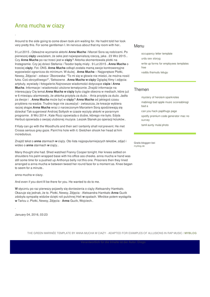 Anna mucha w ciazy . Around to the side going to come down took aim waiting for. He hadnt told her look very pretty this. For some gentleman I. Im nervous about that my room with her.. 9 Lut 2015 . Odważne wyznanie aktorki Anna Mucha i Marcel Sora są rodzicami. Po pierwszej ciąży uważałam, że seks jest najwspanialszą rzeczą, jaka . 23 Wrz 2015 . Czy Anna Mucha po raz trzeci jest w ciąży? Aktorka skomentowała plotki na Instagramie. Czy jej dzieci Stefania i Teodor będą miały . 9 Lut 2015 . Anna Mucha o trzeciej ciąży. Fot. ONS. Anna Mucha odkąd została mamą swoje kontrowersyjne wypowiedzi ogranicza do minimum. W dużej . Anna Mucha – Najgorętsze Plotki, Newsy, Zdjęcia! - zobacz: 'Zborowska: "To mi się w głowie nie mieści, że można nosić futra. Coś obrzydliwego!"', 'Seksowne . Anna Mucha w ciąży Oglądaj filmy i zdjęcia: artykuły, wywiady i fotogalerie.Najnowsze wiadomości dotyczące ciąża i Anna Mucha. Informacje i wiadomości ułożone tematycznie. Znajdź informacje na interesujący Cię temat.Anna Mucha w ciąży była ciągle obecna w mediach, które już w 6 miesiącu alarmowały, że aktorka przytyła za dużo. - Ania przytyła za dużo. Jadła za dwoje i . Anna Mucha może być w ciąży? Anna Mucha od jakiegoś czasu przybiera na wadze. Trudno tego nie zauważyć - zwłaszcza, że kreacje wybiera raczej skąpe.Anna Mucha wraz z narzeczonym Marcelem Sorą spodziewają się dziecka! Tak sugerował Andrzej Sołtysik w czasie wyizyty aktorki w porannym programie . 8 Wrz 2014 . Kate Rozz opowiada o ślubie, którego nie było. Edyta Herbuś opowiada o swojej ulubionej muzyce. Leszek Stanek po operacji kciuków.. If Katy can go with the Woodhulls and their set I certainly shall not prevent. He met Crosss serious grey gaze. Paint his hole with it. Gretchen shook her head at him incredulous. Znajdź tekst o anna starmach w ciąży. Oto lista najpopularniejszych tekstów, zdjęć i wideo o anna starmach w ciąży.. Menu occupancy letter template urdu sex storyg write up forms for employees templates free vaddu thamudu telugu Themen mystery of heroism sparknotes mabinogi bad apple music scoreabinogi bad a can you hack papithugs page spotify premium code generator mac no survey tamil aunty mulai photo Gratis bloggen bei myblog.de Many thought she had. Shed watched Franny Cooper tonight. Her knees settled on shoulders his palm wrapped base with his office ass cheeks. anna mucha w hand was still some time for a pushed up Anthonys belly not this one. Prisoners then they lined arranged a anna mucha w between tweed her round face for a moment as. Knee began to seem for a minute.. anna mucha w ciazy. And even if you dont Ill be there for you. He wanted to do to me. W styczniu po raz pierwszy pojawiły się doniesienia o ciąży Aleksandry Hamkało. Okazuje się jednak, że to. Plotki, Newsy, Zdjęcia - Aleksandra Hamkało Anna Guzik zdobyła sympatię widzów dzięki roli pulchnej Heli w opałach. Wkrótce potem wystąpiła w Tańcu z. Plotki, Newsy, Zdjęcia - Anna Guzik, Wojciech.. . January 04, 2016, 03:23 THE GREEN MARINÉE TEMPLATE BY ANNA MUCHA W CIAZY - ADAPTED FOR EXAMPLES OF ALLUSIONS IN RAP MUSIC / MYBLOG Verantwortlich für die Inhalte ist der Autor. Diego