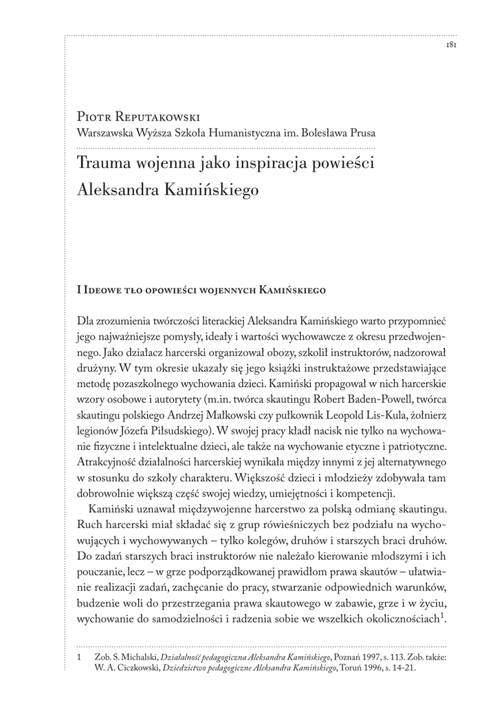 181 Piotr Reputakowski Warszawska Wyższa Szkoła Humanistyczna im. Bolesława Prusa Trauma wojenna jako inspiracja powieści Aleksandra Kamińskiego I Ideowe tło opowieści wojennych Kamińskiego Dla zrozumienia twórczości literackiej Aleksandra Kamińskiego warto przypomnieć jego najważniejsze pomysły, ideały i wartości wychowawcze z okresu przedwojennego. Jako działacz harcerski organizował obozy, szkolił instruktorów, nadzorował drużyny. W tym okresie ukazały się jego książki instruktażowe przedstawiające metodę pozaszkolnego wychowania dzieci. Kamiński propagował w nich harcerskie wzory osobowe i autorytety (m.in. twórca skautingu Robert Baden-Powell, twórca skautingu polskiego Andrzej Małkowski czy pułkownik Leopold Lis-Kula, żołnierz legionów Józefa Piłsudskiego). W swojej pracy kładł nacisk nie tylko na wychowanie fizyczne i intelektualne dzieci, ale także na wychowanie etyczne i patriotyczne. Atrakcyjność działalności harcerskiej wynikała między innymi z jej alternatywnego w stosunku do szkoły charakteru. Większość dzieci i młodzieży zdobywała tam dobrowolnie większą część swojej wiedzy, umiejętności i kompetencji. Kamiński uznawał międzywojenne harcerstwo za polską odmianę skautingu. Ruch harcerski miał składać się z grup rówieśniczych bez podziału na wychowujących i wychowywanych – tylko kolegów, druhów i starszych braci druhów. Do zadań starszych braci instruktorów nie należało kierowanie młodszymi i ich pouczanie, lecz – w grze podporządkowanej prawidłom prawa skautów – ułatwianie realizacji zadań, zachęcanie do pracy, stwarzanie odpowiednich warunków, budzenie woli do przestrzegania prawa skautowego w zabawie, grze i w życiu, wychowanie do samodzielności i radzenia sobie we wszelkich okolicznościach1. 1 Zob. S. Michalski, Działalność pedagogiczna Aleksandra Kamińskiego, Poznań 1997, s. 113. Zob. także: W. A. Ciczkowski, Dziedzictwo pedagogiczne Aleksandra Kamińskiego, Toruń 1996, s. 14-21. I • Rozprawy i materiały 182 Samowychowanie i samokształcenie w zastępie harcerzy miały służyć do przezwyciężania indywidualizmu oraz skłaniać do współpracy, pomocy, życzliwości, bez elementu niezdrowej rywalizacji. Podobne były cele i wartości ruchu oraz metody wychowania zuchowego (dostosowane do możliwości dzieci w wieku od 8 do 11 lat). Zgodnie z koncepcją Kamińskiego zaliczono do nich w owym okresie: uczenie, poprzez gry i zabawy, odwagi, mówienia prawdy, zwinności, zręczności, samodzielności, obserwacji przyrody, przyjaźni i współżycia w zespole, dotrzymywanie słowa; życie zgodnie z przyrzeczeniem prawa zuchowego, na którego treść składały się cztery podstawowe obowiązki: miłość Boga i Polski, bycie dzielnym, dążenie do bycia dobrym i do doskonalenia się. Z podstawowych zasad wynikały zasady i obowiązki szczegółowe: dobra znajomość obyczajów życia zuchowego, punktualność, czystość, pomoc rodzicom itp.2. Dzielność była podstawową kategorią etyczną ruchu zuchowego i harcerskiego. Atmosfera braterskiej życzliwości, promowanie takich postaw, jak uczciwość, gra fair, przestrzeganie przyjętych reguł, ustępowanie i dawanie szansy słabszym, lojalne, szlachetne zachowanie wobec przeciwnika, pokojowe załatwianie sporów oraz zdyscyplinowanie rozumiane jako posłuch i karność wobec przyjętych reguł gry; pokonywanie łez, bólu i cierpienia, przyjmowanie postawy radosnej, wesołej, szanowanie godności – unikanie wyśmiewania, obrażania, poniżania innych zuchów, unikanie obrażania się na innych, pomaganie innym w grze i uczenie ich, wpajanie skromności, unikanie zarozumialstwa. Wszystko to składało się na ideał młodego Polaka kochającego ojczyznę, dzielnego, odpowiedzialnego, odważnego i zaradnego. O tych ideałach i wartościach indywidualnych oraz społecznych będzie ciągle mówił Kamiński, a także bohaterowie jego opowieści wojennych. II Wartość artystyczna, narracja i tematyka utworów wojennych Kamińskiego Niejeden czytelnik ma kłopoty z określeniem wartości literackiej, sposobu narracji oraz tematyki opowieści wojennych Kamińskiego. Większość znawców jego twórczości i teoretyków literatury nie ceni wysoko wartości artystycznej opowieści wojennych Kamińskiego (więcej dyskutuje się o Kamieniach na szaniec) i raczej wypowiada się o nich dosyć krytycznie. Większą uwagę przykuwają uwarunkowania historyczne, społeczno-polityczne i pedagogiczne jego utworów wojennych. Sam autor – historyk z wykształcenia – pisząc opowieści historyczne, sprowadza swoje utwory literackie do pewnego typu pisarstwa historycznego: powieści historycznej, 2 Ibidem. Piotr Reputakowski Trauma wojenna jako inspiracja powieści Aleksandra Kamińskiego 183 biograficznej i literatury faktu. Podkreślić należy ogromną siłę ich perswazyjnego oddziaływania. Na jakie pozaartystyczne wartości zwraca się uwagę? Juliusz Garztecki w 1944 roku, w jednej z pierwszych recenzji Kamieni na szaniec pisał: „«Kamienie na szaniec» należą do książek, których nie można analizować na chłodno. Wiemy przecież bardzo dobrze, że te kilkadziesiąt stroniczek małego formatu nie zawierają żadnego wielkiego osiągnięcia literackiego. Skondensowana opowieść ze wszystkimi wadami i zaletami reportażu”3. Wybitny polski historyk, profesor Janusz Tazbir w artykule Kamienie milowe polskiej świadomości przedstawił wykaz najważniejszych utworów, które jego zdaniem „bądź to najlepiej ukazują umysłowość oraz postawę wielu pokoleń Polaków, bądź też wywarły szczególny wpływ najpierw na losy ich państwa, a następnie na uporczywe dążenie do niepodległości”4. Stosując tak przyjęte kryteria wyboru, prof. Tazbir wyliczył 12 takich dzieł, między innymi: Kroniki Długosza, Pana Tadeusza oraz Księgi narodu polskiego i pielgrzymstwa polskiego Mickiewicza, trylogię Sienkiew