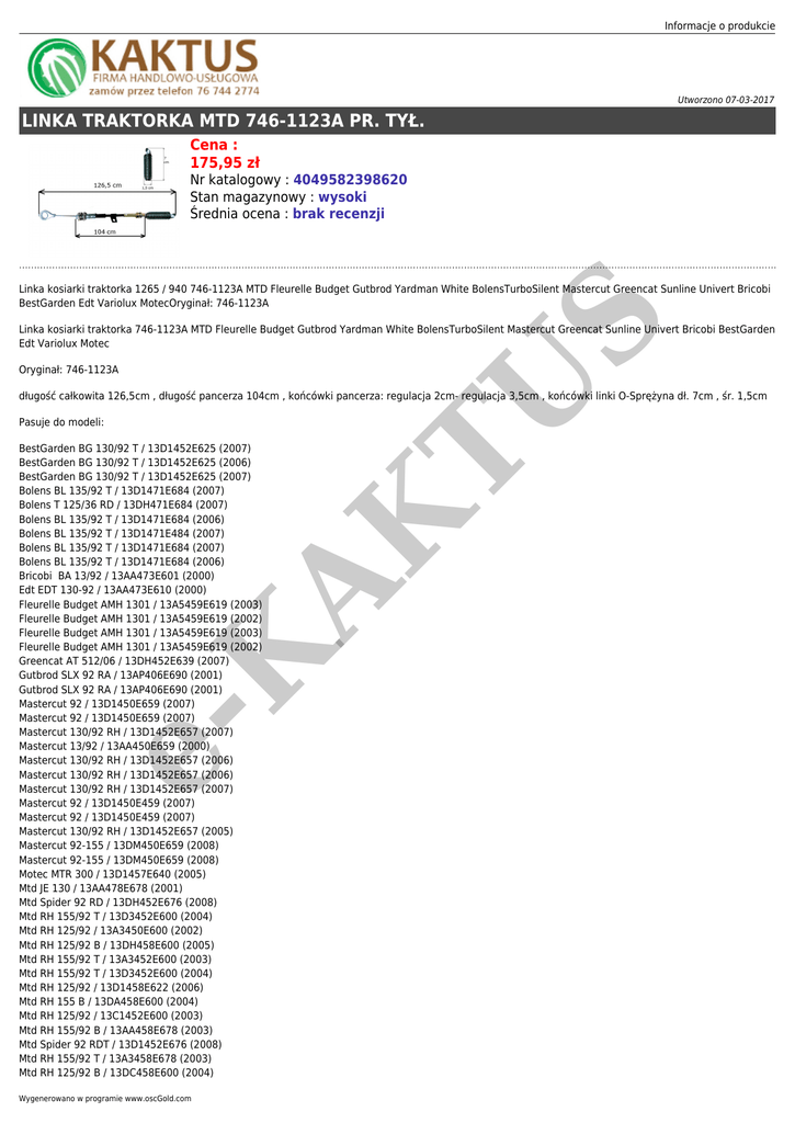 Informacje o produkcie Utworzono 07-03-2017 LINKA TRAKTORKA MTD 746-1123A PR. TYŁ. Cena : 175,95 zł Nr katalogowy : 4049582398620 Stan magazynowy : wysoki Średnia ocena : brak recenzji S Linka kosiarki traktorka 1265 / 940 746-1123A MTD Fleurelle Budget Gutbrod Yardman White BolensTurboSilent Mastercut Greencat Sunline Univert Bricobi BestGarden Edt Variolux MotecOryginał: 746-1123A Linka kosiarki traktorka 746-1123A MTD Fleurelle Budget Gutbrod Yardman White BolensTurboSilent Mastercut Greencat Sunline Univert Bricobi BestGarden Edt Variolux Motec AK TU Oryginał: 746-1123A długość całkowita 126,5cm , długość pancerza 104cm , końcówki pancerza: regulacja 2cm- regulacja 3,5cm , końcówki linki O-Sprężyna dł. 7cm , śr. 1,5cm Pasuje do modeli: eK BestGarden BG 130/92 T / 13D1452E625 (2007) BestGarden BG 130/92 T / 13D1452E625 (2006) BestGarden BG 130/92 T / 13D1452E625 (2007) Bolens BL 135/92 T / 13D1471E684 (2007) Bolens T 125/36 RD / 13DH471E684 (2007) Bolens BL 135/92 T / 13D1471E684 (2006) Bolens BL 135/92 T / 13D1471E484 (2007) Bolens BL 135/92 T / 13D1471E684 (2007) Bolens BL 135/92 T / 13D1471E684 (2006) Bricobi BA 13/92 / 13AA473E601 (2000) Edt EDT 130-92 / 13AA473E610 (2000) Fleurelle Budget AMH 1301 / 13A5459E619 (2003) Fleurelle Budget AMH 1301 / 13A5459E619 (2002) Fleurelle Budget AMH 1301 / 13A5459E619 (2003) Fleurelle Budget AMH 1301 / 13A5459E619 (2002) Greencat AT 512/06 / 13DH452E639 (2007) Gutbrod SLX 92 RA / 13AP406E690 (2001) Gutbrod SLX 92 RA / 13AP406E690 (2001) Mastercut 92 / 13D1450E659 (2007) Mastercut 92 / 13D1450E659 (2007) Mastercut 130/92 RH / 13D1452E657 (2007) Mastercut 13/92 / 13AA450E659 (2000) Mastercut 130/92 RH / 13D1452E657 (2006) Mastercut 130/92 RH / 13D1452E657 (2006) Mastercut 130/92 RH / 13D1452E657 (2007) Mastercut 92 / 13D1450E459 (2007) Mastercut 92 / 13D1450E459 (2007) Mastercut 130/92 RH / 13D1452E657 (2005) Mastercut 92-155 / 13DM450E659 (2008) Mastercut 92-155 / 13DM450E659 (2008) Motec MTR 300 / 13D1457E640 (2005) Mtd JE 130 / 13AA478E678 (2001) Mtd Spider 92 RD / 13DH452E676 (2008) Mtd RH 155/92 T / 13D3452E600 (2004) Mtd RH 125/92 / 13A3450E600 (2002) Mtd RH 125/92 B / 13DH458E600 (2005) Mtd RH 155/92 T / 13A3452E600 (2003) Mtd RH 155/92 T / 13D3452E600 (2004) Mtd RH 125/92 / 13D1458E622 (2006) Mtd RH 155 B / 13DA458E600 (2004) Mtd RH 125/92 / 13C1452E600 (2003) Mtd RH 155/92 B / 13AA458E678 (2003) Mtd Spider 92 RDT / 13D1452E676 (2008) Mtd RH 155/92 T / 13A3458E678 (2003) Mtd RH 125/92 B / 13DC458E600 (2004) Wygenerowano w programie www.oscGold.com eK S AK TU Mtd RH 125/92 / 13AL458E600 (2003) Mtd JE 130 / 13AA478E678 (2001) Mtd RH 125/92 / 13D1458E622 (2007) Mtd 125/92 / 13AH455E600 (2002) Mtd RH 125/92 / 13D1452E600 (2005) Mtd RH 155/92 / 13DA450E600 (2004) Mtd JE 130 / 13AA478E678 (2000) Mtd RH 155/92 / 13DA450E600 (2004) Mtd RH 125/92 / 13D1452E600 (2006) Mtd RH 155 B / 13DA458E600 (2004) Mtd RH 125/92 / 13D1452E400 (2006) Mtd JE 130 / 13AA478E678 (2000) Mtd RH 125/92 B / 13AC458E600 (2003) Mtd RH 125/92 / 13D1452E600 (2007) Mtd Eurotrac 155/92 / 13AP475E600 (2001) Mtd RH 125/92 / 13D1458E622 (2006) Mtd RH 125/92 / 13D1452E600 (2005) Mtd RH 125/92 B / 13DH458E600 (2005) Mtd Spider 92 RD / 13DH452E467 (2008) Mtd RH 125/92 / 13D1452E600 (2006) Mtd RH 125/92 / 13D1452E600 (2004) Mtd Spider 92 RD / 13DH452E676 (2008) Mtd RH 125/92 B / 13DC458E600 (2004) Mtd RH 125/92 / 13D1452E600 (2004) Mtd RH 125/92 / 13D1452E400 (2007) Mtd RH 125/92 / 13D1452E400 (2006) Mtd RH 125/92 B / 13AC458E600 (2003) Mtd RH 125/92 / 13A3458E600 (2003) Mtd 125/92 / 13AH455E600 (2002) Sunline SL-H 1303 / 13D1473E685 (2007) Sunline SL-H 1303 / 13D1479E685 (2006) Sunline SL-H 1303 / 13D1479E685 (2007) Sunline SL-H 1303 / 13D1473E685 (2007) Sunline SL-H 1303 / 13D1473E685 (2006) Sunline SL-H 1303 / 13D1479E685 (2006) TurboSilent MXRH 125/92 / 13D1458E667 (2006) TurboSilent TSRH 125/92 / 13A1458E667 (2003) TurboSilent MXRH 125/92 / 13D1458E667 (2007) TurboSilent MXRH 125/92 / 13D1458E667 (2006) TurboSilent TSRH 125/92 / 13A1458E667 (2003) Univert 130 ENC / 13AA47UE663 (2000) Univert 145 ENCH / 13AP41UE663 (2000) Variolux 92-155 / 13EM450E620 (2008) Variolux 92-155 / 13EM450E620 (2008) White LRE 145 / 13AP473E680 (2000) White W 13/92 / 13AA473E682 (2000) White LRE 145 / 13AP473E680 (2000) Yardman AE 4145 / 13AP404E643 (2002) Yardman TE 4125 / 13DH473E643 (2007) Yardman TE 4125 / 13DH473E643 (2005) Yardman AE 4145 / 13AP404E643 (2001) Yardman AT 512/06 / 13DH452E439 (2006) Yardman AT 512/06 / 13DH452E439 (2006) Yardman AT 512/06 / 13DH452E439 (2007) Yardman AE 4145 / 13AP404E643 (2002)
