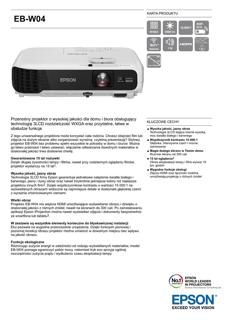 KARTA PRODUKTU EB-W04 Przenośny projektor o wysokiej jakości dla domu i biura obsługujący technologię 3LCD rozdzielczość WXGA oraz przydatne, łatwe w obsłudze funkcje Z tego uniwersalnego projektora może korzystać cała rodzina. Chcesz obejrzeć film lub zdjęcia na dużym ekranie albo zorganizować wyraźną, czytelną prezentację? Stylowy projektor EB-W04 bez problemu spełni wszystkie te potrzeby w domu i biurze. Można go łatwo przenosić i łatwo ustawiać; włączenie odtwarzania dowolnych materiałów w doskonałej jakości trwa dosłownie chwilę. Gwarantowane 15 lat rozrywki Dzięki długiej żywotności lampy i filtrów, nawet przy codziennym oglądaniu filmów, projektor wystarczy na 15 lat1. Wysoka jakość, jasny obraz Technologia 3LCD firmy Epson gwarantuje jednakowe natężenie światła białego i barwnego, jasny i żywy obraz oraz nawet trzykrotnie jaśniejsze kolory niż najlepsze projektory innych firm2. Dzięki współczynnikowi kontrastu o wartości 15 000:1 na wyświetlanych obrazach widoczne są najmniejsze detale w doskonale głębokiej czerni z wyraźnie zróżnicowanymi cieniami. Wielki obraz Projektor EB-W04 ma wejścia HDMI umożliwiające wyświetlanie obrazu i dźwięku o doskonałej jakości z różnych źródeł, nawet na ekranach do 300 cali. Po zainstalowaniu aplikacji Epson iProjection można nawet wyświetlać zdjęcia i dokumenty bezpośrednio ze smartfona lub tabletu3. W zestawie są wszystkie elementy konieczne do błyskawicznej instalacji Etui pozwala na wygodne przenoszenie urządzenia. Dzięki funkcjom pionowej i poziomej korekcji obrazu projektor można umieścić w dowolnym miejscu bez wpływu na jakość obrazu. Funkcje ekologiczne Różnicując zużycie energii w zależności od rodzaju wyświetlanych materiałów, model EB-W04 pomaga ograniczyć pobór mocy, natomiast tryb eco sprzyja ogólnej oszczędności zużycia prądu i wydłużeniu czasu eksploatacji lampy. KLUCZOWE CECHY Wysoka jakość, jasny obraz Technologia 3LCD dająca równie wysoką moc światła białego i barwnego Współczynnik kontrastu 15 000:1 Głęboka, intensywna czerń i mocne cieniowanie Magia dużego ekranu w Twoim domu Rozmiar ekranu od 300 cali 15 lat oglądania1 Okres eksploatacji lampy i filtra wynosi 10 tys. godzin Wygodne funkcje obsługi Złącza HDMI oraz łączność mobilna umożliwiają projekcję z różnych źródeł SPECYFIKACJE PRODUKTU TECHNIKA System projekcyjny Technologia 3LCD Panel LCD 0,59 cal z MLA (D9) OBRAZ Natężenie światła barwnego 3.000 lumen-2.100 lumen (tryb ekonomiczny) zgodne z normą ISO IDMS15.4 Natężenie światła białego 3.000 lumen - 2.100 lumen (tryb ekonomiczny) zgodne z normą ISO 21118:2012 Rozdzielczość WXGA, 1280 x 800, 16:10 Stosunek kontrastu 15.000 : 1 Lampa 200 W, 5.000 h Żywotność, 10.000 h Żywotność (w trybie oszczędnym) Korekcja obrazu Auto pionowo: ± 30 °, Ręczna obsługa (lub "Instrukcja obsługi") poziomo ± 30 ° Odwzorowanie kolorów Do 1,07 mld kolorów High Definition HD ready UKŁAD OPTYCZNY Stosunek projekcji 1,30 - 1,56:1 Zoom Manual, Factor: 1,2 Rozmiar projekcji 33 cale - 320 cale Odległość wyświetlania, tryb 1,68 m - 2,02 m (60 cal ekran) szerokokątny/tele Wartość przesłony obiektywu 1,58 - 1,72 projekcyjnego Odległość ogniskowa 16,9 mm - 20,28 mm Fokus Ręcznie Przesunięcie 10 : 1 ZŁĄCZA Funkcja USB wyświetlacza 3 w 1: obraz / mysz / dźwięk Przyłącza Złącze USB 2.0 typu A, Złącze USB 2.0 typu B, Bezprzewodowa sieć LAN IEEE 802.11b/g/n (opcja), Wejście VGA, Wejście HDMI, Wejście sygnału kompozytowego, Wejście S-Video, Wejście audio typu cinch Połączenie ze smartfonem Ad-hoc/Infrastruktura ZAAWANSOWANE FUNKCJE Bezpieczeństwo Zamek Kensington, Kłódka, Otwór na linkę zabezpieczającą, Blokada modułu bezprzewodowej sieci LAN, Bezpieczeństwo bezprzewodowej sieci LAN, Ochrona hasłem 3D Nie Funkcje Suwak wyłączania obrazu/dźwięku, Wbudowany głośnik, Włączanie/wyłączanie bezpośrednie, Kompatybilny ze skanerem dokumentów, Pozioma i pionowa korekcja geometrii obrazu, Długa żywotność lampy, Projekcja sieciowa, Funkcja kopiowania OSD, Bez komputera, Funkcja podziału ekranu, Możliwość połączenia z bezprzewodową siecią LAN, Konfiguracja iProjection kodem QR Tryby kolorów Tablica, Kino, Dynamiczny, Prezentacja, sRGB INFORMACJE OGÓLNE Zużycie energii 277 W, 207 W (tryb ekonomiczny), 0,26 W (w trybie czuwania) Wymiary produktu 297 x 234 x 77 mm (Szerokość x Głębokość x Wysokość) Waga produktu 2,4 kg Poziom hałasu Tryb normalny: 37 dB (A) - Tryb ekonomiczny: 28 dB (A) Załączone oprogramowanie EasyMP Monitor, EasyMP Multi PC Projection, EasyMP Network Projection Głośniki 1W INNE Gwarancja 24 miesiące/miesięcy Klient zanosi do serwisu, Lampa: 12 miesiące/miesięcy lub 1.000 h Dostępne opcjonalne przedłużenie gwarancji EB-W04 ZAWARTOŚĆ ZESTAWU Torba transportowa Kabel komputerowy Urządzenie podstawowe Kabel zasilający Pilot z bateriami Zestaw instrukcji obsługi Dokumenty gwarancyjne OPCJONALNE AKCESORIA EB-W04 Adapter - ELPAP10 Wireless LAN b/g/n V12H731P01 Air Filter - ELPAF32 V13H134A32 Ceiling Mount ELPMB23 (EB-G5000 series) V12H003B23 Pipe 450mm Silver ELPFP13 (EB-G5000 series) V12H003P13 Pipe 700mm Silver ELPFP14 (EB-G5000 series) V12H003P14 Lamp - ELPLP88 - EB-9xxH/S27/X27/W29 V13H010L88 Quick Wireless Connect USB key - ELPAP09 V12H005M09 80" 16:10 Pull-up Screen (ELPSC24) V12H002S24 Silk Screen ELPSC26 V12H002S26 INFORMACJA LOGISTYCZNA SKU V11H718040 Kod kreskowy 8715946552293 Wymiary opakowania pojedynczego 350 x 360 x 160 mm Waga pudełka 3,83 kg szt. 1 Liczba jednostek Kraj pochodzenia Filipiny Rozmiar palety 78 szt. (6 x 13) Epson Europe B.V. Sp. z o.o. Oddział w Polsce ul. Bokserska 66 02-690 Warszawa Tel.: +48 22 375 7500 Faks: +48 22 375 7501 Infolinia: 801 64 64 53 (Opłata za połączenie wg taryfy operatora.) www.epson.pl Znaki towarowe oraz zastrzeżone znaki towarowe są własnością