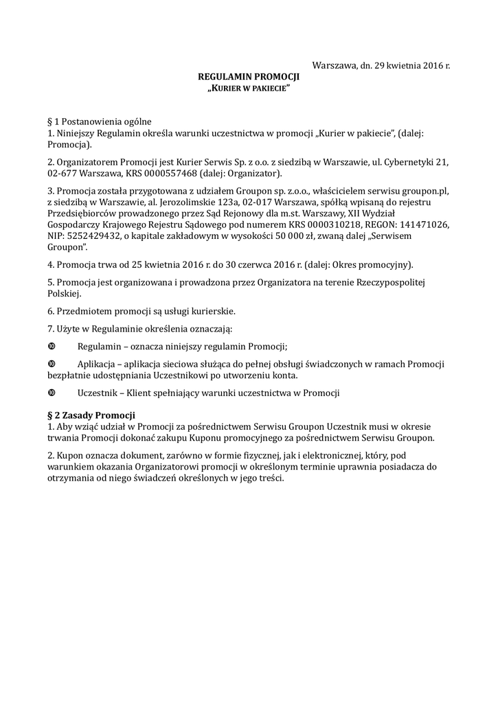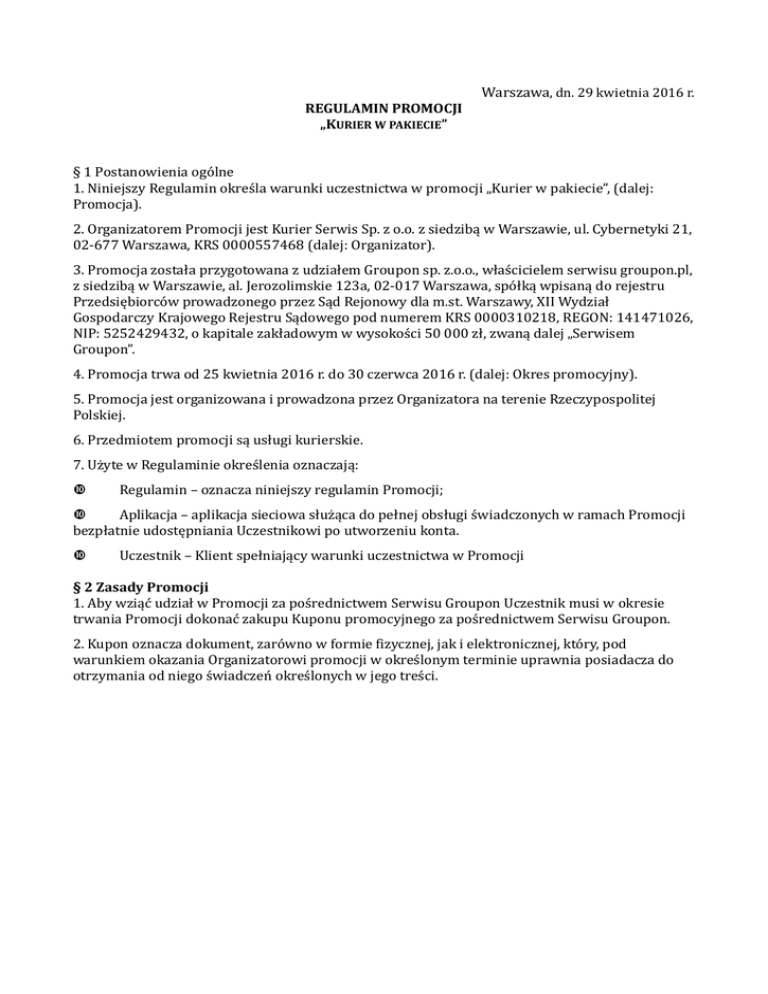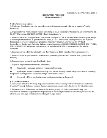 REGULAMIN PROMOCJI „KURIER W PAKIECIE” Warszawa, dn. 29 kwietnia 2016 r. § 1 Postanowienia ogólne 1. Niniejszy Regulamin określa warunki uczestnictwa w promocji „Kurier w pakiecie”, (dalej: Promocja). 2. Organizatorem Promocji jest Kurier Serwis Sp. z o.o. z siedzibą w Warszawie, ul. Cybernetyki 21, 02-677 Warszawa, KRS 0000557468 (dalej: Organizator). 3. Promocja została przygotowana z udziałem Groupon sp. z.o.o., właścicielem serwisu groupon.pl, z siedzibą w Warszawie, al. Jerozolimskie 123a, 02-017 Warszawa, spółką wpisaną do rejestru Przedsiębiorców prowadzonego przez Sąd Rejonowy dla m.st. Warszawy, XII Wydział Gospodarczy Krajowego Rejestru Sądowego pod numerem KRS 0000310218, REGON: 141471026, NIP: 5252429432, o kapitale zakładowym w wysokości 50 000 zł, zwaną dalej „Serwisem Groupon”. 4. Promocja trwa od 25 kwietnia 2016 r. do 30 czerwca 2016 r. (dalej: Okres promocyjny). 5. Promocja jest organizowana i prowadzona przez Organizatora na terenie Rzeczypospolitej Polskiej. 6. Przedmiotem promocji są usługi kurierskie. 7. Użyte w Regulaminie określenia oznaczają: Regulamin – oznacza niniejszy regulamin Promocji; Aplikacja – aplikacja sieciowa służąca do pełnej obsługi świadczonych w ramach Promocji bezpłatnie udostępniania Uczestnikowi po utworzeniu konta. Uczestnik – Klient spełniający warunki uczestnictwa w Promocji § 2 Zasady Promocji 1. Aby wziąć udział w Promocji za pośrednictwem Serwisu Groupon Uczestnik musi w okresie trwania Promocji dokonać zakupu Kuponu promocyjnego za pośrednictwem Serwisu Groupon. 2. Kupon oznacza dokument, zarówno w formie fizycznej, jak i elektronicznej, który, pod warunkiem okazania Organizatorowi promocji w określonym terminie uprawnia posiadacza do otrzymania od niego świadczeń określonych w jego treści. 3. Warunkiem realizacji Kuponu promocyjnego jest założenie konta na stronie internetowej kurier-serwis.pl. Termin ważności konta uczestnika nie jest ograniczony czasem obowiązywania Promocji. 4. Kupon realizowany jest poprzez przypisanie na koncie uczestnika określonej ilości usług odpowiadających warunkom przedstawionym w serwisie Groupon. 6. Ceny usług obowiązujące w ramach niniejszej promocji wskazane są w załączniku nr 1 do regulaminu. Usługi wskazane w cenniku stanowią jednocześnie zamknięty katalog usług oferowanych przez Organizatora w ramach promocji. 7. Pozostałe warunki świadczenia usług będących przedmiotem promocji zostały wskazane w Regulaminie świadczenia usług pocztowych i przewozowych przez Kurier Serwis Sp. z o.o. dla Konsumentów dostępnym na stronie internetowej http://kurierserwis.pl/downloads/Kurier_Serwis_Regulamin%20us%C5%82ug.pdf § 3 Reklamacje 1. Reklamacje dotyczące Promocji winny być zgłaszane Organizatorowi pisemnie, na adres [email protected] w terminie 30 dni od daty zakończenia Promocji. 2. Reklamacja powinna zawierać dokładny opis i powód reklamacji, w tym: datę i czas zajścia okoliczności będącej przedmiotem reklamacji, w danym wypadku adres e-mail i numer telefonu kontaktowego wnoszącego reklamację oraz zwięzły opis zgłaszanych zastrzeżeń. 3. Reklamacje są rozpatrywane w ciągu 30 dni od daty ich otrzymania. 4. O sposobie rozpatrzenia reklamacji osoba składająca reklamację poinformowana zostanie pocztą elektroniczną, na wskazany adres email podany w reklamacji. 5. Decyzja Organizatora Promocji w przedmiocie rozpatrywanej reklamacji jest decyzją ostateczną w ramach prowadzonego przez Organizatora Promocji postępowania reklamacyjnego, co nie wyłącza ani nie ogranicza uprawnień Uczestnika do dochodzenia swoich roszczeń na podstawie powszechnie obowiązujących przepisów prawa. § 4 Postanowienia końcowe 1. Uczestnictwo w Promocji oznacza akceptację zasad określonych w niniejszym Regulaminie. 2. Niniejszy regulamin wchodzi w życie wraz z rozpoczęciem Promocji. 3. Niniejszy Regulamin jest jedynym dokumentem określającym zasady Promocji. Materiały reklamowe mają jedynie charakter promocyjno-informacyjny i nie stanowią oferty w rozumieniu przepisów Kodeksu Cywilnego. 4. Organizator zastrzega sobie prawo wykluczenia Uczestnika z Promocji ze skutkiem natychmiastowym, w przypadku stwierdzenia naruszenia postanowień Regulaminu, mogących mieć wpływ na przyznanie rabatu wskazanego w § 2 ust. 2 Regulaminu. W takim wypadku Uczestnik promocji będzie zobowiązany do zwrotu przyznanego rabatu. 5. W sprawach nieuregulowanych niniejszym Regulaminem stosuje się odpowiednio przepisy ustawy z dnia 23 kwietnia 1964 r. - Kodeks cywilny (Dz.U. 1964 nr 16 poz. 93). 6. Wszelkie spory mogące wyniknąć w związku z realizacją Promocji będą rozstrzygane przez sąd właściwy miejscowo dla siedziby Organizatora Promocji. 7. Organizator Promocji zastrzega sobie prawo do dokonania zmian w niniejszym Regulaminie lub zawieszenia Promocji w każdym czasie bez podania przyczyny, z zastrzeżeniem praw uprzednio nabytych. Zmieniony Regulamin zostanie opublikowany na stronie internetowej http://www.twoj.inpost.pl. Załączniki: 1. Cennik usług objętych promocją Załącznik Nr 1 – Cennik usług objętych promocją 1. Paczka do 5kg + ubezpieczenie do kwoty 5000 zł - 5 szt. PLN79,89 2. Paczka do 5kg + ubezpieczenie do kwoty 5000 zł - 10 szt. PLN153,63 3. Paczka do 5kg + ubezpieczenie do kwoty 5000 zł - 20 szt. PLN294,95 4. Paczka do 5kg + ubezpieczenie do kwoty 5000 zł - 50 szt. PLN706,64 5. Paczka do 5kg + ubezpieczenie do kwoty 5000 zł - 100 szt. PLN1290,27 6. Paczka do 30kg + ubezpieczenie do kwoty 5000 zł - 5 szt. PLN82,96 7. Paczka do 30kg + ubezpieczenie do kwoty 5000 zł - 10 szt. PLN159,9 8. Paczka do 30kg + ubezpieczenie do kwoty 5000 zł - 20 szt. PLN307,25 9. Paczka do 30kg + ubezpieczenie do kwoty 5000 zł - 50 szt. PLN737,39 10. Paczka do 30kg + ubezpieczenie do kwoty 5000 zł -100 szt. PLN1351,77 11. Paczka do 5kg z usługą pobranie + ubezpieczenie do kwoty 5000 zł - 5 szt. PLN82,9