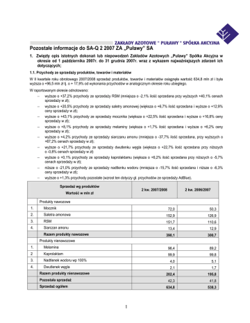Pozostałe informacje do SA-Q 2 2007 ZA „Puławy” SA 1. Zwięzły opis istotnych dokonań lub niepowodzeń Zakładów Azotowych „Puławy” Spółka Akcyjna w okresie od 1 października 2007r. do 31 grudnia 2007r. wraz z wykazem najważniejszych zdarzeń ich dotyczących; 1.1. Przychody ze sprzedaży produktów, towarów i materiałów W II kwartale roku obrotowego 2007/2008 sprzedaż produktów, towarów i materiałów osiągnęła wartość 634,8 mln zł i była wyższa o +96,5 mln zł tj. o + 17,9% od wykonania przychodów w analogicznym okresie roku ubiegłego. W raportowanym okresie odnotowano: − wyższe o +37,2% przychody ze sprzedaży RSM (mniejsza o -2,1% ilość sprzedana przy wyższych +40,1% cenach sprzedaży w zł); − wyższe o +20,5% przychody ze sprzedaży saletry amonowej (większa o +6,7% ilość sprzedana i wyższe o +12,9% ceny sprzedaży w zł); − wyższe o +43,1% przychody ze sprzedaży mocznika (większa o +22,5% ilość sprzedana i wyższe o +16,8% ceny sprzedaży w zł); − wyższe o +8,1% przychody ze sprzedaży melaminy (większa o +1,7% ilość sprzedana i wyższe o +6,2% ceny sprzedaży w zł); − wyższe o +4,2% przychody ze sprzedaży siarczanu amonu (mniejsza o -37,7% ilość sprzedana, przy wyższych o +67,2% cenach sprzedaży w zł); − wyższe o +21,7% przychody ze sprzedaży dwutlenku węgla (większa o +22,7% ilość sprzedana przy niższych o -0,8% cenach sprzedaży w zł) − wyższe o +0,1% przychody ze sprzedaży kaprolaktamu (większa o +6,2% ilość sprzedana przy niższych o -5,7% cenach sprzedaży w zł); − niższe o -21,0% przychody ze sprzedaży nadtlenku wodoru (mniejsza o -15,7% ilość sprzedana i niższe o -6,3% ceny sprzedaży w zł); − wyższe o +1,3% przychody pozostałe (wzrost ten dotyczy gł. przychodów ze sprzedaży AdBlue). Sprzedaż wg produktów 2 kw. 2007/2008 Wartość w mln zł 2 kw. 2006/2007 Produkty nawozowe 1. Mocznik 72,0 50,3 2. Saletra amonowa 152,9 126,9 3. RSM 151,7 110,6 4. Siarczan amonu 13,4 12,9 390,1 300,7 Razem produkty nawozowe Produkty nienawozowe 1. Melamina 96,4 89,2 2 Kaprolaktam 99,9 99,8 3. Nadtlenek wodoru wp 100% 4,0 5,1 4. Dwutlenek węgla 2,1 1,7 202,4 195,8 42,3 41,8 634,8 538,3 Razem produkty nienawozowe Pozostała sprzedaż Sprzedaż ogółem 1 Sprzedaż produktów nawozowych i nienawozowych wyniosła 592,5 mln zł i była wyższa od wykonanej w analogicznym okresie roku ub. o + 96,0 mln zł tj. o +19,3%. Sprzedaż głównych produktów Ilość w tonach 1. Produkty nawozowe 2. Produkty nienawozowe 2 kw. 2007/2008 2 kw. 2006/2007 534 590 528 364 52 567 49 715 W raportowanym okresie w relacji do analogicznego okresu roku ubiegłego odnotowano większą tonażowo sprzedaż zarówno produktów nawozowych (tj. o +1,2%) jak i nienawozowych (tj. o +5,7%). Udział eksportu w danej kategorii przychodów ze sprzedaży 2 kw. 2007/2008 2 kw. 2006/2007 1. Produkty nawozowe 43,2% 41,3% 2. Produkty nienawozowe 74,1% 72,0% 3. Pozostała sprzedaż *) 10,3% 0,1% Sprzedaż ogółem 50,9% 49,3% * w tym: uwzględniono sprzedaż towarów i materiałów. W związku z tym, że Spółka posiada duży udział eksportu w sprzedaży ogółem istotny wpływ na przychody z eksportu w poszczególnych kategoriach produktów miała aprecjacja złotówki wobec walut. Większość obrotów Spółka realizuje w EUR. Na podstawie średnich kursów NBP szacuje się, że w m-cach październik - grudzień 2007r. w relacji do analogicznego okresu roku ubiegłego złoty umocnił się wobec EUR o 1,7% i wobec USD o 9,4%. Wzrost udziału eksportu w przychodach ze sprzedaży: • produktów nawozowych Spółki wynika głównie z większej niż w kraju dynamiki cen sprzedaży, pomimo mniejszej tonażowo ilości skierowanej na eksport i odnotowanej aprecjacji złotego względem walut (głównie EUR i USD); • produktów nienawozowych wynika głównie z większej niż w kraju dynamiki cen i ilości sprzedanej kaprolaktamu na eksport; • pozostałych produktów wynika ze zrealizowanej w bieżącym okresie, sprzedaży c-nonu na eksport w ramach wolnych zasobów Spółki (c-non jest półfabrykatem do produkcji kaprolaktamu). W II kwartale roku 2006/2007 Spółka realizowała sprzedaż zgodnie z przyjętą strategią w oparciu o podpisane kontrakty. Struktura sprzedaży w podziale na rynek krajowy i eksportowy wynikała z bieżących trendów cenowych oraz z kształtowania się popytu na rynku wewnętrznym. 1.2. Średnia rentowność produktów Średnia rentowność sprzedaży grup produktów w tabeli poniżej, wyrażona jest jako relacja marży na sprzedaży produktów po pokryciu sumy technicznego kosztu wytworzenia produktów sprzedanych i kosztów sprzedaży do przychodów ze sprzedaży. Grupa produktów Rok 2007/2008 Rok 2006/2007 I kw.***) II kw. I-IV kw. I kw. II kw. III kw. IV kw. Produkty nawozowe* 11 - 15% 22-27% 8% - 22% 3% - 14% 2% - 24% 8% - 24% 12% - 24% Produkty nienawozowe** 7 - 16% 13-19% -1% - 19% 3% - 20% 7% - 24% 3% - 17% -16% - 12% Pozostała sprzedaż 5% 9% 6% 6% 5% 7% 6% Razem 11% 19% 10% 6% 9% 16% 10% * Grupa zawiera RSM, mocznik, saletrę amonową. Nie zawiera siarczanu amonu. ** Grupa zawiera melaminę, kaprolaktam łącznie z siarczanem amonu (jako produkt uboczny kaprolaktamu) oraz nadtlenek wodoru. ***) Doprowadzono do porównywalności grupę produktów nienawozowych i pozostałą sprzedaż. 2 1.3. Koszty operacyjne Koszty operacyjne wg rodzaju 2 kw. 2007/2008 2 kw. 2006/2007 Wartość w mln zł 1. Amortyzacja 17,8 24,7 2. Zużycie materiałów i energii, w tym: 359,4 343,3 198,1 181,8 Zużycie energii elektrycznej 45,8 53,2 Zużycie benzenu 46,0 52,1 Zużycie węgla 28,1 26,1 Zużycie gazu ziemnego 3. Podatki i opłaty 17,0 16,4 4. Wynagrodzenia 34,9 34,0 5. Ubezpieczenia społeczne 8,4 8,4 6. Pozostałe koszty rodzajowe 79,0 74,1 Koszty wg rodzaju razem 516,5 500,8 7. Zmiana stanu zapasów produktów i produkcji w toku i RMK 0,7 2,2 8. Koszt wytworzenia produktów na własne potrzeby 6,4 8,1 9. 