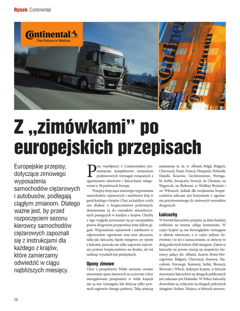 Rynek Continental Z ,,zimówkami’’ po europejskich przepisach P rzy współpracy z Continentalem pre- zastaniemy m. in. w: Albanii, Belgii, Bułgarii, Europejskie przepisy, zentujemy kompleksowe zestawienie Chorwacji, Danii, Francji, Hiszpanii, Holandii, dotyczące zimowego podstawowych wymagań związanych z Irlandii, Kosowie, Liechtensteinie, Portugaogumieniem zimowym i łańcuchami śniego- lii, Serbii, Szwajcarii, Szwecji, na Ukrainie, na wyposażenia wymi w 38 państwach Europy. Węgrzech, na Białorusi, w Wielkiej Brytanii i samochodów ciężarowych Przepisy dotyczące zimowego wyposażenia we Włoszech. Jednak dla zwiększenia bezpiesamochodów ciężarowych i autobusów leżą w czeństwa zalecane jest korzystanie z ogumiei autobusów, podlegają gestii każdego z krajów. Choć za każdym z nich nia przystosowanego do zimowych warunków ciągłym zmianom. Dlatego stoi dbałość o bezpieczeństwo podróżnych, drogowych. dostosowane są do warunków atmosferyczważne jest, by przed nych panujących w każdym z krajów. Choćby Łańcuchy rozpoczęciem sezonu z tego względu poruszanie się po europejskim W kwestii łańcuchów przepisy są dużo bardziej prawie drogowym przypomina istny slalom gi- rozbieżne na terenie całego kontynentu. W kierowcy samochodów gant. Wyposażenie ciężarówek i autobusów w części krajów są one bezwzględnie wymagane ciężarowych zapoznali odpowiednie ogumienie oraz inne akcesoria, w okresie zimowym, a w części jedynie dotakie jak: łańcuchy, łopaty śniegowe czy opony zwolone i to też z zaznaczeniem, że dotyczy to się z instrukcjami dla z kolcami, pozwala nie tylko zapewnić najwyż- dróg pokrytych lodem i/lub śniegiem. Zatem w każdego z krajów, szy poziom bezpieczeństwa na drodze, ale też łańcuchy na pewno muszą się zaopatrzyć kieuniknąć wysokich kar pieniężnych. rowcy jadący do: Albanii, Austrii, Bośni-Herktóre zamierzamy cegowiny, Bułgarii, Chorwacji, Kosowa, Maodwiedzić w ciągu Opony zimowe cedonii, Norwegii, Rumunii, Serbii, Słowacji, Choć z perspektywy Polski możemy uważać Słowenii i Włoch. Jedynym krajem, w którym najbliższych miesięcy. stosowanie opon zimowych za oczywiste (choć stosowanie łańcuchów na drogach publicznych nieregulowane przepisami) w wielu krajach nie są one wymagane lub dotyczą tylko pewnych regionów danego państwa. Taką sytuację 28 jest zakazane jest Holandia. W Polsce łańcuchy dozwolone są wyłącznie na drogach pokrytych śniegiem i lodem. Miejsca, w których stosowa- nie łańcuchów jest obowiązkowe są oznaczone odpowiednimi znakami drogowymi. Opony z kolcami W wielu krajach, ze względu na dbałość o stan nawierzchni, zabronione jest używanie opon z kolcami. Do krajów tych należą: Albania, Belgia, Bośnia-Hercegowina, Bułgaria, Chorwacja, Czarnogóra, Czechy, Holandia, Kosowo, Luksemburg, Macedonia, Polska, Portugalia, Rumunia, Serbia, Słowacja, Słowenia i Węgry. Jednak przemierzając europejskie trasy warto prześledzić, w jakim terminie na danym terenie użycie opon z kolcami jest dozwolone. Okresowo takie opony można stosować m. in. w Danii, Finlandii, Liechtensteinie, na Litwie, Łotwie, w Norwegii, Rosji, Szwajcarii. Wyposażenie dodatkowe Cześć krajów europejskich stawia dodatkowe wymagania przed kierującymi samochodami ciężarowymi i autobusami. I tak np. w: BośniHercegowinie, Chorwacji, Kosowie, Macedonii Z uwagi o nawierzchnię w wielu krajach zakazano używania opon z kolcami Fot. Continental i Serbii wymagane jest przewożenie łopaty do śniegu. A jak na tle europejskich wyglądają polskie przepisy? – W Polsce nie obowiązują przepisy nakazujące wymianę opon na zimowe w pojazdach ciężarowych i autobusach. Mimo to Continental rekomenduje stosowanie ogumienia o głębokości bieżnika nie mniejszej niż 4 mm, które pozwoli na odpowiednie odprowadzanie błota pośniegowego, a także zapewni krótszą drogą hamowania i dobrą przyczepność. Ponadto, polskie prawo pozwala używać łańcuchów śniegowych wyłącznie na drogach pokrytych śnie- giem i lodem, i tylko w miejscach oznaczonych właściwymi znakami drogowymi – powiedział Marcin Cywiński, Marketing i PR Manager Działu Opon do Samochodów Ciężarowych w Continental Opony Polska. Ze względu na brak wspólnych przepisów dla wszystkich krajów, warto zapoznać się z przepisami kraju docelowego i wszystkich państw mijanych po drodze. Pozwoli to zadbać o bezpieczeństwo swoje, przewożonych ludzi i towarów, a także uniknąć wysokich kar pieniężnych. Opr. Redakcja Z tabletem łatwiej po oponę Continental uruchomił TireInteractive – aplikację na ipady przeznaczoną dla klientów OEM w sektorze pojazdów użytkowych. T o interaktywne narzędzie ma zwiększyć wydajność zespołów sprzedażowych producentów oryginalnego wyposażenia ciężarówek i autobusów. Obecnie w aplikacji znajduje się oferta skierowana do pojazdów marek DAF, Iveco, MAN, Mercedes-Benz Trucks, Renault Trucks, Scania oraz Volvo Trucks. Kluczowym elementem aplikacji jest wyszukiwarka Continental TireFinder, która została dostosowana do indywidualnych wymagań producentów samochodów ciężarowych i autobusów. Dzięki temu interaktywnemu e-narzędziu możliwe jest dopasowanie odpowiedniego rodzaju opon do pojazdów użytkowych z całej oferty Continental, w oparciu o istotne parametry wyszukiwania ogumienia, takie jak np.: rozmiar, typ, przeznaczenie ogumienia czy rodzaj wykonywanego transportu. Aplikacja umożliwia również zapoznanie się i pobranie pełnych opisów wszystkich modeli opon dedykowanych producentom OEM znajdujących się w ofercie Continental – w tym trójwymiarowe rzuty, dokumentacja techniczna, broszury produktowe oraz dodatkowe materiały, takie jak chociażby znany już Katalog Danych Technicznych w formacie PDF, w którym opisano specyfikacje techniczne i inne informacje odnoszące się do opon. Aplikację na iPad można pobrać z AppStore,