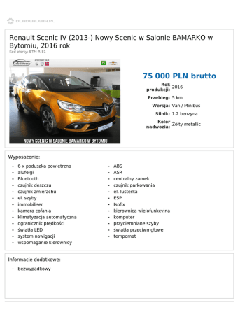 Renault Scenic IV (2013-) Nowy Scenic w Salonie BAMARKO w Bytomiu, 2016 rok Kod oferty: BTM-R-81 75 000 PLN brutto Rok 2016 produkcji: Przebieg: 5 km Wersja: Van / Minibus Silnik: 1.2 benzyna Kolor Żółty metallic nadwozia: Wyposażenie: - 6 x poduszka powietrzna alufelgi Bluetooth czujnik deszczu czujnik zmierzchu el. szyby immobiliser kamera cofania klimatyzacja automatyczna ogranicznik prędkości światła LED system nawigacji wspomaganie kierownicy Informacje dodatkowe: - bezwypadkowy - ABS ASR centralny zamek czujnik parkowania el. lusterka ESP Isofix kierownica wielofunkcyjna komputer przyciemniane szyby światła przeciwmgłowe tempomat Dąbrowscy Sp. z o.o. ul. Strzelców Bytomskich 51 41-902 Bytom Tel.: 32 387 29 39 Fax: