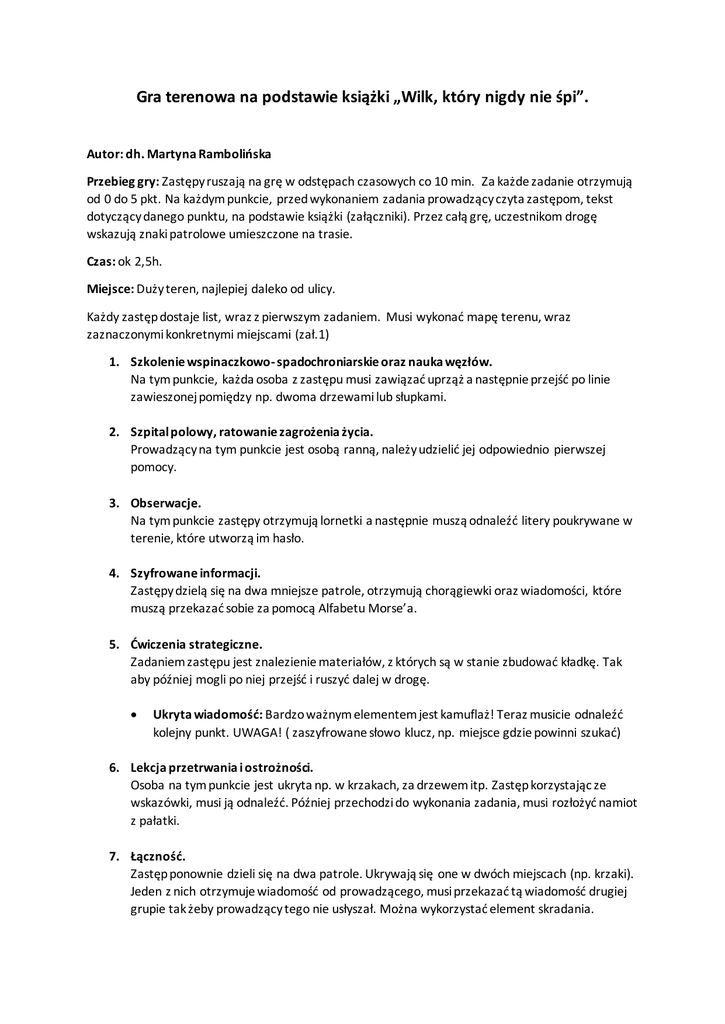 Gra terenowa na podstawie książki „Wilk, który nigdy nie śpi”. Autor: dh. Martyna Rambolińska Przebieg gry: Zastępy ruszają na grę w odstępach czasowych co 10 min. Za każde zadanie otrzymują od 0 do 5 pkt. Na każdym punkcie, przed wykonaniem zadania prowadzący czyta zastępom, tekst dotyczący danego punktu, na podstawie książki (załączniki). Przez całą grę, uczestnikom drogę wskazują znaki patrolowe umieszczone na trasie. Czas: ok 2,5h. Miejsce: Duży teren, najlepiej daleko od ulicy. Każdy zastęp dostaje list, wraz z pierwszym zadaniem. Musi wykonać mapę terenu, wraz zaznaczonymi konkretnymi miejscami (zał.1) 1. Szkolenie wspinaczkowo- spadochroniarskie oraz nauka węzłów. Na tym punkcie, każda osoba z zastępu musi zawiązać uprząż a następnie przejść po linie zawieszonej pomiędzy np. dwoma drzewami lub słupkami. 2. Szpital polowy, ratowanie zagrożenia życia. Prowadzący na tym punkcie jest osobą ranną, należy udzielić jej odpowiednio pierwszej pomocy. 3. Obserwacje. Na tym punkcie zastępy otrzymują lornetki a następnie muszą odnaleźć litery poukrywane w terenie, które utworzą im hasło. 4. Szyfrowane informacji. Zastępy dzielą się na dwa mniejsze patrole, otrzymują chorągiewki oraz wiadomości, które muszą przekazać sobie za pomocą Alfabetu Morse’a. 5. Ćwiczenia strategiczne. Zadaniem zastępu jest znalezienie materiałów, z których są w stanie zbudować kładkę. Tak aby później mogli po niej przejść i ruszyć dalej w drogę. Ukryta wiadomość: Bardzo ważnym elementem jest kamuflaż! Teraz musicie odnaleźć kolejny punkt. UWAGA! ( zaszyfrowane słowo klucz, np. miejsce gdzie powinni szukać) 6. Lekcja przetrwania i ostrożności. Osoba na tym punkcie jest ukryta np. w krzakach, za drzewem itp. Zastęp korzystając ze wskazówki, musi ją odnaleźć. Później przechodzi do wykonania zadania, musi rozłożyć namiot z pałatki. 7. Łączność. Zastęp ponownie dzieli się na dwa patrole. Ukrywają się one w dwóch miejscach (np. krzaki). Jeden z nich otrzymuje wiadomość od prowadzącego, musi przekazać tą wiadomość drugiej grupie tak żeby prowadzący tego nie usłyszał. Można wykorzystać element skradania. ZAŁĄCZNIKI: Zał. 1 Witajcie! Przed wami wiele ciężkich zadań. Musicie przejść i ukończyć bardzo ważne szkolenie. Zdobędziecie na nim wiedzę potrzebną do przeżycia. Zaczniecie od narysowania mapy terenu. Musi znajdować się na niej: Mapa musi być bardzo dokładna! Zaznaczcie na niej miejsce, w którym jesteście teraz oraz wszystkie następne punkty. Gdy wykonacie to zadanie, dokładnie o godz: X, ruszajcie w drogę… Bądźcie ostrożni i bardzo uważni. Szukajcie znaków! Powodzenia! Zał. do punktów: 1.Zadaję sobie pytanie: dlaczego młodzież jest tak zafascynowana orientacją, tropieniem śladów i podobnymi rzeczami? Brzmi to tak zwyczajnie. Tak prosto. W tych zabawach musi tkwić głębszy sens. [..] Przyszło mi właśnie na myśl wyjaśnienie dotyczące orientacji: orientacja nie jest niczym innym, jak tylko dążeniem w terenie w określonym, stale kontrolowanym i korygowanym kierunku aż do wyznaczonego celu. To może być fascynujące dla młodego człowieka, to gra, która go wciąga. 2. Mała, może dwunastoletnia Zuluska, mieszkająca u Anglików jako piastunka do dzieci, walczyła ze śmiercią, otrzymawszy postrzał w brzuch. Rana silnie ropiała. Nikt nie potrafił jej pomóc. B -P zbadał ranę , nałożył opatrunek, ale potem zdjął go sądząc, że ropa musi spływać bez przeszkód. [..] Do licha! - zawołał nagle – Nie wiem co robić. Nie mam pojęcia! Nigdy się tego nie uczyłem. [..] Następnego dnia zmarła. Później B-P będzie się skutecznie domagał, aby wszyscy żołnierze armii brytyjskiej przechodzili szkolenie w udzielaniu pierwszej pomocy. A jeszcze później- gdy odejdzie już ze służby wojskowejwłączy je do programu ruchu skautowego. 3. Jeden z najbardziej znanych rysunków B-P; skaut wykopuje sylabę „im” ze słowa ‘impossible’ (sylabę nie ze słowa niemożliwe) 4.Używają znaków skautowych dla wskazania drogi, przekazują informacje alfabetem Morse’a albo technikami szyfrowymi, które poleciłeś w swojej książce. Jako kolejny przejaw wspólnoty miał służyć wszystkim skautom szczególny znak, wyrażający pozdrowienie: prawa ręka wzniesiona na wysokość ramion i odwrócona dłonią na zewnątrz. Kciuk kładzie się na mały palec. Ten symboliczny gest ma oznaczać, że silny chroni słabego. Trzy wyprostowane palce przypominają o trzech punktach przyrzeczenia. Ponadto skauci podają sobie lewą rękę. 5. Przerzucają dla zabawy mosty własnej konstrukcji przez strumyki, a nawet przez większe potoki. Podział organizacyjny skautów był dla B-P jasny od samego początku: podstawę stanowić będzie system małych grup, po raz pierwszy wypróbowany przezeń z takim powodzenie w Lakhnau i później nadal rozwijany. Wystarczyło tylko dostosować praktykowany w wojsku system patroli do potrzeb młodzieży. 6. Potrzebni nam są, sir znakomicie wyszkoleni specjaliści, zwiadowcy, którzy nie mają żadnych innych zadań prócz celowego zdobywania informacji z obozu przeciwnika. Ci specjaliści- połączeni w doskonale zgrane, małe zespoły liczące od pięciu do maksimum ośmiu ludzi- muszą się przekradać przez łańcuch straży nieprzyjaciela, aż do kwatery głównej, tam podsłuchiwać rozmowy dowódców poznawać plany ataków, wykradać magazyny broni i dowiadywać się ile amunicji ma przeciwnik. I muszą wracać, nie pozostawiając po sobie śladów. 7.B-P sformował pięć patroli po sześciu żołnierzy. Wszyscy przeszkoleni i przeegzaminowani według podręcznika Służba rozpoznania i łączności. Pięć patroli miało niezależnie – ale w niezbyt wielkiej odległości od siebie- poszukiwać różnymi drogami śladów wrogich Zulusów i co trzy dni spotykać się w umówionych punktach w ce