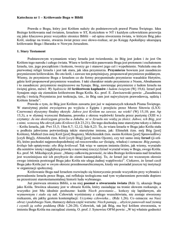 Katecheza nr 1 – Królowanie Boga w Biblii Prawda o Bogu, który jest Królem należy do podstawowych prawd Pisma Świętego. Idea Bożego królowania nad światem, Izraelem w ST, Kościołem w NT i każdym człowiekiem przewija się jako kluczowa przez wszystkie stronice Biblii – od opisu stworzenia świata, w którym Bóg jako Król, siedząc na tronie, stwarza świat przez swe słowosłowo-rozkaz, aż po Księgę Apokalipsy ukazującą królowanie Boga i Baranka w Nowym Jeruzalem. 1. Stary Testament Podstawowym wyznaniem wiary Izraela jest twierdzenie, że Bóg jest jeden i że jest On Królem tego narodu i całego świata. Wiara w królewskie panowanie Boga jest protonem i eschatonem Izraela, tzn. jego początkiem i końcem, tworzy go i stanowi jego cel i wypełnienie. Należała ona do pierwotnej pierwotnej religii Izraela i jest tak stara, jak idea przymierza. Przymierze bowiem jest zasadniczo przymierzem królewskim. Bo oto król, i zawsze ten potężniejszy, proponował przymierze poddanym. Wiemy, że przymierze Boga z Izraelem co do formy przypominało przymierze wasalskie Hetytów, gdzie król proponował przymierze wasalom. I taki charakter miało przymierze z Noem, Abrahamem i to zasadnicze: przymierze mojżeszowe na Synaju. Bóg, zawierając przymierze z ludem Izraela na świętej górze, mówi: Wy będziecie Mi królestwem kapłanów i ludem świętym (Wj 19,6). Izrael pod Synajem staje się ziemskim królestwem Boga Króla. Ks. prof. E. Zawiszewski powie: „Zasadniczą myślą i treścią Przymierza jest teokracja, tzn., że Bóg sam jest najwyższym prawodawcą, sędzią i Królem Izraela”. Prawda o tym, że Bóg jest Królem zawarta jest już w najstarszych tekstach Pisma Świętego. W starożytnej pieśni zwycięstwa po wyjściu z Egiptu i przejściu przez Morze Sitowia (LXX: Czerwone) słyszymy finalny okrzyk: Jahwe jest Królem na zawsze, na wieki! (Wj 15,18; por. Ap 15,3), a w słynnej wyroczni Balaama, proroka z okresu wędrówki Izraela przez pustynię (XIII w.) czytamy: Ja nie dostrzegam grzechu u Jakuba, ni w Izraelu nie widzę ja złości. Jahwe, ich Bóg, jest z nimi, wznoszą Mu okrzyk jako Królowi (Lb 23,21). Do tego dochodzą inne starożytne teksty o Jahwe – Królu Izraela, jak: Pwt 33,5; 1Sm 8,7; 12,12; Sdz 8,23. To, że wiara Izraela w Boga jako Króla stała u podłoża jahwizmu potwierdzają także starożytne imiona, jak: Elimelek (tzn. mój Bóg [jest] Królem), Malkiel (tzn mój Król [jest] Bogiem), Melchizedek (tzn. moim Królem [jest] Sprawiedliwy [czyli Bóg]), Abimelek (tzn. Król [czyli Bóg] [jest] moim Ojcem), czy też samo imię Izrael (ji(ji-srāsrāēl), które pochodzi najprawdopodobniej od rzeczownika sar (książę, władca) i oznacza: Bóg panuje, króluje lub optatywnie: oby Bóg królował. królował. Tak więc w samym imieniu (które, jak wiemy, wyrażało dla semitów istotę i najgłębszą prawdę o nazwanej rzeczy) Izrael wyrażał wiarę w Boga, swego Króla. Ks. prof. M. Mikołajczyk Mikołajczyk pisze: „Mamy całkowitą pewność, że idea Bożego królowania nad Izraelem jest wcześniejsza niż ich przybycie do ziemi kananejskiej. To, że Izrael już we wczesnym okresie swego istnienia postrzegał Boga jako Króla nie ulega żadnej wątpliwości”. Ciekawe, Ciekawe, że Izrael czcił Boga jako Króla już w swym okresie przedmonarchicznaym, kiedy nie posiadał jeszcze tej instytucji w organizacji społecznej. Królowanie Boga nad Izraelem rozwinęło się historycznie przede wszystkim przy wybraniu i prowadzeniu Izraela przez przez Boga, zaś refleksja teologiczna nad tym wydarzeniem powstała dopiero na przestrzeni starotestamentalnej historii ludu wybranego. Już pierwsza stronica Biblii, a na niej poemat o stworzeniu świata (Rdz 1), ukazuje Boga jako Króla. Stwórca ukazany jest w obrazie Króla, który zasiadając na tronie słowem rozkazuje, a wszystko jest Mu idealnie posłuszne: każde Niech powstanie… kończy się lapidarnym, ale wymownym i stało się tak. tak. Człowiek wyróżniony z całego wszechświata, nie zostaje stworzony rozkazem, ale jakby gestem kontemplacji: Uczyńmy człowieka… (Rdz 1,26). Co oznacza: na Nasz obraz i podobnego Nam, Nam, tłumaczy dalsza część wersetu: Niech panują… abyście panowali nad ziemią i czynili ją sobie poddaną (Rdz 1,261,26-28). Człowiek, tak jak Bóg, ma być królem stworzenia, w imieniu Boga Króla ma zarządzać ziemią. O. prof. J. Synowiec OFM powie: „W tej właśnie godności człowieka jako króla stworzenia pisarz biblijny widział jego podobieństwo do Boga jako Króla świata”. Nasze podobieństwo do Boga – według Biblii – to nie „rozum i wolna wola” (jak wnioskowała scholastyka), ale funkcja i godność panowania, bycia królem stworzenia. Stwierdza to także wiele innych tekstów Pisma Świętego. Mędrzec Syrach napisze: Pan stworzył stworzył ludzi (’adam) z ziemi... oraz dał im władzę nad wszystkim, co jest na niej. Przyodział ich w moc podobną do swojej i uczynił ich na swój obraz. Uczynił ich groźnymi dla wszystkiego stworzenia, aby panowali nad zwierzętami i ptactwem (Syr 17,117,1-4), a pseudopseudo-Salomom powie: Boże…, któryś wszystko uczynił swoim słowem i w Mądrości swojej stworzyłeś człowieka, by panował nad stworzeniami, co przez Ciebie się stały, by władał światem w świętości i sprawiedliwości (Mdr 9,19,1-3; zob. też takie teksty, jak Rdz 9,6n; Ps 8). To właśnie królowanie jest według Biblii istotą podobieństwa człowieka do Boga, co uwidacznia starotestamentową prawdę o Bogu jako Królu. Prawdę o upodobnieniu człowieka do Boga właśnie w funkcji króla – podejmie i dopełni NT, mówiąc o współkrólowaniu współkrólowaniu zbawionych z Chrystusem Alfą i Omegą (zob. Mt 19,28; Łk 22,2922,29-30; Ap 3,21; 5,10; 20,4.6; 22,5). Człowiek jest przeznaczony do uczestnictwa w naturze Bożej, czyli do królowania z Nim, czego przepięknym przykładem jest Maryja,