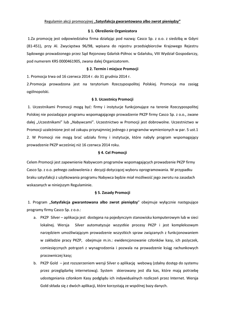 Regulamin akcji promocyjnej „Satysfakcja gwarantowana albo zwrot pieniędzy” § 1. Określenie Organizatora 1.Za promocję jest odpowiedzialna firma działając pod nazwą: Casco Sp. z o.o. z siedzibą w Gdyni (81-451), przy Al. Zwycięstwa 96/98, wpisana do rejestru przedsiębiorców Krajowego Rejestru Sądowego prowadzonego przez Sąd Rejonowy Gdańsk-Północ w Gdańsku, VIII Wydział Gospodarczy, pod numerem KRS 0000461905, zwana dalej Organizatorem. § 2. Termin i miejsce Promocji 1. Promocja trwa od 16 czerwca 2014 r. do 31 grudnia 2014 r. 2.Promocja prowadzona jest na terytorium Rzeczypospolitej Polskiej. Promocja ma zasięg ogólnopolski. § 3. Uczestnicy Promocji 1. Uczestnikami Promocji mogą być: firmy i instytucje funkcjonujące na terenie Rzeczypospolitej Polskiej nie posiadające programu wspomagającego prowadzenie PKZP firmy Casco Sp. z o.o., zwane dalej „Uczestnikami” lub „Nabywcami”. Uczestnictwo w Promocji jest dobrowolne. Uczestnictwo w Promocji uzależnione jest od zakupu przynajmniej jednego z programów wymienionych w par. 5 ust.1 2. W Promocji nie mogą brać udziału firmy i instytucje, które nabyły program wspomagający prowadzenie PKZP wcześniej niż 16 czerwca 2014 roku. § 4. Cel Promocji Celem Promocji jest zapewnienie Nabywcom programów wspomagających prowadzenie PKZP firmy Casco Sp. z o.o. pełnego zadowolenia z decyzji dotyczącej wyboru oprogramowania. W przypadku braku satysfakcji z użytkowania programu Nabywca będzie miał możliwość jego zwrotu na zasadach wskazanych w niniejszym Regulaminie. § 5. Zasady Promocji 1. Program „Satysfakcja gwarantowana albo zwrot pieniędzy” obejmuje wyłącznie następujące programy firmy Casco Sp. z o.o.: a. PKZP Silver – aplikacja jest dostępna na pojedynczym stanowisku komputerowym lub w sieci lokalnej. Wersja Silver automatyzuje wszystkie procesy PKZP i jest kompleksowym narzędziem umożliwiającym prowadzenie wszystkich spraw związanych z funkcjonowaniem w zakładzie pracy PKZP, obejmuje m.in.: ewidencjonowanie członków kasy, ich pożyczek, comiesięcznych potrąceń z wynagrodzenia i pozwala na prowadzenie ksiąg rachunkowych pracowniczej kasy; b. PKZP Gold – jest rozszerzeniem wersji Silver o aplikację webową (zdalny dostęp do systemu przez przeglądarkę internetową). System skierowany jest dla kas, które mają potrzebę udostępniania członkom Kasy podglądu ich indywidualnych rozliczeń przez Internet. Wersja Gold składa się z dwóch aplikacji, które korzystają ze wspólnej bazy danych. c. e-PKZP – jest niezależną aplikacją w pełni internetową, zapewnia użytkownikowi możliwość korzystania z systemu z dowolnego miejsca, eliminuje konieczność instalowania aplikacji na każdym stanowisku roboczym. Dedykowany jest do kas, które chcą prowadzić PKZP z wykorzystaniem Internetu i mieć pełną komunikację internetową. - zwane dalej „programami”. 2. Organizator zastrzega sobie prawo do rozszerzenia zakresu Promocji na inne programy znajdujące się w ofercie Casco Sp. z o.o., jak również do podejmowania innych działań promocyjnych dotyczących programów uczestniczących w Promocji. 3. Akcją objęte są wyłącznie nowe licencje na oprogramowanie, niezależnie od formy zakupu czy abonamenty czy licencje bezterminowe, zakupione w okresie od dnia 16 czerwca 2014 r. do dnia 31 grudnia 2014 r. przez Nabywców. 4. W przypadku braku satysfakcji z użytkowania zakupionego oprogramowania objętego Akcją, Nabywca musi zwrócić zakupione oprogramowanie do siedziby Organizatora tj. Casco Sp. z o.o. Al. Zwycięstwa 96/98. 81-451 Gdynia. 5. Zwrot programów objętych Promocją możliwy jest tylko w ciągu 100 dni od daty sprzedaży, wskazanej na Fakturze VAT. W przypadku zwrotu dokonanego w sposób wskazany w § 5 ust. 4 lit. a. o zachowaniu terminu do zwrotu programu, decyduje data stempla pocztowego na dowodzie nadania przesyłki. 6. Koszty przesłania zwrotu oprogramowania ponosi Nabywca. Przesyłki za zaliczeniem pocztowym lub z jakąkolwiek inną formą płatności przerzuconej na adresata nie będą akceptowane. 7. Zwrot programu jest możliwy wyłącznie pod warunkiem równoczesnego spełnienia poniższych warunków: a. Przesłanie programu z zachowaniem terminu do zwrotu i na adres określony w ust. 4 z zachowaniem terminu do zwrotu (100 dni). b. Zwracane oprogramowanie powinno być kompletne w oryginalnym opakowaniu. c. Przekazanie wraz z oprogramowaniem kopii oryginalnego dowodu zakupu programu(Faktury VAT). d. Przesłanie formularza zwrotu oprogramowania, zawierającego datę, dane zwracającego oprogramowanie, nazwa właściciela rachunku bankowego na które ma być dokonany przelew ze zwrotem należności, adres właściciela rachunku bankowego; numer rachunku bankowego na który ma być dokonany zwrot należności oraz przyczynę zwrotu, opis stwierdzonych wad oprogramowania. 8. Organizator na podstawie przesłanego formularza zwrotu prześle do Nabywcy, fakturę korygującą zakupu oprogramowania. 9. Wysokość zwracanej kwoty brutto zakupu nie może być wyższa niż cena zakupu podana na Fakturze VAT. 10. Nabywca ma obowiązek zwrotu nagród, gratisów, rabatów, ulg oraz innych korzyści przyznanych mu w związku z zakupem zwracanego programu. 11. Niniejsza Promocja nie podlega łączeniu z innymi promocjami organizowanymi przez Casco Sp. z o.o. § 6. Dane osobowe 1. Administratorem danych osobowych zebranych podczas niniejszej Promocji jest Organizator. 2. Uczestnicy mają prawo dostępu do treści swoich danych osobowych, jak również żądania ich poprawiania. 3. Podanie danych osobowych jest dobrowolne, choć niezbędne dla prawidłowego przeprowadzenia Promocji i zwrotu kosztów zakupu. Dane osobowe będą przetwarzane w celu przeprowadzenia Promocji, w celach archiwalnych, a za wyraźną zgodą Uczestnika także w celach marketingowych. § 7. Postanowienia końcowe 1. Organizator nie ponosi jakiejkolwiek odpowiedzialności odszkodow