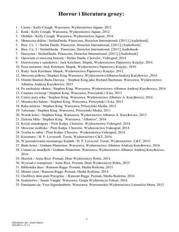 Horror i literatura grozy: 1. Cienie / Kelly Creagh. Warszawa, Wydawnictwo Jaguar, 2012 2. Kruk / Kelly Creagh. Warszawa, Wydawnictwo Jaguar, 2012 3. Otchłań / Kelly Creagh. Warszawa, Wydawnictwo Jaguar, 2016 4. Słoneczna dolina / StefanDarda. Piaseczno, Heraclon International, [2011] [Audiobook] 5. Bisy. Cz. 1 / Stefan Darda. Piaseczno, Heraclon International, [2011] [Audiobook] 6. Bisy. Cz. 2 / StefanDarda. Piaseczno, Heraclon International, [2011] Audiobook 7. Starzyzna / StefanDarda. Piaseczno, Heraclon International, [2011] [Audiobook] 8. Opowiem ci mroczną historię / Stefan Darda. Chorzów, Videograf, 2014 9. Dziewczyna z sąsiedztwa / Jack Ketchum. Słupsk, Wydawnictwo Papierowy Księżyc, 2016 10. Poza sezonem /Jack Ketchum. Słupsk, Wydawnictwo Papierowy Księżyc, 2010 11. Rudy /Jack Ketchum. Słupsk, Wydawnictwo Papierowy Księżyc, 2012 12. Mroczna połowa /Stephen King Warszawa ,WydawnictwoAlbatrosAndrzej Kuryłowicz ,2016 13. Ostatni Bastion Barta Dawesa / Stephen King jako Richard Bachman. Warszawa, Wydawnictwo Albatros Andrzej Kuryłowicz, 2015 14. Po zachodzie słońca / Stephen King. Warszawa, Wydawnictwo Albatros Andrzej Kuryłowicz, 2016 15. Cmętarz zwierząt / Stephen King. Warszawa, Prószyński i S-ka, 2013 16. Cztery pory roku / Stephen King. Warszawa, Wydawnictwo Albatros A. Kuryłowicz, 2016 17. Miasteczko Salem / Stephen King. Warszawa, Prószyński i S-ka, 2013 18. Ręka mistrza / Stephen King. Warszawa, Prószyński Media, 2012 19. Talizman / Stephen King. Warszawa, Prószyński Media, 2011 20. Worek kości / Stephen King. Warszawa, Wydawnictwo Albatros A. Kuryłowicz, 2013 21. Zielona Mila / Stephen King. Warszawa, "Albatros", 2016 22. Krzyk mandragory / Piotr Kulpa. Chorzów, Wydawnictwa Videograf, 2014 23. Mroczne siedlisko / Piotr Kulpa. Chorzów, Wydawnictwa Videograf, 2014 24. Trzeba to zabić / Piotr Kulpa. Chorzów, Wydawnictwa Videograf, 2014 25. Koszmary / H. P. Lovecraft. Toruń, Wydawnictwo C&T, 2016 26. W poszukiwaniu nieznanego Kadath / H. P. Lovecraf. Toruń, Wydawnictwo C&T, 2014 27. Białe kości / Graham Masterton. Warszawa, Wydawnictwo Albatros Andrzej Kuryłowicz, 2016 28. Uznani za zmarłych / Graham Masterton .Warszawa, Wydawnictwo Albatros Andrzej Kuryłowicz, 2016 29. Merrick / Anne Rice. Poznań, Dom Wydawniczy Rebis, 2014 30. Wywiad z wampirem / Anne Rice. Poznań, Dom Wydawniczy Rebis, 2015 31. Biblioteka dusz / Ransom Riggs. Poznań, Media Rodzina, 2015 32. Miasto cieni / Ransom Riggs. Poznań, Media Rodzina, 2014 33. Osobliwy dom pani Peregrine / Ransom Riggs. Poznań, Media Rodzina, 2016 34. Szaleństwo / Susan Vaught. Warszawa, Grupa Wydawnicza Foksal, 2016 35. Pamiętam cię /Yrsa Sigurdardóttir. Warszawa, Warszawskie Wydawnictwo Literackie Muza, 2012 1 Bibliotekaim. gen. Józefa Hallera MOLNET+v.15.1.2