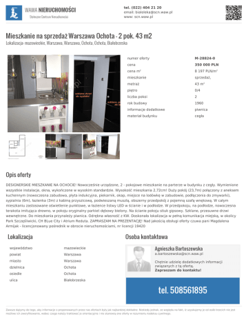 tel. (022) 404 21 20 email: [email protected] www: scn.waw.pl Mieszkanie na sprzedaż Warszawa Ochota - 2 pok. 43 m2 Lokalizacja: mazowieckie, Warszawa, Warszawa, Ochota, Ochota, Białobrzeska numer oferty M-28824-0 cena 350 000 PLN cena m 8 197 PLN/m2 mieszkanie sprzedaż, metraż 43 m2 piętro 0/4 liczba pokoi 2 rok budowy 1960 informacje dodatkowe piwnica materiał budynku cegła 2 Opis oferty DESIGNERSKIE MIESZKANIE NA OCHOCIE! Nowocześnie urządzone, 2 - pokojowe mieszkanie na parterze w budynku z cegły. Wymienione wszystkie instalacje, okna, wykończone w wysokim standardzie. Wysokość mieszkania 2,72cm! Duży pokój (23,7m) połączony z aneksem kuchennym (nowoczesna zabudowa, płyta indukcyjna, piekarnik, okap, miejsce na lodówkę w zabudowie, podłączenia do zmywarki), sypialnia (6m), łazienka (3m) z kabiną przyszicową, podwieszaną muszlą, obszerny przedpokój z pojemną szafą wnękową. W całym mieszkaniu zastosowane oświetlenie punktowe, w łazience listwy LED w ścianie i w podłodze. W przedpokoju, na podłodze, nowoczesna terakota imitująca drewno, w pokoju oryginalny parkiet dębowy bielony. Na ścianie pokoju stiuk gipsowy. Szklane, przesuwne drzwi wewnętrzne. Do mieszkania przynależy piwnica. Odrębna własność z KW. Doskonała lokalizacja w pełną komunikacja miejską, w okolicy Park Szczęśliwicki, CH BLue City i Atrium Reduta. ZAPRASZAM NA PREZENTACJĘ! Nad jakością obsługi oferty czuwa pani Magdalena Armijak - licencjonowany pośrednik w obrocie nieruchomościami, nr licencji 19420 Lokalizacja Osoba kontaktowa Agnieszka Bartoszewska województwo mazowieckie powiat Warszawa [email protected] miasto Warszawa dzielnica Ochota osiedle Ochota Chętnie udzielę dodatkowych informacji związanych z tą ofertą. Zapraszam do kontaktu! ulica Białobrzeska tel. 508561895 Zawsze dążymy do tego, aby informacje o proponowanych przez nas ofertach były jak najbardziej dokładne. Niekiedy jednak, ze względu na fakt, iż uzyskujemy je od osób trzecich nie jest możliwe ich zweryfikowanie, wobec czego należy traktować je orientacyjnie i nie stanowią one oferty w rozumieniu kodeksu cywilnego.