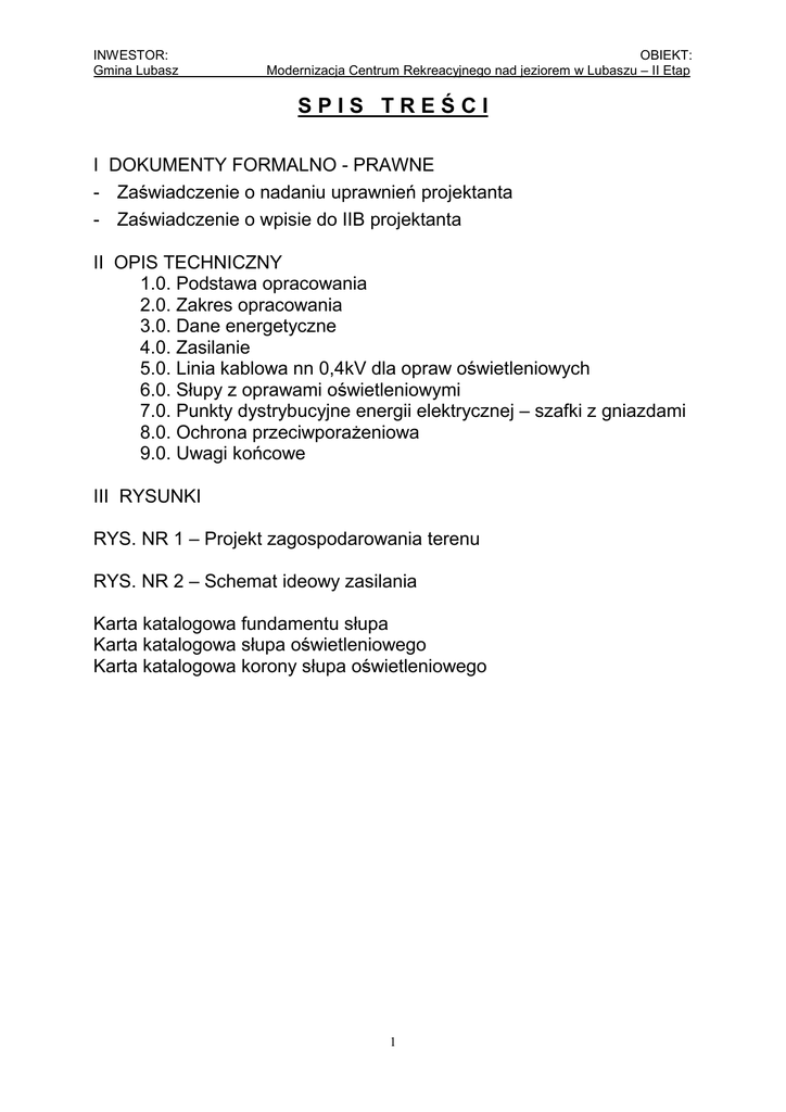 INWESTOR: Gmina Lubasz OBIEKT: Modernizacja Centrum Rekreacyjnego nad jeziorem w Lubaszu – II Etap SPIS TREŚCI I DOKUMENTY FORMALNO - PRAWNE - Zaświadczenie o nadaniu uprawnień projektanta - Zaświadczenie o wpisie do IIB projektanta II OPIS TECHNICZNY 1.0. Podstawa opracowania 2.0. Zakres opracowania 3.0. Dane energetyczne 4.0. Zasilanie 5.0. Linia kablowa nn 0,4kV dla opraw oświetleniowych 6.0. Słupy z oprawami oświetleniowymi 7.0. Punkty dystrybucyjne energii elektrycznej – szafki z gniazdami 8.0. Ochrona przeciwporażeniowa 9.0. Uwagi końcowe III RYSUNKI RYS. NR 1 – Projekt zagospodarowania terenu RYS. NR 2 – Schemat ideowy zasilania Karta katalogowa fundamentu słupa Karta katalogowa słupa oświetleniowego Karta katalogowa korony słupa oświetleniowego 1 INWESTOR: Gmina Lubasz OBIEKT: Modernizacja Centrum Rekreacyjnego nad jeziorem w Lubaszu – II Etap Kopia zaświadczenia o nadaniu uprawnień projektanta 2 INWESTOR: Gmina Lubasz OBIEKT: Modernizacja Centrum Rekreacyjnego nad jeziorem w Lubaszu – II Etap 3 INWESTOR: Gmina Lubasz OBIEKT: Modernizacja Centrum Rekreacyjnego nad jeziorem w Lubaszu – II Etap Kopia zaświadczenia o wpisie projektanta do Izby Inżynierów Budownictwa 4 INWESTOR: Gmina Lubasz OBIEKT: Modernizacja Centrum Rekreacyjnego nad jeziorem w Lubaszu – II Etap OPIS TECHNICZNY DO PROJEKTU BUDOWLANEGO OŚWIETLENIA ZEWNĘTRZNEGO PARKOWEGO ORAZ SŁUPKÓW DYSTRYBUCYJNYCH ENERGII ELEKTRYCZNEJ W CENTRUM REKREACYJNYM NAD JEZIOREM W LUBASZU 1.0. Podstawa opracowania - Zlecenie Inwestora, - Uzgodnienia międzybranżowe, - Plan zagospodarowania terenu, - Obowiązujące przepisy i normy PN/E, w szczególności: a) ochrona przeciwporażeniowa i normy towarzyszące od PN-IEC 60364 b) norma N SEP-E-001 “Sieci elektroenergetyczne niskiego napięcia. Ochrona przeciwporażeniowa.” c) norma N SEP-E-004 “Elektroenergetyczne i sygnalizacyjne linie kablowe. Projektowanie i budowa.” 2.0. Zakres opracowania W skład niniejszego projektu wchodzi opracowanie następujących elementów związanych z oświetleniem zewnętrznym oraz słupkami dystrybucji energii: - Zasilanie oświetlenia z istniejącej latarni; - Linia kablowa nn 0,4kV dla opraw oświetleniowych; - Słupy z oprawami oświetleniowymi; - Zasilanie szafek dystrybucji energii elektrycznej z istniejącej rozdzielnicy w przyległym budynku; - Linia kablowa nn 0,4kV dla szafek dystrybucji energii; - Szafki dystrybucji energii elektrycznej; - Ochrona przeciwporażeniowa. 5 INWESTOR: Gmina Lubasz OBIEKT: Modernizacja Centrum Rekreacyjnego nad jeziorem w Lubaszu – II Etap 3.0. Dane energetyczne Napięcie zasilania 400/230[V] 3~ 50Hz 4.0. Zasilanie oświetlenia z istniejącej latarni Projektowane oświetlenie zewnętrzne zasilić kablem z istniejącej latarni oświetleniowej, w miejscu pokazanym na planie zagospodarowania. 5.0. Linia kablowa nn 0,4kV dla opraw oświetleniowych W celu zasilenia opraw na słupach oświetleniowych, z istniejącej latarni wyprowadzić linię kablową nn 0,4kV kablem YAKY 4x16mm2 prowadzonym po trasie jak na planie zagospodarowania. Prowadzenie kabla w ziemi na głębokości 0,7m w podwójnej warstwie piasku grubości 0,1m każda. Nad kablem ułożyć folię ostrzegawczą koloru niebieskiego. Na kablu zamontować co 10m opaski oznacznikowe z naniesionymi danymi o parametrach kabla, miejscach jego przyłączenia oraz wskazaniem jego właściciela. Pod nierozbieralnymi utwardzeniami nawierzchni kabel prowadzić w rurach ochronnych AROT DVK fi75mm. 6.0. Słupy z oprawami oświetleniowymi Nowoprojektowane oświetlenie zewnętrzne zrealizować przy pomocy opraw oświetleniowych parkowych typu typ KULA wg wskazania przez Inwestora, ze źródłem światła 1xSON 70W (sodowe wysokoprężne). Oprawy zamontowane na słupach parkowych cylindrycznych stożkowych typ S-40C wys. h=4,0m ponad poziom gruntu, z fundamentem F100/200 produkcji Elektromontaż Rzeszów. UWAGA: Na słupie dodatkowo zamontować koronę słupową jednoramienną typu W1114/1 prod. Elektromontaż Rzeszów. Miejsca posadowienia poszczególnych słupów z oprawami pokazano na planie zagospodarowania. 6 INWESTOR: Gmina Lubasz OBIEKT: Modernizacja Centrum Rekreacyjnego nad jeziorem w Lubaszu – II Etap W każdym słupie oświetleniowym zamontować tabliczkę zasilająco – bezpiecznikową, z wyłącznikiem nadmiarowo – prądowym dla oprawy na słupie oświetleniowym. Zastosować wyłączniki typu S301C4A. Zastosować tabliczki bezpiecznikowe z zaciskiem ochronnym. Od wyłącznika nadmiarowo – prądowego tabliczki, prowadzić do opraw na słupie przewód zasilający typu YDYżo3x1,5mm2. 7.0. Szafki dystrybucji energii elektrycznej Celem zapewnienia zasilania i dostępu do energii elektrycznej na oświetlanych stanowiskach rekreacyjnych, projektuje się zainstalowanie na nich szafek dystrybucyjnych z gniazdami wtykowymi. W miejscach instalacji szafek (jedna szafka obsługuje dwa stanowiska) należy dokonać wycinki części istniejącego zywopłotu Projektowane szafki zasilić kablem z istniejącej rozdzielnicy w przyległym budynku stołówki, w miejscu pokazanym na planie zagospodarowania. W rozdzielnicy tej dobudować rozłącznik bezpiecznikowy 50AgG oraz podlicznik zużycia energii elektrycznej dla przyłącza szafek dystrybucyjnych. W celu zasilenia szafek dystrybucyjnych, z istniejącej rozdzielnicy wyprowadzić linię kablową nn 0,4kV kablem YAKY 5x16mm2 prowadzonym po trasie jak na planie zagospodarowania. Prowadzenie kabla w ziemi na głębokości 0,7m w podwójnej warstwie piasku grubości 0,1m każda. Nad kablem ułożyć folię ostrzegawczą koloru niebieskiego. Na kablu zamontować co 10m opaski oznacznikowe z naniesionymi danymi o parametrach kabla, miejscach jego przyłączenia oraz wskazaniem jego właściciela. Pod nierozbieralnymi utwardzeniami nawierzchni kabel prowadzić w rurach ochronnych AROT DVK fi75mm. W miejscach pokazanych na planie zagospodarowania, zamontować szafki dystrybucyjne z gniazd