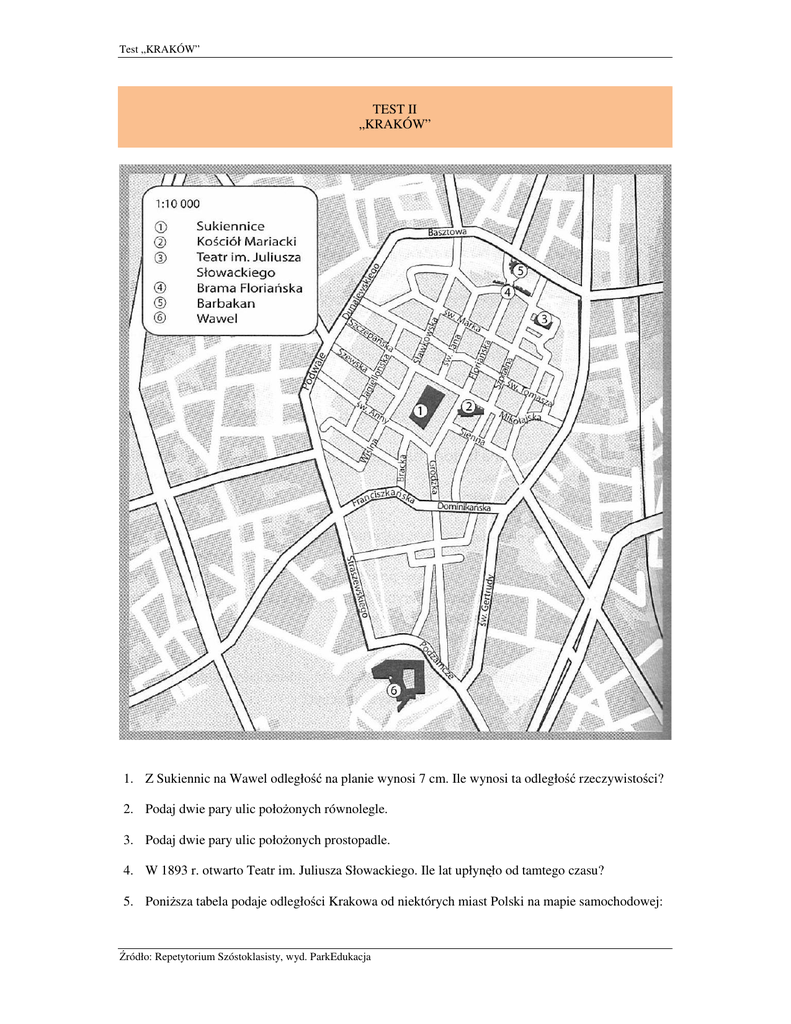 Test „KRAKÓW” TEST II „KRAKÓW” 1. Z Sukiennic na Wawel odległość na planie wynosi 7 cm. Ile wynosi ta odległość rzeczywistości? 2. Podaj dwie pary ulic położonych równolegle. 3. Podaj dwie pary ulic położonych prostopadle. 4. W 1893 r. otwarto Teatr im. Juliusza Słowackiego. Ile lat upłynęło od tamtego czasu? 5. Poniższa tabela podaje odległości Krakowa od niektórych miast Polski na mapie samochodowej: Źródło: Repetytorium Szóstoklasisty, wyd. ParkEdukacja Test „KRAKÓW” Nazwa miasta Bielsko - Biała Częstochowa Katowice Lublin Poznań Suwałki Szczecin Warszawa Zakopane Odległość od Krakowa 86 km 114 km 75 km 270 km 400 km 565 km 635 km 295 km 100 km Po ilu godzinach samochód jadący z Poznania ze średnią prędkością 80 km na godzinę, dotrze do Krakowa? 6. Ile razy odległość z Suwałk do Krakowa jest większa od odległości z Bielska – Białej do Krakowa? 7. Ozdobą wawelskich komnat są arrasy, artystyczne tkaniny ścienne w kształcie prostokąta, wyrabiane z cienkich, wełnianych nici. Największe arrasy mają wymiary 5 m na 9 m. Ile metrów ozdobnej listwy trzeba przygotować, aby ten arras obramować wzdłuż jego brzegów? 8. Paweł z bratem i jego rodzicami wybrali się do Muzeum Lotnictwa Polskiego w Krakowie. Tuż przed wejściem spotkali trzech kolegów z klasy Pawła, którzy też mieli ochotę zwiedzić to muzeum. Bilety dla dorosłych były w cenie 7 zł, a bilety ulgowe (dla uczniów) po 5 złotych. Ile kosztowały razem wszystkie bilety? 9. Obecnie w Muzeum Lotnictwa na wystawie zostało zgromadzonych: 176 samolotów, 7 śmigłowców, 22 szybowce i ponad 100 silników lotniczych. Ile jest maszyn latających w tym muzeum? 10. Paweł i Piotrek wybierają się popływać i pozjeżdżać w Parku Wodnym w Krakowie. Umówili się na przystanku w pobliżu tego Parku o koło godziny 10:00. Oto fragmenty rozkładu jazdy dwóch linii autobusowych, które mają przystanek w miejscu spotkania chłopców. 5 6 7 8 9 10 11 Linia 252 00 20 00 20 00 20 00 20 00 20 00 20 00 20 40 40 40 40 40 40 40 Linia 201 05 20 35 5 6 05 20 35 7 05 20 35 8 05 20 35 9 05 20 35 10 05 20 35 11 05 20 35 50 50 50 50 50 50 50 Z domu na przystanek linii 252 Paweł idzie 14 minut, Piotrek na swój przystanek linii 201 – 23 minuty. Planowany czas dojazdu autobusu 252 do Parku Wodnego wynosi 24 minuty, a autobusu 201 nieco krócej, bo 19 minut. O której godzinie powinien wyjść z domu Paweł, a o której Piotrek, aby mogli się spotkać w umówionym miejscu i wyznaczonej godzinie? Źródło: Repetytorium Szóstoklasisty, wyd. ParkEdukacja