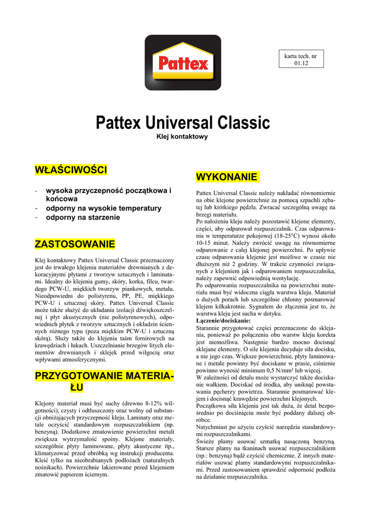 karta tech. nr 01.12 Pattex Universal Classic Klej kontaktowy WŁAŚCIWOŚCI - - wysoka przyczepność początkowa i końcowa odporny na wysokie temperatury odporny na starzenie ZASTOSOWANIE Klej kontaktowy Pattex Universal Classic przeznaczony jest do trwałego klejenia materiałów drewnianych z dekoracyjnymi płytami z tworzyw sztucznych i laminatami. Idealny do klejenia gumy, skóry, korka, filcu, twardego PCW-U, miękkich tworzyw piankowych, metalu. Nieodpowiedni do polistyrenu, PP, PE, miękkiego PCW-U i sztucznej skóry. Pattex Universal Classic może także służyć do układania izolacji dźwiękoszczelnej i płyt akustycznych (nie polistyrenowych), odpowiednich płytek z tworzyw sztucznych i okładzin ściennych różnego typu (poza miękkim PCW-U i sztuczną skórą). Służy także do klejenia taśm fornirowych na krawędziach i łukach. Uszczelnianie brzegów litych elementów drewnianych i sklejek przed wilgocią oraz wpływami atmosferycznymi. PRZYGOTOWANIE MATERIAŁU Klejony materiał musi być suchy (drewno 8-12% wilgotności), czysty i odtłuszczony oraz wolny od substancji obniżających przyczepność kleju. Laminaty oraz metale oczyścić standardowym rozpuszczalnikiem (np. benzyną). Dodatkowe zmatowienie powierzchni metali zwiększa wytrzymałość spoiny. Klejone materiały, szczególnie płyty laminowane, płyty akustyczne itp., klimatyzować przed obróbką wg instrukcji producenta. Kleić tylko na nieobrabianych podłożach (naturalnych nośnikach). Powierzchnie lakierowane przed klejeniem zmatowić papierem ściernym. WYKONANIE Pattex Universal Classic należy nakładać równomiernie na obie klejone powierzchnie za pomocą szpachli zębatej lub krótkiego pędzla. Zwracać szczególną uwagę na brzegi materiału. Po nałożeniu kleju należy pozostawić klejone elementy, części, aby odparował rozpuszczalnik. Czas odparowania w temperaturze pokojowej (18-25°C) wynosi około 10-15 minut. Należy zwrócić uwagę na równomierne odparowanie z całej klejonej powierzchni. Po upływie czasu odparowania klejenie jest możliwe w czasie nie dłuższym niż 2 godziny. W trakcie czynności związanych z klejeniem jak i odparowaniem rozpuszczalnika, należy zapewnić odpowiednią wentylację. Po odparowaniu rozpuszczalnika na powierzchni materiału musi być widoczna ciągła warstwa kleju. Materiał o dużych porach lub szczególnie chłonny posmarować klejem kilkakrotnie. Sygnałem do złączenia jest to, że warstwa kleju jest sucha w dotyku. Łączenie/dociskanie: Starannie przygotować części przeznaczone do sklejania, ponieważ po połączeniu obu warstw kleju korekta jest niemożliwa. Następnie bardzo mocno docisnąć sklejane elementy. O sile klejenia decyduje siła docisku, a nie jego czas. Większe powierzchnie, płyty laminowane i metale powinny być dociskane w prasie, ciśnienie powinno wynosić minimum 0,5 N/mm² lub więcej. W zależności od detalu może wystarczyć także dociskanie wałkiem. Dociskać od środka, aby uniknąć powstawania pęcherzy powietrza. Starannie posmarować klejem i docisnąć krawędzie powierzchni klejonych. Początkowa siła klejenia jest tak duża, że detal bezpośrednio po dociśnięciu może być poddany dalszej obróbce. Natychmiast po użyciu czyścić narzędzia standardowymi rozpuszczalnikami. Świeże plamy usuwać szmatką nasączoną benzyną. Starsze plamy na tkaninach usuwać rozpuszczalnikiem (np.: benzyną) bądź czyścić chemicznie. Z innych materiałów usuwać plamy standardowymi rozpuszczalnikami. Przed zastosowaniem sprawdzić odporność podłoża na działanie rozpuszczalnika. UWAGA Niniejsza karta techniczna określa zakres stosowania materiału i sposób prowadzenia robót, ale nie może zastąpić zawodowego przygotowania wykonawcy. Oprócz podanych informacji prace należy wykonywać zgodnie ze sztuką budowlaną i zasadami BHP. Producent gwarantuje jakość wyrobu, natomiast nie ma wpływu na warunki i sposób jego użycia. W przypadku wątpliwości należy wykonać własne próby stosowania. Wraz z ukazaniem się tej karty technicznej tracą ważność karty wcześniejsze. SKŁADOWANIE Do 24 miesięcy od daty produkcji. Przechowywać w szczelnie zamkniętych oryginalnych opakowaniach, w temperaturze pokojowej. Opakowania przechowywać szczelnie zamknięte, również w trakcie krótkotrwałych przerw w pracy, aby zapobiec odparowaniu rozpuszczalnika. Unikać temperatur poniżej +5ºC oraz powyżej +50 ºC. W trakcie transportu nie wymaga ogrzewanego samochodu. Dopuszczalny jest spadek temperatury do -10 ºC w czasie nie dłuższym niż 3 dni. W przypadku, gdy materiał był przechowywany w temperaturze poniżej +5ºC lub został zmrożony, należy klej, wolno zaaklimatyzować do temperatury około +20ºC. Nie wpływa to w żaden sposób na jego parametry robocze oraz techniczne. OPAKOWANIA Dostępne opakowania: - puszka metalowa: 300 ml, 800 ml i 5 l - tubka metalowa: 50 ml DANE TECHNICZNE Baza: polichloropren _____________________________________________ Konsystencja: płynna _____________________________________________ Gęstość: około 0,89 g/cm³ Odporność termiczna: od - 40 ºC do +110°C _____________________________________________ Temperatura stosowania: od +18 oC do +25oC, sucha i ciepła atmosfera przyśpiesza, zimno opóźnia proces parowania rozpuszczalnika _____________________________________________ Zużycie: 250 - 350 g/m² przy dwustronnym nakładaniu kleju _____________________________________________ Wytrzymałość końcowa wg DIN EN 205: osiągana jest po 3 dniach _____________________________________________ Czas odparowania rozpuszczalnika w temperaturze pokojowej: 10-15 min BEZPIECZEŃSTWO PRODUKTU Patrz karta charakterystyki Pattex Universal Classic