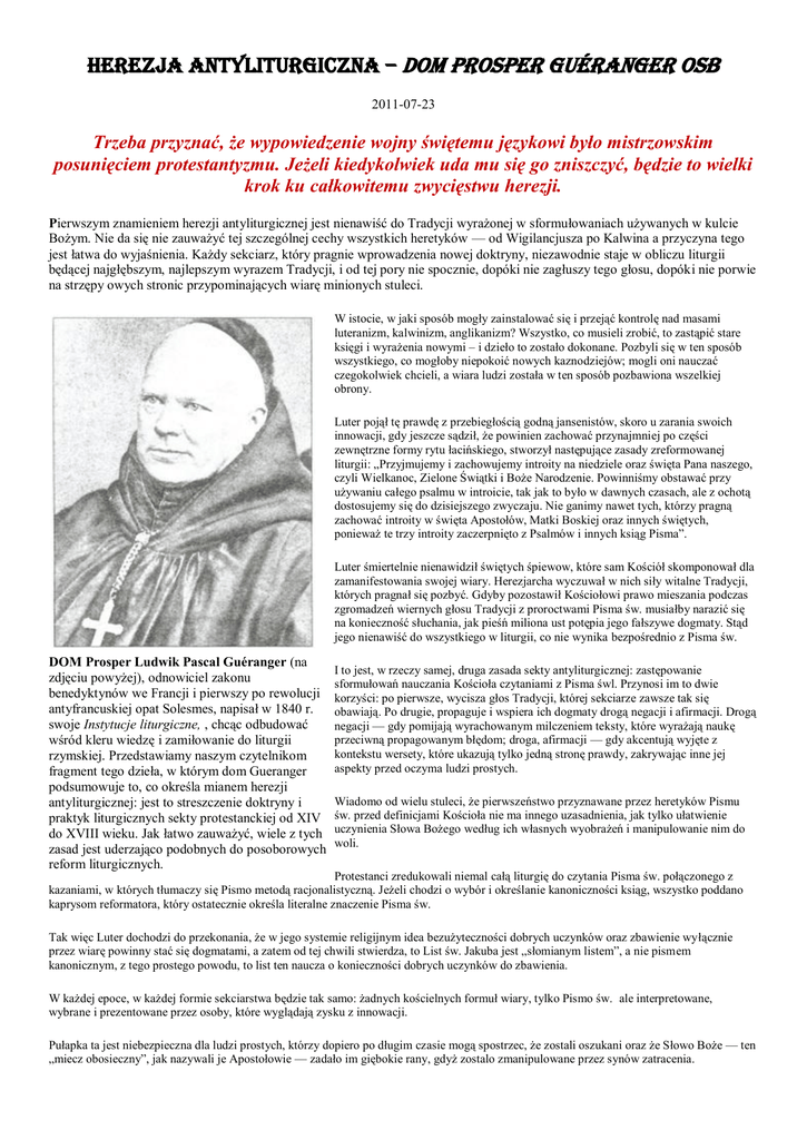 Herezja antyliturgiczna – Dom Prosper Guéranger OSB 2011-07-23 Trzeba przyznać, że wypowiedzenie wojny świętemu językowi było mistrzowskim posunięciem protestantyzmu. Jeżeli kiedykolwiek uda mu się go zniszczyć, będzie to wielki krok ku całkowitemu zwycięstwu herezji. Pierwszym znamieniem herezji antyliturgicznej jest nienawiść do Tradycji wyrażonej w sformułowaniach używanych w kulcie Bożym. Nie da się nie zauważyć tej szczególnej cechy wszystkich heretyków — od Wigilancjusza po Kalwina a przyczyna tego jest łatwa do wyjaśnienia. Każdy sekciarz, który pragnie wprowadzenia nowej doktryny, niezawodnie staje w obliczu liturgii będącej najgłębszym, najlepszym wyrazem Tradycji, i od tej pory nie spocznie, dopóki nie zagłuszy tego głosu, dopóki nie porwie na strzępy owych stronic przypominających wiarę minionych stuleci. W istocie, w jaki sposób mogły zainstalować się i przejąć kontrolę nad masami luteranizm, kalwinizm, anglikanizm? Wszystko, co musieli zrobić, to zastąpić stare księgi i wyrażenia nowymi – i dzieło to zostało dokonane. Pozbyli się w ten sposób wszystkiego, co mogłoby niepokoić nowych kaznodziejów; mogli oni nauczać czegokolwiek chcieli, a wiara ludzi została w ten sposób pozbawiona wszelkiej obrony. Luter pojął tę prawdę z przebiegłością godną jansenistów, skoro u zarania swoich innowacji, gdy jeszcze sądził, że powinien zachować przynajmniej po części zewnętrzne formy rytu łacińskiego, stworzył następujące zasady zreformowanej liturgii: „Przyjmujemy i zachowujemy introity na niedziele oraz święta Pana naszego, czyli Wielkanoc, Zielone Świątki i Boże Narodzenie. Powinniśmy obstawać przy używaniu całego psalmu w introicie, tak jak to było w dawnych czasach, ale z ochotą dostosujemy się do dzisiejszego zwyczaju. Nie ganimy nawet tych, którzy pragną zachować introity w święta Apostołów, Matki Boskiej oraz innych świętych, ponieważ te trzy introity zaczerpnięto z Psalmów i innych ksiąg Pisma”. Luter śmiertelnie nienawidził świętych śpiewow, które sam Kościół skomponował dla zamanifestowania swojej wiary. Herezjarcha wyczuwał w nich siły witalne Tradycji, których pragnał się pozbyć. Gdyby pozostawił Kościołowi prawo mieszania podczas zgromadzeń wiernych głosu Tradycji z proroctwami Pisma św. musiałby narazić się na konieczność słuchania, jak pieśń miliona ust potępia jego fałszywe dogmaty. Stąd jego nienawiść do wszystkiego w liturgii, co nie wynika bezpośrednio z Pisma św. DOM Prosper Ludwik Pascal Guéranger (na zdjęciu powyżej), odnowiciel zakonu benedyktynów we Francji i pierwszy po rewolucji antyfrancuskiej opat Solesmes, napisał w 1840 r. swoje Instytucje liturgiczne, , chcąc odbudować wśród kleru wiedzę i zamiłowanie do liturgii rzymskiej. Przedstawiamy naszym czytelnikom fragment tego dzieła, w którym dom Gueranger podsumowuje to, co określa mianem herezji antyliturgicznej: jest to streszczenie doktryny i praktyk liturgicznych sekty protestanckiej od XIV do XVIII wieku. Jak łatwo zauważyć, wiele z tych zasad jest uderzająco podobnych do posoborowych reform liturgicznych. I to jest, w rzeczy samej, druga zasada sekty antyliturgicznej: zastępowanie sformułowań nauczania Kościoła czytaniami z Pisma śwl. Przynosi im to dwie korzyści: po pierwsze, wycisza głos Tradycji, której sekciarze zawsze tak się obawiają. Po drugie, propaguje i wspiera ich dogmaty drogą negacji i afirmacji. Drogą negacji — gdy pomijają wyrachowanym milczeniem teksty, które wyrażają naukę przeciwną propagowanym błędom; droga, afirmacji — gdy akcentują wyjęte z kontekstu wersety, które ukazują tylko jedną stronę prawdy, zakrywając inne jej aspekty przed oczyma ludzi prostych. Wiadomo od wielu stuleci, że pierwszeństwo przyznawane przez heretyków Pismu św. przed definicjami Kościoła nie ma innego uzasadnienia, jak tylko ułatwienie uczynienia Słowa Bożego według ich własnych wyobrażeń i manipulowanie nim do woli. Protestanci zredukowali niemal całą liturgię do czytania Pisma św. połączonego z kazaniami, w których tłumaczy się Pismo metodą racjonalistyczną. Jeżeli chodzi o wybór i określanie kanoniczności ksiąg, wszystko poddano kaprysom reformatora, który ostatecznie określa literalne znaczenie Pisma św. Tak więc Luter dochodzi do przekonania, że w jego systemie religijnym idea bezużyteczności dobrych uczynków oraz zbawienie wyłącznie przez wiarę powinny stać się dogmatami, a zatem od tej chwili stwierdza, to List św. Jakuba jest „słomianym listem”, a nie pismem kanonicznym, z tego prostego powodu, to list ten naucza o konieczności dobrych uczynków do zbawienia. W każdej epoce, w każdej formie sekciarstwa będzie tak samo: żadnych kościelnych formuł wiary, tylko Pismo św. ale interpretowane, wybrane i prezentowane przez osoby, które wyglądają zysku z innowacji. Pułapka ta jest niebezpieczna dla ludzi prostych, którzy dopiero po długim czasie mogą spostrzec, że zostali oszukani oraz że Słowo Boże — ten „miecz obosieczny”, jak nazywali je Apostołowie — zadało im giębokie rany, gdyż zostalo zmanipulowane przez synów zatracenia. Trzecią zasadą heretyków co do reformy liturgii jest, gdy już wyeliminowali sformułowania kościelne i proklamowali absolutną, konieczność korzystania wyłącznie z treści Pisma św., a zauważywszy, to Pismo — mimo ich chęci — nie zawsze daje się nagiąć do ich potrzeb, trzecią, powiadam, ich zasadą jest tworzenie i wprowadzanie rozmaitych formuł, pełnych podstępu, sprawiających, że ludzie jeszcze łatwiej wpadają. w sidła błędu, a przez to struktura bezbożnej reformy umacnia się na całe wieki. Trudno się dziwić sprzecznościom, które herezja ukazuje w swych dziełach, gdy się wie o czwartej zasadzie, czy może czwartej konieczności narzucajacej się sekciarzom przez samą n