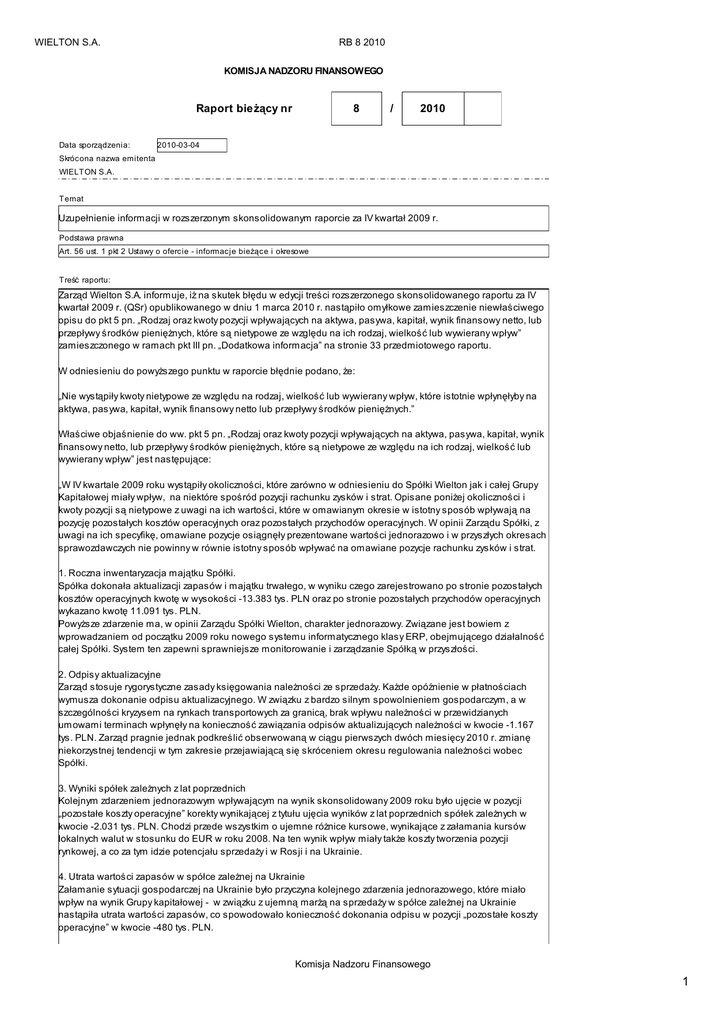 WIELTON S.A. RB 8 2010 KOMISJA NADZORU FINANSOWEGO Raport bieŜący nr Data sporządzenia: 8 / 2010 2010-03-04 Skrócona nazwa emitenta WIELTON S.A. Temat Uzupełnienie informacji w rozszerzonym skonsolidowanym raporcie za IV kwartał 2009 r. Podstawa prawna Art. 56 ust. 1 pkt 2 Ustawy o ofercie - informacje bieŜące i okresowe Treść raportu: Zarząd Wielton S.A. informuje, iŜ na skutek błędu w edycji treści rozszerzonego skonsolidowanego raportu za IV kwartał 2009 r. (QSr) opublikowanego w dniu 1 marca 2010 r. nastąpiło omyłkowe zamieszczenie niewłaściwego opisu do pkt 5 pn. „Rodzaj oraz kwoty pozycji wpływających na aktywa, pasywa, kapitał, wynik finansowy netto, lub przepływy środków pienięŜnych, które są nietypowe ze względu na ich rodzaj, wielkość lub wywierany wpływ” zamieszczonego w ramach pkt III pn. „Dodatkowa informacja” na stronie 33 przedmiotowego raportu. W odniesieniu do powyŜszego punktu w raporcie błędnie podano, Ŝe: „Nie wystąpiły kwoty nietypowe ze względu na rodzaj, wielkość lub wywierany wpływ, które istotnie wpłynęłyby na aktywa, pasywa, kapitał, wynik finansowy netto lub przepływy środków pienięŜnych.” Właściwe objaśnienie do ww. pkt 5 pn. „Rodzaj oraz kwoty pozycji wpływających na aktywa, pasywa, kapitał, wynik finansowy netto, lub przepływy środków pienięŜnych, które są nietypowe ze względu na ich rodzaj, wielkość lub wywierany wpływ” jest następujące: „W IV kwartale 2009 roku wystąpiły okoliczności, które zarówno w odniesieniu do Spółki Wielton jak i całej Grupy Kapitałowej miały wpływ, na niektóre spośród pozycji rachunku zysków i strat. Opisane poniŜej okoliczności i kwoty pozycji są nietypowe z uwagi na ich wartości, które w omawianym okresie w istotny sposób wpływają na pozycję pozostałych kosztów operacyjnych oraz pozostałych przychodów operacyjnych. W opinii Zarządu Spółki, z uwagi na ich specyfikę, omawiane pozycje osiągnęły prezentowane wartości jednorazowo i w przyszłych okresach sprawozdawczych nie powinny w równie istotny sposób wpływać na omawiane pozycje rachunku zysków i strat. 1. Roczna inwentaryzacja majątku Spółki. Spółka dokonała aktualizacji zapasów i majątku trwałego, w wyniku czego zarejestrowano po stronie pozostałych kosztów operacyjnych kwotę w wysokości -13.383 tys. PLN oraz po stronie pozostałych przychodów operacyjnych wykazano kwotę 11.091 tys. PLN. PowyŜsze zdarzenie ma, w opinii Zarządu Spółki Wielton, charakter jednorazowy. Związane jest bowiem z wprowadzaniem od początku 2009 roku nowego systemu informatycznego klasy ERP, obejmującego działalność całej Spółki. System ten zapewni sprawniejsze monitorowanie i zarządzanie Spółką w przyszłości. 2. Odpisy aktualizacyjne Zarząd stosuje rygorystyczne zasady księgowania naleŜności ze sprzedaŜy. KaŜde opóźnienie w płatnościach wymusza dokonanie odpisu aktualizacyjnego. W związku z bardzo silnym spowolnieniem gospodarczym, a w szczególności kryzysem na rynkach transportowych za granicą, brak wpływu naleŜności w przewidzianych umowami terminach wpłynęły na konieczność zawiązania odpisów aktualizujących naleŜności w kwocie -1.167 tys. PLN. Zarząd pragnie jednak podkreślić obserwowaną w ciągu pierwszych dwóch miesięcy 2010 r. zmianę niekorzystnej tendencji w tym zakresie przejawiającą się skróceniem okresu regulowania naleŜności wobec Spółki. 3. Wyniki spółek zaleŜnych z lat poprzednich Kolejnym zdarzeniem jednorazowym wpływającym na wynik skonsolidowany 2009 roku było ujęcie w pozycji „pozostałe koszty operacyjne” korekty wynikającej z tytułu ujęcia wyników z lat poprzednich spółek zaleŜnych w kwocie -2.031 tys. PLN. Chodzi przede wszystkim o ujemne róŜnice kursowe, wynikające z załamania kursów lokalnych walut w stosunku do EUR w roku 2008. Na ten wynik wpływ miały takŜe koszty tworzenia pozycji rynkowej, a co za tym idzie potencjału sprzedaŜy i w Rosji i na Ukrainie. 4. Utrata wartości zapasów w spółce zaleŜnej na Ukrainie Załamanie sytuacji gospodarczej na Ukrainie było przyczyna kolejnego zdarzenia jednorazowego, które miało wpływ na wynik Grupy kapitałowej - w związku z ujemną marŜą na sprzedaŜy w spółce zaleŜnej na Ukrainie nastąpiła utrata wartości zapasów, co spowodowało konieczność dokonania odpisu w pozycji „pozostałe koszty operacyjne” w kwocie -480 tys. PLN. Komisja Nadzoru Finansowego 1 WIELTON S.A. RB 8 2010 Reasumując, powyŜsze zdarzenia wpłynęły negatywnie na skonsolidowany wynik finansowy Grupy w 2009 w kwocie – 5.970 tys. PLN. Zarząd podjął wszelkie moŜliwe kroki w celu zapobieŜenia zaistnienia podobnych zdarzeń w przyszłości. Zarząd prowadzi liczne negocjacje z nowymi i obecnymi kontrahentami, które powinny przynieść w bieŜącym roku wzrost przychodów i rentowności Grupy Kapitałowej.” Opisana powyŜej korekta ma charakter wyłącznie redakcyjny i nie wpływa na pozostałe dane finansowe oraz informacje zamieszczone w ramach rozszerzonego skonsolidowanego raportu za IV kwartał 2009 r. NiezaleŜnie od publikacji niniejszego raportu bieŜącego Spółka przekaŜe do wiadomości publicznej pełną treść uzupełnione raportu okresowego za IV kwartał 2009 r. WIELTON SPÓŁKA AKCYJNA (pełna nazwa emitenta) WIELTON S.A. Przemysł motoryzac yjny (skróc ona nazwa emitenta) 98-300 (sektor wg. klasyfikacji GPW w W-wie) WIELUŃ (kod pocztowy) (miejscowość) BARANOWSKIEGO 10A (ulica) (numer) 043 843 45 10 043 843 12 73 (telefon) (fax) [email protected] www.wielton.c om.pl (e-mail) (www) 8992462770 932842826 (NIP) (REGON) PODPISY OSÓB REPREZENTUJĄCYCH SPÓŁKĘ Data Imię i Nazwisko Stanowisko/Funkc ja Podpis 2010-03-04 Włodzimierz Masłowski Prezes Zarządu Włodzimierz Masłowski 2010-03-04 Mariusz Golec Wiceprezes Zarządu Mariusz Golec 2010-03-04 Paweł Gońda Wiceprezes Zarządu Paweł Gońd