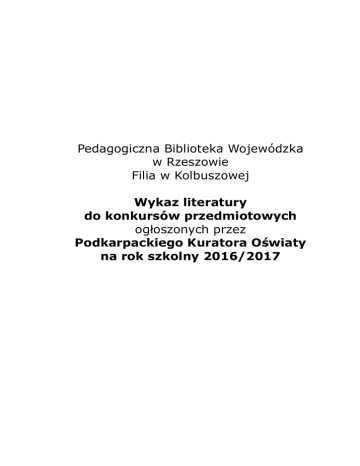 Pedagogiczna Biblioteka Wojewódzka w Rzeszowie Filia w Kolbuszowej Wykaz literatury do konkursów przedmiotowych ogłoszonych przez Podkarpackiego Kuratora Oświaty na rok szkolny 2016/2017 SZKOŁA PODSTAWOWA HISTORIA Literatura etap I: Encyklopedia szkolna. Historia; Wydawnictwo Szkolne i Pedagogiczne, Warszawa, 2004 Sygn. BKWyp 48192, BKCzy 48191 Atlas historyczny : od starożytności do współczesności : szkoła podstawowa, red. i oprac. Izabela Hajkiewicz; "Nowa Era", Warszawa, 2012 Sygn. BKWyp 48808 J. Sikorski, Zarys historii wojskowości powszechnej do końca XIX wieku; Ministerstwo Obrony Narodowej, Warszawa, 1975 Sygn. BKWyp 22210 Literatura etap II: Encyklopedia szkolna. Historia; Wydawnictwo Szkolne i Pedagogiczne, Warszawa, 2004 Sygn. BKWyp 48192, BKCzy 48191 Ilustrowany atlas historii Polski, red. Witold Sienkiewicz; "Demart", Warszawa, 2007 Sygn. BKWyp 48194, BKCzy 48193 Atlas historyczny : od starożytności do współczesności : szkoła podstawowa, red. i oprac. Izabela Hajkiewicz; "Nowa Era", Warszawa, 2012 Sygn. BKWyp 48808 J.Sikorski, Zarys historii wojskowości powszechnej do końca XIX wieku; Ministerstwo Obrony Narodowej, Warszawa, 1975 Sygn. BKWyp 22210 Literatura etap III: Encyklopedia szkolna. Historia; Wydawnictwo Szkolne i Pedagogiczne, Warszawa, 2004 Sygn. BKWyp 48192, BKCzy 48191 Ilustrowany atlas historii Polski, red. Witold Sienkiewicz; "Demart", Warszawa, 2007 Sygn. BKWyp 48194, BKCzy 48193 Atlas historyczny : od starożytności do współczesności : szkoła podstawowa, red. i oprac. Izabela Hajkiewicz; "Nowa Era", Warszawa, 2012 Sygn. BKWyp 48808 JĘZYK ANGIELSKI LITERATURA Przykładowe źródła internetowe: http://learnenglish.britishcouncil.org/en http://alldownunder.com/index.html http://projectbritain.com/ JĘZYK POLSKI Literatura Etap szkolny H.Ch. Andersen, Nowe szaty cesarza, Brzydkie kaczątko, [w:] tegoż, Baśnie, [red. Marek Gumkowski, Mirosława Łątkowska]; "Siedmioróg", Wrocław, 2012 BKWyp 48790 H.Ch. Andersen, Nowe szaty cesarza, Brzydkie kaczątko, [w:] tegoż, Baśnie, tł. Stefania Beylin, Jarosław Iwaszkiewicz; Państwowy Instytut Wydawniczy, Warszawa, 1971 BKWyp 19615 H.Ch. Andersen, Nowe szaty cesarza, Brzydkie kaczątko, [w:] tegoż, Baśnie. T. 1, tł. Stefania Beylin, Stanisław Sawicki, Jarosław Iwaszkiewicz; Państwowy Instytut Wydawniczy, Warszawa, 1956 BKWyp 2910 L.F.Baum, Czarnoksiężnik z krainy Oz, przeł. S. Wortman; „Foksal”, Warszawa, 2014 BKWyp 49841 A. Fredro, Chciwość osła (Osiołkowi w żłoby dano…), Paweł i Gaweł, [w:] tegoż, Najpiękniejsze bajki dla dzieci; Zielona Sowa, Kraków, 2008 BKWyp 49848 J. Kochanowski, Na zdrowie, Na lipę, [w:] tegoż, Dzieła polskie, oprac. Julian Krzyżanowski; Państwowy Instytut Wydawniczy , Warszawa, 1960 BKWyp 5222 J. Kochanowski, Na zdrowie, Na lipę, [w:] tegoż, Dzieła polskie, oprac. Julian Krzyżanowski; Państwowy Instytut Wydawniczy, Warszawa, 1978 BKWyp 26614 J. Kochanowski, Na zdrowie, Na lipę, [w:] tegoż, Dzieła polskie. T. 1, oprac. Julian Krzyżanowski; Państwowy Instytut Wydawniczy, Warszawa, 1976 BKCzy 22579 J. Kochanowski, Na zdrowie, Na lipę, [w:] tegoż, Fraszki ; Pieśni ; Treny, oprac. Wojciech Rzehak; Greg, "Kraków, 2010 BKWyp 48213, BKWyp 48214, BKWyp 48215 I. Krasicki, Szczur i kot, Kruk i lis, Przyjaciele, Żółw i mysz, [w:] tegoż, Bajki, oprac. Zbigniew Goliński; Zakład Narodowy im. Ossolińskich, Kraków, 1975 BKWyp 21118, BKWyp 21638 I. Krasicki, Szczur i kot, Kruk i lis, Przyjaciele, Żółw i mysz, [w:] tegoż, Bajki : wybór, wstęp i wybór Zdzisław Libera; Państwowy Instytut Wydawniczy, Warszawa, 1970 BKWyp 14881 I. Krasicki, Szczur i kot, Kruk i lis, Przyjaciele, Żółw i mysz, [w:] tegoż, Bajki, przypowieści, satyry, [oprac. graf.] Mirosław Pokora; Krajowa Agencja Wydawnicza, Rzeszów, 1986 BKWyp 38313 I. Krasicki, Szczur i kot, Kruk i lis, Przyjaciele, Żółw i mysz, [w:] tegoż, Dzieła wybrane. T. 1, oprac. Zbigniew Goliński; Państwowy Instytut Wydawniczy, Warszawa, 1989 BKCzy 41763 Etap rejonowy Literatura H. Ch. Andersen, Królowa Śniegu, [w:] tegoż, Baśnie, [red. Marek Gumkowski, Mirosława Łątkowska]; "Siedmioróg", Wrocław, 2012 BKWyp 48790 H. Ch. Andersen, Królowa Śniegu, [w:] tegoż, Baśnie, tł. Stefania Beylin, Jarosław Iwaszkiewicz; Państwowy Instytut Wydawniczy, Warszawa, 1971 BKWyp 19615 H. Ch. Andersen, Królowa Śniegu, [w:] tegoż, Baśnie. T. 1, tł. Stefania Beylin, Stanisław Sawicki, Jarosław Iwaszkiewicz; Państwowy Instytut Wydawniczy, Warszawa, 1956 BKWyp 2910 F. H. B urnett, tł. Jadwiga Włodarkiewicz ; oprac. Barbara Włodarczyk ; il. Jolanta Adamus-Ludwikowska, Tajemniczy ogród; "Greg", Kraków, cop. 2008 BKWyp 46930 L. Carrol, Alicja w Krainie Czarów, przeł. M. Morawska; „Siedmioróg”, Wrocław, 2014 BKWyp 49838 Z. Herbert, Pudełko zwane wyobraźnią, [w:] tegoż, Wiersze zebrane, oprac. edytorskie Ryszard Krynicki; "a5", Kraków, 2008 BKWyp 46906 Z. Herbert, Pudełko zwane wyobraźnią, [w:] tegoż , Wiersze zebrane, oprac. edytorskie Ryszard Krynicki; "a5", Kraków, 2008 BKWyp 47257, BKCzy 47256 Z. Herbert, Pudełko zwane wyobraźnią, [w:] tegoż, Wiersze zebrane; "Czytelnik", Warszawa,1982 BKWyp 34152 Z. Herbert, Pudełko zwane wyobraźnią, [w:] tegoż, Wybór poezji ; Dramaty"; Czytelnik", Warszawa, 1973 BKWyp 19414 Etap wojewódzki Literatura C. S. Lewis, ; przeł. [z ang.] Andrzej Polkowski ; il. Pauline Baynes ,Lew, Czarownica i stara szafa; "Media Rodzina", Poznań, cop. 2005 BKWyp 46764 J. Parandowski, Tułaczka Odyseusza, [w:] tegoż, Mitologia : wierzenia i podania Greków i Rzymian; "Puls", Londyn, 1992 BKWyp 47155 J. Parandowski, Tułaczka Odyseusza, [w:] tegoż, Mitologia : wierzenia i podania Greków i Rzymian; "Czytelnik", Warszawa, 1965 BKWyp 8509 J. Parandowski, Tułaczka Odyseusza, [w:] tegoż, Mitologia : wierzenia i podania Greków i Rzymian; "Czytelnik", Warszawa, 1972 BKWyp 17131 J. Parandowski, Tułaczka Odyseusza, [w:] tegoż, 