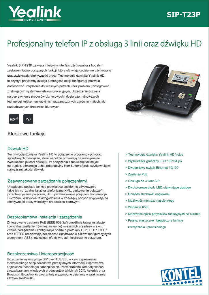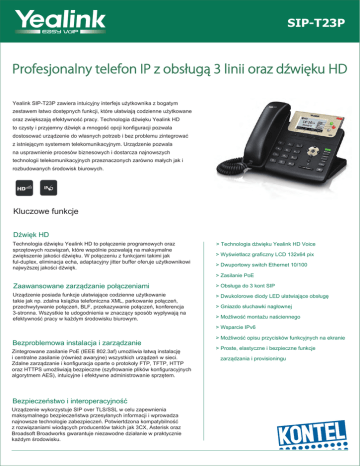 SIP-T23P Profesjonalny telefon IP z obsługą 3 linii oraz dźwięku HD Yealink SIP-T23P zawiera intuicyjny interfejs użytkownika z bogatym zestawem łatwo dostępnych funkcji, które ułatwiają codzienne użytkowane oraz zwiększają efektywność pracy. Technologia dźwięku Yealink HD to czysty i przyjemny dźwięk a mnogość opcji konfiguracji pozwala dostosować urządzenie do własnych potrzeb i bez problemu zintegrować z istniejącym systemem telekomunikacyjnym. Urządzenie pozwala na usprawnienie procesów biznesowych i dostarcza najnowszych technologii telekomunikacyjnych przeznaczonych zarówno małych jak i rozbudowanych środowisk biurowych. Kluczowe funkcje Dźwięk HD Technologia dźwięku Yealink HD to połączenie programowych oraz sprzętowych rozwiązań, które wspólnie pozwalają na maksymalne zwiększenie jakości dźwięku. W połączeniu z funkcjami takimi jak ful-duplex, eliminacja echa, adaptacyjny jitter buffer oferuje użytkownikowi najwyższej jakości dźwięk. > Technologia dźwięku Yealink HD Voice > Wyświetlacz graficzny LCD 132x64 pix > Dwuportowy switch Ethernet 10/100 > Zasilanie PoE Zaawansowane zarządzanie połączeniami > Obsługa do 3 kont SIP Urządzenie posiada funkcje ułatwiające codzienne użytkowanie takie jak np. zdalna książka telefoniczna XML, parkowanie połączeń, przechwytywanie połączeń, BLF, przekazywanie połączeń, konferencja 3-stronna. Wszystkie te udogodnienia w znaczący sposób wypływają na efektywność pracy w każdym środowisku biurowym. > Dwukolorowe diody LED ułatwiające obsługę > Gniazdo słuchawki nagłownej > Możliwość montażu naściennego > Wsparcie IPv6 Bezproblemowa instalacja i zarządzanie Zintegrowane zasilanie PoE (IEEE 802.3af) umożliwia łatwą instalację i centralne zasilanie (również awaryjne) wszystkich urządzeń w sieci. Zdalne zarządzanie i konfiguracja oparte o protokoły FTP, TFTP, HTTP oraz HTTPS umożliwiają bezpieczne (szyfrowanie plików konfiguracyjnych algorytmem AES), intuicyjne i efektywne administrowanie sprzętem. Bezpieczeństwo i interoperacyjność Urządzenie wykorzystuje SIP over TLS/SSL w celu zapewnienia maksymalnego bezpieczeństwa przesyłanych informacji i wprowadza najnowsze technologie zabezpieczeń. Potwiertdzona kompatybilność z rozwiązaniami wiodących producentów takich jak 3CX, Asterisk oraz Broadsoft Broadworks gwarantuje niezawodne działanie w praktycznie każdym środowisku. > Możliwość opisu przycisków funkcyjnych na ekranie > Proste, elastyczne i bezpieczne funkcje zarządzania i provisioningu Specyfikacja SIP-T23G Funkcje audio Wyświetlacz i wskaźniki Sieć i bezpieczeństwo > Dźwięk HD: słuchawka HD, głośnik HD > 132x64-pixeli wyświetlacz graficzny LCD > SIP v1 (RFC2543), v2 (RFC3261) > Wideband codec: G.722 > Wskaźniki LED dla połączenia i wiadomości > Call server redundancy supported > Narrowband codec: G.711(A/μ), G.729AB,G.726, iLBC > Dwukolorowe (czerwony lub zielony) podświetlanie > NAT poprzeczne: tryb STUN > DTMF: In-band, Out-of-band (RFC 2833) i SIP INFO LED dla informacji o statusie lini > Proxy mode i peer-to-peer w trybie SIP > Full-duplex hands-free speakerphone with AEC > Intuicyjny interfejs użytkownika z ikonami i klawiszami > IP assignment: static/DHCP > VAD, CNG, AEC, PLC, AJB, AGC > Wybór języka > HTTP/HTTPS web server > ID dzwoniącego, nazwisko i numer > Synchronizacja czasu i daty za pomocą > 3 konta SIP Przyciski > UDP/TCP/DNS-SRV(RFC 3263) > Zawieszanie, wyciszanie, DND > 3 przyciski dla lini z dwukolorową diodą LED > QoS: 802.1p/Q tagging (VLAN), Layer 3 ToS > One-touch speed dial, hotline > 5 przycisków: wiadomość, zestaw słuchawkowy, Funkcje telefonu > Przekazywanie połączeń, połączenia protokołu SNTP transfer,ponowne wybieranie, zestaw głosnomówiacy DSCP > SRTP na głos > 6 przycisków nawigacji > Transport Layer Security (TLS) > Przyciski zmiany głośności > Menedżer certyfikatów HTTPS > Lokalna konferencja 3-stronna Interface > Uwierzytelnianie szyfrowania za pomocą > Bezpośrednie połączenia IP bez SIP proxy > 2xRJ45 10/100M Ethernet ports oczekujące, transferowanie połączenia > Group listening, SMS > AES szyfrowania pliku konfiguracyjnego > Powtórz, oddzwanianie, auto odpowiedź > Wybór dzwonka / import / usuń > Ustawienia czasu automatyczne lub ręczne > Dial plan, off hook hot line > Przeglądarka XML, a ction URL/URI > Zintegrowane zrzuty ekranu > RTCP-XR Książka telefoniczna > Lokalna książka telefoniczna do 1000 wpisów > Czarna lista > Zdalna książka XML/LDAP > Wygodne wyszukiwanie kontaktu > Szukaj w książce telefonicznej / import / eksport > Power over Ethernet (IEEE 802.3af), class 2 > 1xRJ9 (4P4C) handset port > 1xRJ9 (4P4C) headset port Pozostałe cechy zewnętrzene > Montaż naścienny > Zasilanie universalne AC adapter (opcjonalnie): AC 100~240V wejście i DC 5V/600mA wyjscie > Pobór prądu (PSU): 0.84-1.4W > Pobór prądu (PoE): 1.28-1.82W > Wymairy(W*D*H*T): 209mm*188mm*150mm*41mm > Wilgotność otoczenia: 10~95% > Historia połączeń > Temperatura otoczenia: -10~50°C Funkcje IP-PBX Zarządzanie > Zajętość linii (BLF) > Konfiguracja: przeglądarka / telefon / auto-provision > Bridged Line Apperance(BLA) > Auto provision przez FTP/TFTP/HTTP/HTTPS > Anonimowe połączenie, odrzucanie poł. anonimowych MD5/MD5-sess > OpenVPN, IEEE802.1X > IPv6 Opakowanie > Qty/CTN: 10 PCS > N.W/CTN: 11.8 kg > G.W/CTN: 13.0 kg > Wymiary pudełka: 220mm*241mm*105mm > Wymiary kartonu: 560mm*460mm*250mm Certyfikaty REACH dla wdrożeń masowych > Hot-desking, połacznienia alarmowe > Auto-provision z PnP > Wskaźnik oczekującej wiadomości (MWI) > Zero-sp-touch > Poczta głosowa, call park, call pickup > Ochrona hasłem danych personalnych > Intercom, paging, muzuka dla oczekującego połączenia > Ustawienia fabryczne, restart > Zakończenie połączeń, nagrywanie rozmów > Śledzenie pakietów danych, dziennik systemowy Dowiedz się więcej Wię