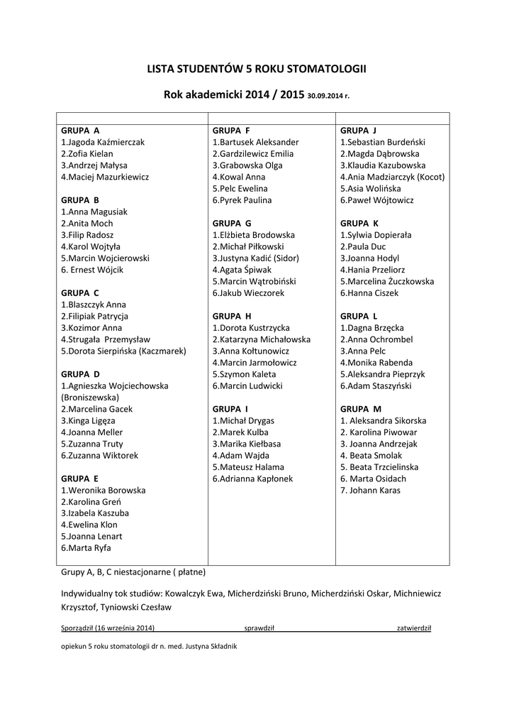 LISTA STUDENTÓW 5 ROKU STOMATOLOGII Rok akademicki 2014 / 2015 30.09.2014 r. GRUPA A 1.Jagoda Kaźmierczak 2.Zofia Kielan 3.Andrzej Małysa 4.Maciej Mazurkiewicz GRUPA B 1.Anna Magusiak 2.Anita Moch 3.Filip Radosz 4.Karol Wojtyła 5.Marcin Wojcierowski 6. Ernest Wójcik GRUPA C 1.Blaszczyk Anna 2.Filipiak Patrycja 3.Kozimor Anna 4.Strugała Przemysław 5.Dorota Sierpińska (Kaczmarek) GRUPA D 1.Agnieszka Wojciechowska (Broniszewska) 2.Marcelina Gacek 3.Kinga Ligęza 4.Joanna Meller 5.Zuzanna Truty 6.Zuzanna Wiktorek GRUPA E 1.Weronika Borowska 2.Karolina Greń 3.Izabela Kaszuba 4.Ewelina Klon 5.Joanna Lenart 6.Marta Ryfa GRUPA F 1.Bartusek Aleksander 2.Gardzilewicz Emilia 3.Grabowska Olga 4.Kowal Anna 5.Pelc Ewelina 6.Pyrek Paulina GRUPA J 1.Sebastian Burdeński 2.Magda Dąbrowska 3.Klaudia Kazubowska 4.Ania Madziarczyk (Kocot) 5.Asia Wolińska 6.Paweł Wójtowicz GRUPA G 1.Elżbieta Brodowska 2.Michał Piłkowski 3.Justyna Kadić (Sidor) 4.Agata Śpiwak 5.Marcin Wątrobiński 6.Jakub Wieczorek GRUPA K 1.Sylwia Dopierała 2.Paula Duc 3.Joanna Hodyl 4.Hania Przeliorz 5.Marcelina Żuczkowska 6.Hanna Ciszek GRUPA H 1.Dorota Kustrzycka 2.Katarzyna Michałowska 3.Anna Kołtunowicz 4.Marcin Jarmołowicz 5.Szymon Kaleta 6.Marcin Ludwicki GRUPA L 1.Dagna Brzęcka 2.Anna Ochrombel 3.Anna Pelc 4.Monika Rabenda 5.Aleksandra Pieprzyk 6.Adam Staszyński GRUPA I 1.Michał Drygas 2.Marek Kulba 3.Marika Kiełbasa 4.Adam Wajda 5.Mateusz Halama 6.Adrianna Kapłonek GRUPA M 1. Aleksandra Sikorska 2. Karolina Piwowar 3. Joanna Andrzejak 4. Beata Smolak 5. Beata Trzcielinska 6. Marta Osidach 7. Johann Karas Grupy A, B, C niestacjonarne ( płatne) Indywidualny tok studiów: Kowalczyk Ewa, Micherdziński Bruno, Micherdziński Oskar, Michniewicz Krzysztof, Tyniowski Czesław Sporządził (16 września 2014) opiekun 5 roku stomatologii dr n. med. Justyna Składnik sprawdził zatwierdził [email protected]