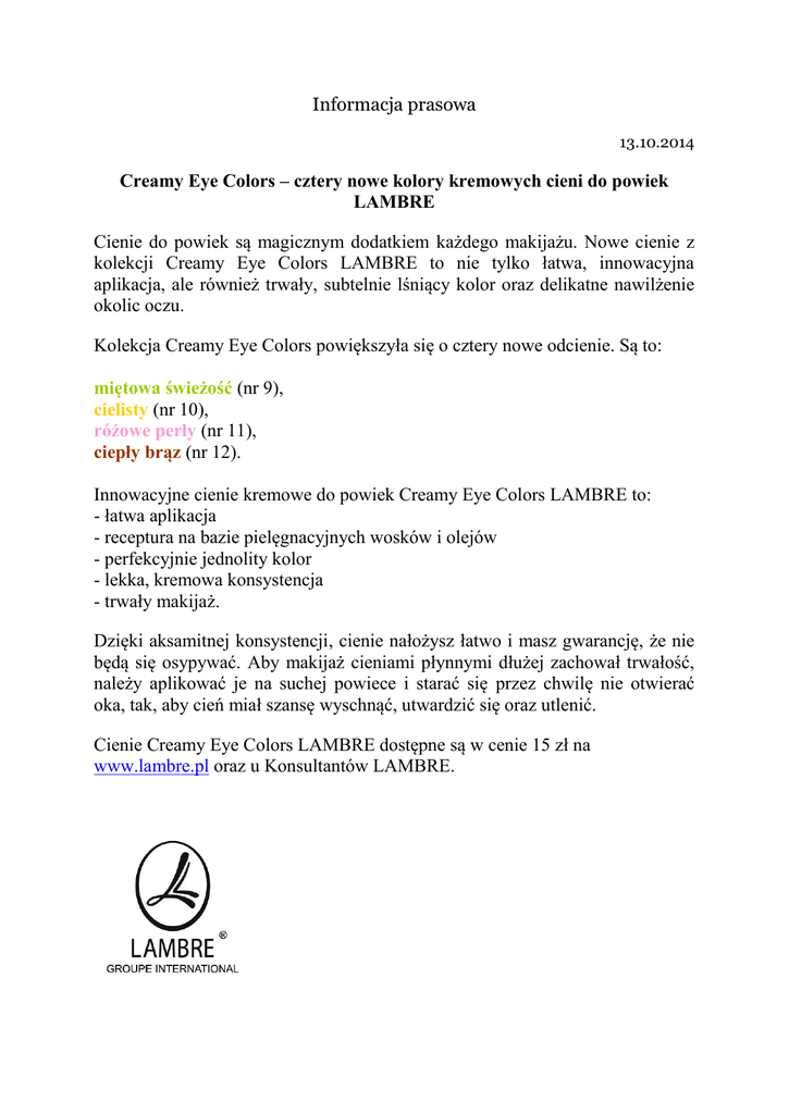 Informacja prasowa 13.10.2014 Creamy Eye Colors – cztery nowe kolory kremowych cieni do powiek LAMBRE Cienie do powiek są magicznym dodatkiem każdego makijażu. Nowe cienie z kolekcji Creamy Eye Colors LAMBRE to nie tylko łatwa, innowacyjna aplikacja, ale również trwały, subtelnie lśniący kolor oraz delikatne nawilżenie okolic oczu. Kolekcja Creamy Eye Colors powiększyła się o cztery nowe odcienie. Są to: miętowa świeżość (nr 9), cielisty (nr 10), różowe perły (nr 11), ciepły brąz (nr 12). Innowacyjne cienie kremowe do powiek Creamy Eye Colors LAMBRE to: - łatwa aplikacja - receptura na bazie pielęgnacyjnych wosków i olejów - perfekcyjnie jednolity kolor - lekka, kremowa konsystencja - trwały makijaż. Dzięki aksamitnej konsystencji, cienie nałożysz łatwo i masz gwarancję, że nie będą się osypywać. Aby makijaż cieniami płynnymi dłużej zachował trwałość, należy aplikować je na suchej powiece i starać się przez chwilę nie otwierać oka, tak, aby cień miał szansę wyschnąć, utwardzić się oraz utlenić. Cienie Creamy Eye Colors LAMBRE dostępne są w cenie 15 zł na www.lambre.pl oraz u Konsultantów LAMBRE.