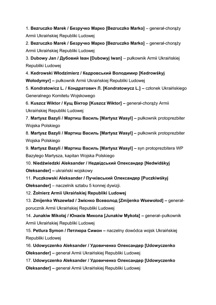 1. Bezruczko Marek / Безручко Марко [Bezruczko Marko] – generał-chorąży Armii Ukraińskiej Republiki Ludowej 2. Bezruczko Marek / Безручко Марко [Bezruczko Marko] – generał-chorąży Armii Ukraińskiej Republiki Ludowej 3. Dubowy Jan / Дубовий Іван [Dubowyj Iwan] – pułkownik Armii Ukraińskiej Republiki Ludowej 4. Kedrowski Włodzimierz / Кедровський Володимир [Kedrowśkyj Wołodymyr] – pułkownik Armii Ukraińskiej Republiki Ludowej 5. Kondratowicz L. / Кондратович Л. [Kondratowycz L.] – członek Ukraińskiego Generalnego Komitetu Wojskowego 6. Kuszcz Wiktor / Кущ Віктор [Kuszcz Wiktor] – generał-chorąży Armii Ukraińskiej Republiki Ludowej 7. Martysz Bazyli / Мартиш Василь [Martysz Wasyl] – pułkownik protoprezbiter Wojska Polskiego 8. Martysz Bazyli / Мартиш Василь [Martysz Wasyl] – pułkownik protoprezbiter Wojska Polskiego 9. Martysz Bazyli / Мартиш Василь [Martysz Wasyl] – syn protoprezbitera WP Bazylego Martysza, kapitan Wojska Polskiego 10. Niedźwiedzki Aleksander / Недвідський Олександер [Nedwidśkyj Ołeksander] – ukraiński wojskowy 11. Puczkowski Aleksander / Пучківський Олександер [Puczkiwśkyj Ołeksander] – naczelnik sztabu 5 konnej dywizji. 12. Żołnierz Armii Ukraińskiej Republiki Ludowej 13. Zmijenko Wszewład / Змієнко Всеволод [Zmijenko Wsewołod] – generałporucznik Armii Ukraińskiej Republiki Ludowej 14. Junakiw Mikołaj / Юнаків Микола [Junakiw Mykoła] – generał–pułkownik Armii Ukraińskiej Republiki Ludowej 15. Petlura Symon / Петлюра Симон – naczelny dowódca wojsk Ukraińskiej Republiki Ludowej 16. Udowyczenko Aleksander / Удовиченко Олександер [Udowyczenko Ołeksander] – generał Armii Ukraińskiej Republiki Ludowej 17. Udowyczenko Aleksander / Удовиченко Олександер [Udowyczenko Ołeksander] – generał Armii Ukraińskiej Republiki Ludowej 18. Zahrodski Aleksander / Загродський Олександер [Zahrodśkyj Ołeksander] – półkownik-generał armii Ukraińskiej Republiki Ludowej 19. Tiutiunnyk Jerzy / Тютюнник Юрій [Tiutiunnyk Jurij] – generał-chorąży Armii Ukraińskiej Republiki Ludowej 20. Myszkowski Eugeniusz / Мишківський Євген [Myszkiwśkyj Jewhen] – ukraiński generał, szef Sztabu Ukraińskiej Armii Halickiej 21. Sawczenko-Bilski Włodzimierz / Савченко-Більський Володимир [Sawczenko–Bilśkyj Wołodymyr] – admirał Floty Czarnomorskiej 22. Salski Włodzimierz / Сальський Володимир [Salśkyj Wołodymyr] – generał–chorąży armii Ukraińskiej Republiki Ludowej 23. Sinkler Włodzimierz / Сінклер Володимир [Sinkłer Wołodymyr] – generał Armii Ukraińskiej Republiki Ludowej 24. Kapuściański Mikołaj / Капустянський Микола [Kapustianśkyj Mykoła] – generał Armii Ukraińskiej Republiki Ludowej 25. Sadowski Michał / Садовський Михайло [Sadowśkyj Myhajło] – generał Armii Ukraińskiej Republiki Ludowej 26. Daszkiewicz Stefan / Дашкевич Cтепан [Daszkewycz Stepan] – działacz Towarzystwa Ukraińskich Strzelców Siczowych 27. Stefanów Ignacy / Стефанів Гнат [Stefaniw Hnat] – pułkownik Armii Ukraińskiej Republiki Ludowej 28. Tarnawski Miron / Тарнавський Мирон [Tarnawśkyj Myron] – generał-czetar Ukraińskiej Halickiej Armii 29. Grynków Aleksander / Гриньків Олександер [Hryńkiw Ołeksander] – generał Armii Ukraińskiej Republiki Ludowej 30. Witowski Dymitr / Вітовський Дмитро [Witowśkyj Dmytro] – dowódca Ukraińskiej Armii Halickiej 31. Omelanowicz-Pawłenko Michał / Омелянович-Павленко Михайло [Omelanowycz-Pawłenko Myhajło] – generał Armii Ukraińskiej Republiki Ludowej 32. Kossak Grzegorz / Коссак Гриць [Kossak Hryć] – pułkownik Ukraińskiej Halickiej Armii 33. Horuk Szczepan / Горук Семен [Horuk Semen] – ukraiński dziennikarz, oficer Legionu Ukraińskich Strzelców Siczowych i Ukraińskiej Armii Halickiej 34. Kurmanowicz Wiktor / Курманович Віктор [Kurmanowycz Wiktor] – generał Ukraińskiej Halickiej Armii 35. Mikita Józef / Микита Йосип [Mykyta Josyp] – generał Armii Ukraińskiej Republiki Ludowej 36. Skoropacki Paweł / Скоропадський Павло [Skoropadśkyj Pawło – generał Armii Ukraińskiej Republiki Ludowej 37. Ukraiński żołnierz internowany w obozie w Łańcucie 38. Ukraiński żołnierz internowany w obozie w Łańcucie 39. Ukraiński żołnierz internowany w obozie w Łańcucie 40. Starożuk Jan / Старожук Іван [Starożuk Iwan] – oficer oświatowy Armii Ukraińskiej Republiki Ludowej 41. Starożuk Jan / Старожук Іван [Starożuk Iwan] – oficer oświatowy Armii Ukraińskiej Republiki Ludowej 42. Chłopicki Sergiusz / Хлопицький Сергій [Chłopyćkyj Serhij] – chorąży Armii Ukraińskiej Republiki Ludowej 43. Chłopicki Sergiusz / Хлопицький Сергій [Chłopyćkyj Serhij] – chorąży Armii Ukraińskiej Republiki Ludowej 44. Halczewski-Wojnarowski Jakub / Гальчевський-Войнаровський Яків [Halczewśkyj-Wojnarowśkyj Jakiw] – pułkownik Armii Ukraińskiej Republiki Ludowej 45. Otmarsztajn Jerzy / Отмарштайн Юрій [Otmarsztajn Jurij] – pułkownik Armii Ukraińskiej Republiki Ludowej 46. Poduszko Zenobiusz / Подушко Зіновій [Poduszko Zinowij] – oficer Armii Ukraińskiej Republiki Ludowej 47. Diadiusza Sergiusz / Дядюша Сергій [Diadiusza Sehij] – generał-porucznik Armii Ukraińskiej Republiki Radzieckiej 48. Dain Aleksander / Дайн Олександер [Dajn Ołeksander] – p
