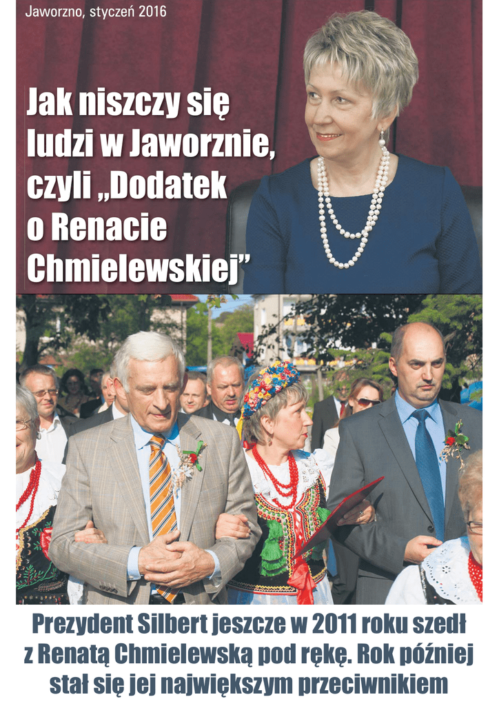 Jaworzno, styczeń 2016 -DNQLV]F]\VLę ludzi w Jaworznie, czyli „Dodatek o Renacie &KPLHOHZVNLHMµ 3UH]\GHQW6LOEHUWMHV]F]HZURNXV]HGã ]5HQDWċ&KPLHOHZVNċSRGUęNę5RNSyŭQLHM VWDãVLęMHMQDMZLęNV]\PSU]HFLZQLNLHP 'RGDWHNR5HQDFLH&KPLHOHZVNLHM III Łatwo to wszystko znaleźć na jaw.pl pod hasłem: „Rozłam w Radzie Miejskiej”. Przed samą sesją ze strony członków klubów radnych JMM i PiS usłyszałam dużo gorzkich słów i sugestię, aby się wycofać z niewygodnego dla zarządzających miastem projektu uchwały. Dano mi do zrozumienia, że albo się wycofam, albo w najbliższym czasie moja działalność w radzie będzie poza PiS-em. Otrzymałam również telefon od ówczesnego przewodniczącego PiS w Jaworznie z informacją, że muszę zrezygnować ze złożonej uchwały. Rano, przed sesją, mieliśmy jako pomysłodawcy odpowiedzieć, czy zmieniamy zdanie, ale cała trójka radnych nie wycofała się ze złożonego projektu, tylko wręczyła następujące rezygnacje: ja z Klubu PiS, Mariusz Burczy i Janusz Ciołczyk z klubu JMM. Zostaliśmy bowiem wierni zarówno swoim przekonaniom, jak wnioskodawcom z Jaworznickiej Przyjaźni. Moje poważne kłopoty zaczęły się od 1 października 2012 r., kiedy zostałam przeniesiona przez dyrektora MCKiS z Domu Kultury w Jeleniu do Klubu Niko na okres 3 miesięcy, a później na następne 3 miesiące. Od 1 stycznia 2013 roku do 30 marca 2013 zarządzałam Klubem Niko i Domem Kultury bez dodatkowego wynagrodzenia. Przez te lata ataki na mnie po- Zły podsunął taki pomysł radnym Rady Miejskiej”. „...Moim zdaniem tylko zły, szatan mógł podpowiedzieć komuś takie propozycje”. „ Wiosną 2012 r. trzyosobowa grupa radnych wniosła projekt uchwały popierającej wejście na multipleks dla telewizji TRWAM. Pisma z takimi żądaniami wpłynęły wcześniej do radnego Mariusza Burczego. Napisane były przez Jaworznicką Przyjaźń i osoby prywatne do mnie jako radnej. Ten projekt uchwały został wprowadzony na sesji w kwietniu 2012 r. przeze mnie, Mariusza Burczego i Janusza Ciołczyka. Nie spodobało się to Silbertowi i w wypowiedzi do lokalnej telewizji stwierdził: :REURQLH WHOHZL]ML TRWAM średnio brał na plecy Mirek Ciołczyk, który wielokrotnie rozmawiał ze mną i mówił, jakie są naciski prezydenta i że musi bronić mnie i Janusza, ale musi też wykonywać polecenia Silberta. Mówił, że radny nie powinien pracować w zakładzie podległym pod prezydenta, bo nie może pilnować interesów gminy. Mirek Ciołczyk zawsze trak- tował mnie – Renatę Chmielewska – jako pracownika Domu Kultury i z tego mnie rozliczał, a nie patrzył i nie rozliczał mnie jako radnej opozycji. Brałam udział w wielu spotkaniach, na których rozmawiano na temat tworzenia strategii kultury dla Jaworzna Grupowe zdjęcie na zakończenie III Artystycznego Festiwalu Przedszkolnego organizowanego również przez nas Grupowe zdjęcie na zakończenie III Miejskiego Festiwalu Jaworznickich Zespołów Ludowych organizowanego przez nas Od 1 czerwca 2005 r roku zostałam zatrudniona jako pracownik w Miejskim Centrum Kultury i Sportu na stanowisku kierownik na obiektach MCKiS Jaworzno, z zakresem obowiązków kierownika Domu Kultury w Jeleniu. Pracę swą wykonywałam sumiennie i bardzo starannie. Zgodnie z zakresem czynności, zarządzeniami i poleceniami przełożonych: Dyrektora Mariana Milera, następnie Mirosława Ciołczyka, zast. dyrektora ds. Kultury Czesława Żelichowskiego, Marty Grzybowskiej i Marty Tesarczyk czy koordynatora ds. kultury Marty Grzybowskiej. Moja praca to planowanie i sprawozdawczość z zakresu organizacji imprez kulturalnych, nadzór nad pracą merytoryczną instruktorów i kierownika oraz kontrola każdej działalności. Prowadzenie zajęć, dokumentacji (dzienniki) przez kierownika i instruktorów, pokaz umiejętności dzieci i młodzieży na różnych uroczystościach organizowanych na scenie Domu Kultury dla środowiska lokalnego. Organizacja imprez kulturalnych była systematycznie kontrolowana przez Martę Grzybowską i zawsze słyszałam pozytywne opinie. Zgodnie z obowiązującymi terminami wszystkie plany i sprawozdania Domu Kultury wysyłane były pocztą e-mail w terminie. Wszystkie pisemne informacje tematyczne „na już” i sprawozdanie roczne oraz opisowe do animatora dostarczane były na czas i opracowane na odpowiednim poziomie. W trakcie wykonywanie obowiązków czy organizowaniu pracy placówki na bieżąco wsłuchiwałam się w opinie osób korzystających z zajęć, jak również osób zgłaszających pomysły, np. na zajęcia baletowe, jujitsu, gimnastyka dla seniora, zabawy taneczne dla dorosłych, białe soboty – badania dla seniorów i inne. Systematycznie, za zgodą dyrektora, wprowadzałam te pomysły do realizacji i urozmaicałam działalność placówki kulturalnej. Współpracując przy tym z różnymi organizacjami pozarządowymi i stowarzyszeniami jak: Stowarzyszenie Twórców Kultury w Jaworznie (prelekcje, wystawy, wieczorki literackie i jarmarki artystyczne), Stowarzyszenie Amazonek (prelekcje zdrowotne), Stowarzyszeniem Diabetyków – organizacja Białych Sobót i badań dla mieszkańców, Związkiem Emerytów, Rencistów i Inwalidów Koło w Jeleniu, Związek Wędkarstwa Polskiego Koło 94 w Jeleniu przy organizacji wakacyjnych zajęć dla dzieci i młodzieży na zbiorniku wodnym Grajdołek, Filią Biblioteki Miejskiej w Jeleniu, Uniwersytetem Trzeciego Wieku (wystawy, spektakle teatralne, prelekcje), Parafią Św. Krzyża w Jeleniu $QLHFR ZF]HœQLHM Na bieżąco zgłaszałam usterki, konieczność koszenie trawy, malowanie, czyszczenie rynien z liści, wymianę oświetlenia na zewnątrz, potrzeby remontowe, naprawę rynien, i przedstawiałam to kierownikowi obiektów Krzysztofowi Wojtoniowi. 'EDãDPRVWDQ WHFKQLF]Q\LSRU]ċGHN ZEXG\QNX LQD]HZQċWU]²MDN RVZyMZãDVQ\GRP – Festyny Parafialne i 100-lecie Parafii, gdzie w programie był cykl różnych imprez, konkursów i prelekcji 