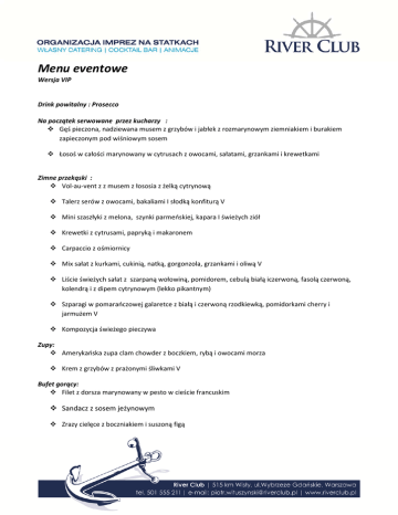 Menu eventowe Wersja VIP Drink powitalny : Prosecco Na początek serwowane przez kucharzy : Gęś pieczona, nadziewana musem z grzybów i jabłek z rozmarynowym ziemniakiem i burakiem zapieczonym pod wiśniowym sosem Łosoś w całości marynowany w cytrusach z owocami, sałatami, grzankami i krewetkami Zimne przekąski : Vol‐au‐vent z z musem z łososia z żelką cytrynową Talerz serów z owocami, bakaliami I słodką konfiturą V Mini szaszłyki z melona, szynki parmeńskiej, kapara I świeżych ziół Krewetki z cytrusami, papryką i makaronem Carpaccio z ośmiornicy Mix sałat z kurkami, cukinią, natką, gorgonzola, grzankami i oliwą V Liście świeżych sałat z szarpaną wołowiną, pomidorem, cebulą białą iczerwoną, fasolą czerwoną, kolendrą i z dipem cytrynowym (lekko pikantnym) Szparagi w pomarańczowej galaretce z białą i czerwoną rzodkiewką, pomidorkami cherry i jarmużem V Kompozycja świeżego pieczywa Zupy: Amerykańska zupa clam chowder z boczkiem, rybą i owocami morza Krem z grzybów z prażonymi śliwkami V Bufet gorący: Filet z dorsza marynowany w pesto w cieście francuskim Sandacz z sosem jeżynowym Zrazy cielęce z boczniakiem i suszoną figą Królik z suszonymi pomidorami, lubczykiem i jałowcem w sosie własnym Dodatki do dań Zapiekane puree ziemniaczano‐pietruszkowe V Biały I dziki ryż smażony z groszkiem V Liście świeżych sałat z vinegrette klasycznym/czosnkowym/miodowo‐pomarańczowym V Bufet słodki Sernik na zimno podany z galaretka malinowa I truskawka Muffinki na słodko z konfiturą owocową Fontanna z białej I ciemnej czekolady , owoce filetowane W każdej wersji do ceny należy doliczyć 10% za osbsługę oraz 8%vat . Minimalna liczba Gości dla powyższego menu to 35 osób. W każdej wersji istnieje możliwość dodania przekąsek koktajlowych serwowanych przez kelnerów razem z drinkiem powitalnym 4szt/os w cenie 30pln. ‐