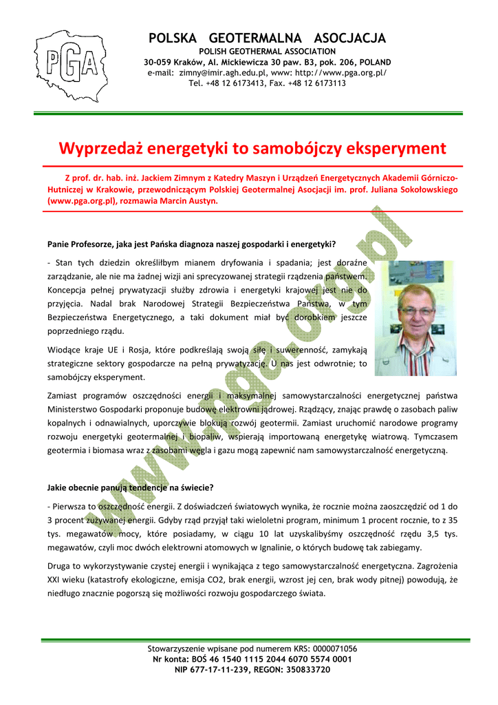 POLSKA GEOTERMALNA ASOCJACJA POLISH GEOTHERMAL ASSOCIATION 30-059 Kraków, Al. Mickiewicza 30 paw. B3, pok. 206, POLAND e-mail: [email protected], www: http://www.pga.org.pl/ Tel. +48 12 6173413, Fax. +48 12 6173113 Wyprzedaż energetyki to samobójczy eksperyment Z prof. dr. hab. inż. Jackiem Zimnym z Katedry Maszyn i Urządzeń Energetycznych Akademii GórniczoHutniczej w Krakowie, przewodniczącym Polskiej Geotermalnej Asocjacji im. prof. Juliana Sokołowskiego (www.pga.org.pl), rozmawia Marcin Austyn. Panie Profesorze, jaka jest Pańska diagnoza naszej gospodarki i energetyki? - Stan tych dziedzin określiłbym mianem dryfowania i spadania; jest doraźne zarządzanie, ale nie ma żadnej wizji ani sprecyzowanej strategii rządzenia państwem. Koncepcja pełnej prywatyzacji służby zdrowia i energetyki krajowej jest nie do przyjęcia. Nadal brak Narodowej Strategii Bezpieczeństwa Państwa, w tym Bezpieczeństwa Energetycznego, a taki dokument miał być dorobkiem jeszcze poprzedniego rządu. Wiodące kraje UE i Rosja, które podkreślają swoją siłę i suwerenność, zamykają strategiczne sektory gospodarcze na pełną prywatyzację. U nas jest odwrotnie; to samobójczy eksperyment. Zamiast programów oszczędności energii i maksymalnej samowystarczalności energetycznej państwa Ministerstwo Gospodarki proponuje budowę elektrowni jądrowej. Rządzący, znając prawdę o zasobach paliw kopalnych i odnawialnych, uporczywie blokują rozwój geotermii. Zamiast uruchomić narodowe programy rozwoju energetyki geotermalnej i biopaliw, wspierają importowaną energetykę wiatrową. Tymczasem geotermia i biomasa wraz z zasobami węgla i gazu mogą zapewnić nam samowystarczalność energetyczną. Jakie obecnie panują tendencje na świecie? - Pierwsza to oszczędność energii. Z doświadczeń światowych wynika, że rocznie można zaoszczędzić od 1 do 3 procent zużywanej energii. Gdyby rząd przyjął taki wieloletni program, minimum 1 procent rocznie, to z 35 tys. megawatów mocy, które posiadamy, w ciągu 10 lat uzyskalibyśmy oszczędność rzędu 3,5 tys. megawatów, czyli moc dwóch elektrowni atomowych w Ignalinie, o których budowę tak zabiegamy. Druga to wykorzystywanie czystej energii i wynikająca z tego samowystarczalność energetyczna. Zagrożenia XXI wieku (katastrofy ekologiczne, emisja CO2, brak energii, wzrost jej cen, brak wody pitnej) powodują, że niedługo znacznie pogorszą się możliwości rozwoju gospodarczego świata. Stowarzyszenie wpisane pod numerem KRS: 0000071056 Nr konta: BOŚ 46 1540 1115 2044 6070 5574 0001 NIP 677-17-11-239, REGON: 350833720 POLSKA GEOTERMALNA ASOCJACJA POLISH GEOTHERMAL ASSOCIATION 30-059 Kraków, Al. Mickiewicza 30 paw. B3, pok. 206, POLAND e-mail: [email protected], www: http://www.pga.org.pl/ Tel. +48 12 6173413, Fax. +48 12 6173113 Jak na te prognozy reagują najbardziej zamożne państwa? - Rządy wielu państw, wykorzystując zaplecze naukowe własnych uczelni, pracują nad krajowymi i międzynarodowymi programami zrównoważonego rozwoju. Projektowane są np. miasta w pełni samowystarczalne energetycznie, tak jest już w USA, Kanadzie i krajach Zatoki Perskiej. Oni zdają sobie sprawę, że narasta światowy problem z ropą i gazem. Stawiają zatem na wodór, wiatr, słońce i geotermię, nie na "czarne złoto", które posiadają. Kopaliny i uran są postrzegane jako "paliwa na wyczerpaniu". W związku z tym w Europie wiele państw zmieniło strategie energetyczne. Niemcy potwierdzili likwidację energetyki atomowej. Państwa te chcą się uniezależnić od paliw kopalnych. Globalnemu trendowi rozwoju zielonej energetyki towarzyszy obligatoryjnie program oszczędności energii. Dlaczego właśnie zielona energia? - Aktualnie 35 procent światowej emisji CO2 pochodzi od przemysłu; 40 proc. to efekt ogrzewania budynków, 25 procent wytwarza transport. Dlatego są już pojazdy hybrydowe, a przyszłością jest wodór uzyskiwany z energii zasobów odnawialnych. Wiodące państwa Europy wnioskują w UE, by urządzenia energetyki odnawialnej były wolne od VAT. W Polsce jest na odwrót; 7 procent VAT na urządzenia "brudnej" energetyki, zaś 22 procent VAT na odnawialne źródła energii. Co należy zrobić, aby ten stan zmienić? - Mądre rządy będą intensywnie rozwijać zieloną energię, bo to konieczność, przyszłość i rozwój. Przyjęty przez nas 15-procentowy udział energii odnawialnej do 2020 roku winien być znacząco zwiększony. Polska ma warunki i powinna być w gronie europejskich liderów w rozwoju energetyki odnawialnej, szczególnie geotermicznej. W UE będą coraz większe nakłady na takie programy. Tłumaczenia, że nas nie stać, są niedorzeczne. Musi nas być stać na bezpieczeństwo, rozwój demograficzny, naukę, zdrowie. Rozwój ekoenergetyki to dla nas narodowa szansa. W UE rozwój nauki i innowacyjność gospodarki są dziś ważniejsze od infrastruktury. Budujemy drogi, zaś państwa zamożne stawiają dziś na strategie regionalne samowystarczalności energetycznej. Przedłożenie energetyki nad infrastrukturę to odważne posunięcie... - Ceny energii będą coraz wyższe. Rosyjski Łukoil od lutego br. wstrzymał dostawy ropy do Niemiec z powodu targów o cenę. Niemcy kupują ropę gdzie indziej. Po podpisaniu umowy o tarczy antyrakietowej w Czechach, Rosja ograniczyła dostawy surowców energetycznych. Wkrótce doświadczymy tego samego. Dlaczego rząd, Stowarzyszenie wpisane pod numerem KRS: 0000071056 Nr konta: BOŚ 46 1540 1115 2044 6070 5574 0001 NIP 677-17-11-239, REGON: 350833720 POLSKA GEOTERMALNA ASOCJACJA POLISH GEOTHERMAL ASSOCIATION 30-059 Kraków, Al. Mickiewicza 30 paw. B3, pok. 206, POLAND e-mail: [email protected], www: http://www.pga.org.pl/ Tel. +48 12 6173413, Fax. +48 12 6173113 wiedząc o tym, nie wykorzystuje własnych możliwości? Przeciwnie, blokuje rozwój energetyki geotermicznej; wstrzymał wzorcowy projekt budowy pierwszej w Polsce elektrociepłowni geoterm