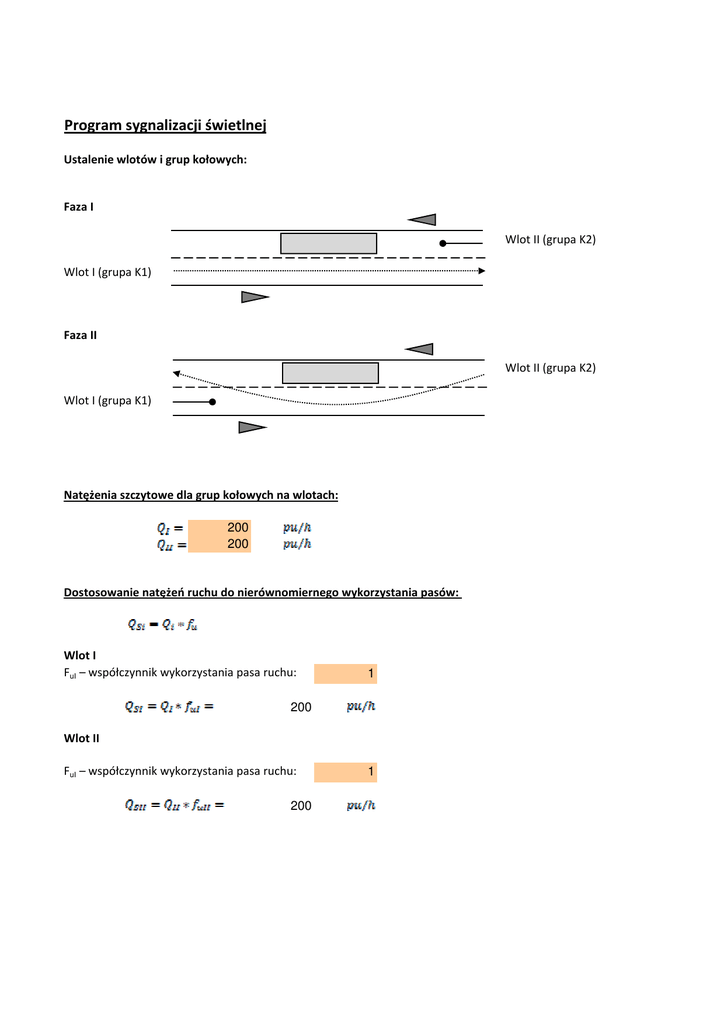 Program sygnalizacji świetlnej Ustalenie wlotów i grup kołowych: Faza I Wlot II (grupa K2) Wlot I (grupa K1) Faza II Wlot II (grupa K2) Wlot I (grupa K1) Natężenia szczytowe dla grup kołowych na wlotach: 200 200 Dostosowanie natężeń ruchu do nierównomiernego wykorzystania pasów: Wlot I FuI – współczynnik wykorzystania pasa ruchu: 1 200 Wlot II FuI – współczynnik wykorzystania pasa ruchu: 200 1 Natężenia nasycenia dla pasów ruchu: S0 – przepustowość wyjściowa pasa ruchu 1900 f0 – współczynnik wpływu lokalizacji 1 Wlot I n – liczba pasów ruchu fw – współczynnik wpływu szerokości pasa ruchu 1 0,88 2,50 m fc – współczynnik wpływu udziału pojazdów ciężkich 0,98 fs – współczynnik wpływu pochylenia wlotu 1 fmp – współczynnik wpływu parkowania 1 fa – współczynnik wpływu blokowania przez autobusy 1 fp – współczynnik korygujący ze względu na skręt w prawo 1 fl – współczynnik korygujący ze względu na skręt w lewo 1 2% 1639 Wlot II n – liczba pasów ruchu fw – współczynnik wpływu szerokości pasa ruchu 1 0,88 2,5 m fc – współczynnik wpływu udziału pojazdów ciężkich 0,98 fs – współczynnik wpływu pochylenia wlotu 1 fmp – współczynnik wpływu parkowania 1 fa – współczynnik wpływu blokowania przez autobusy 1 fp – współczynnik korygujący ze względu na skręt w prawo 1 fl – współczynnik korygujący ze względu na skręt w lewo 1 1639 Stopień nasycenia pasów: Wlot I 0,122 Wlot II 0,122 Nasycenie grupy krytycznej: 2% Faza I 0,122 Faza II 0,122 Suma stopni nasycenia grup krytycznych: 0,244 Czas tracony w cyklu: tm – czas międzyzielony tż – długość sygnału żółtego 3s te – czas ewakuacji td – czas dojazdu do punktu kolizji lp – wartość wydłużenia drogi ewakuacji 15 m se – droga ewakuacji 55 m sd – droga dojazdu 16 m 2 3,5 m/s 30 km/h a - przyspieszenie Vp – prędkość strumienia 8,4 s 3,162278 9s 16 s Długość cyklu Minimalna długość cyklu 21 s = 8,333333 m/s przyjęto do obliczeń: 9s przyjęto do obliczeń: 3s Optymalna długość cyklu 38 s Przyjęta do obliczeń długość cyklu: 40 s Długości świateł zielonych: Faza I 11 Przyjęta długość fazy I: 12 s Faza II 11 Przyjęta długość fazy II: 12 s Ostateczna długość cyklu: 42 s Przepustowość wlotów: GI – długość światła zielonego dla pojazdów w fazie I 12 s GII – długość światła zielonego dla pojazdów w fazie II 12 s 42 s T - długość cyklu Wlot I 468 pu/h Wlot II 468 pu/h Współczynniki obciążenia wlotów: Wlot I 0,427 Wlot II 0,427